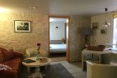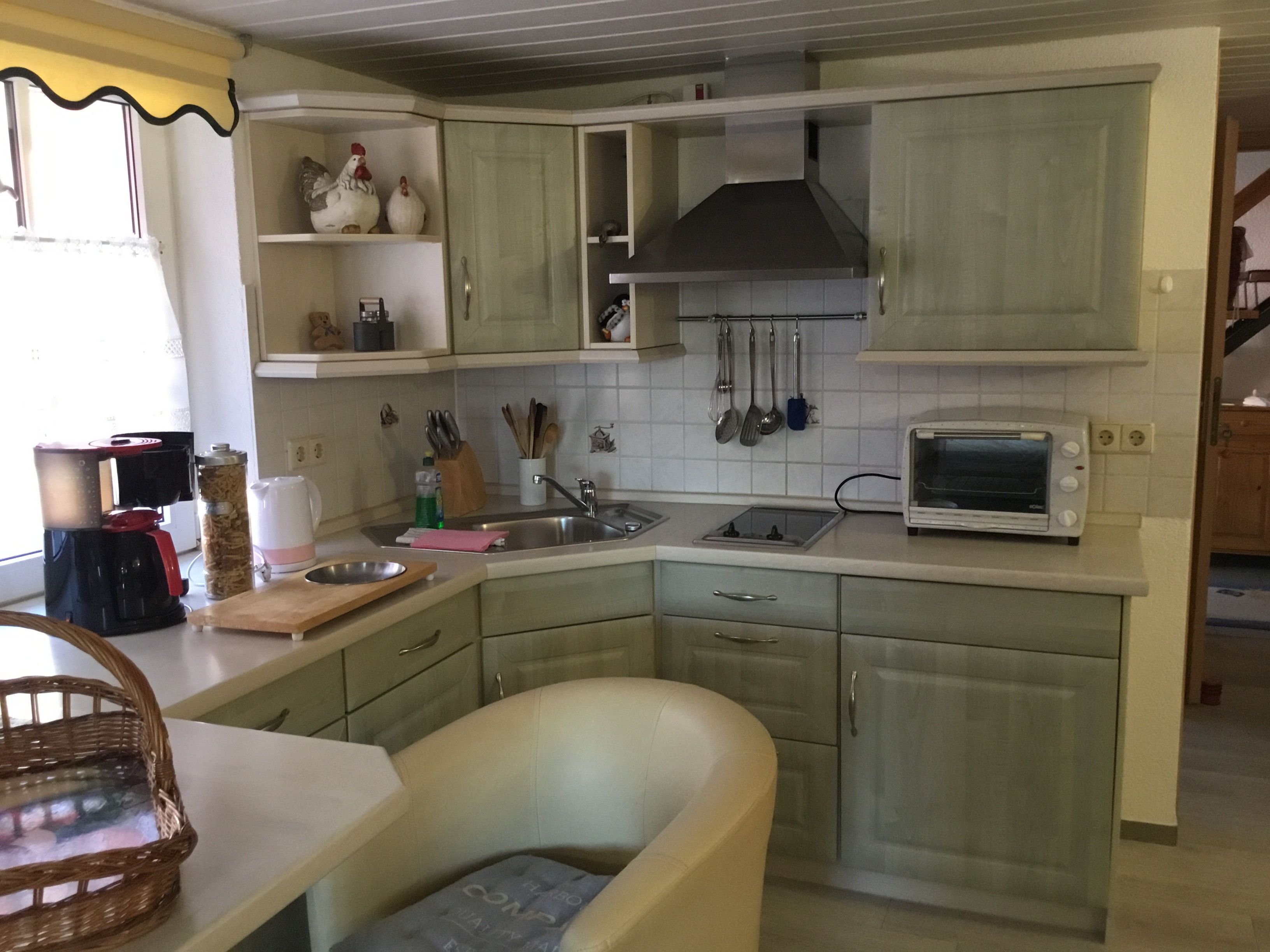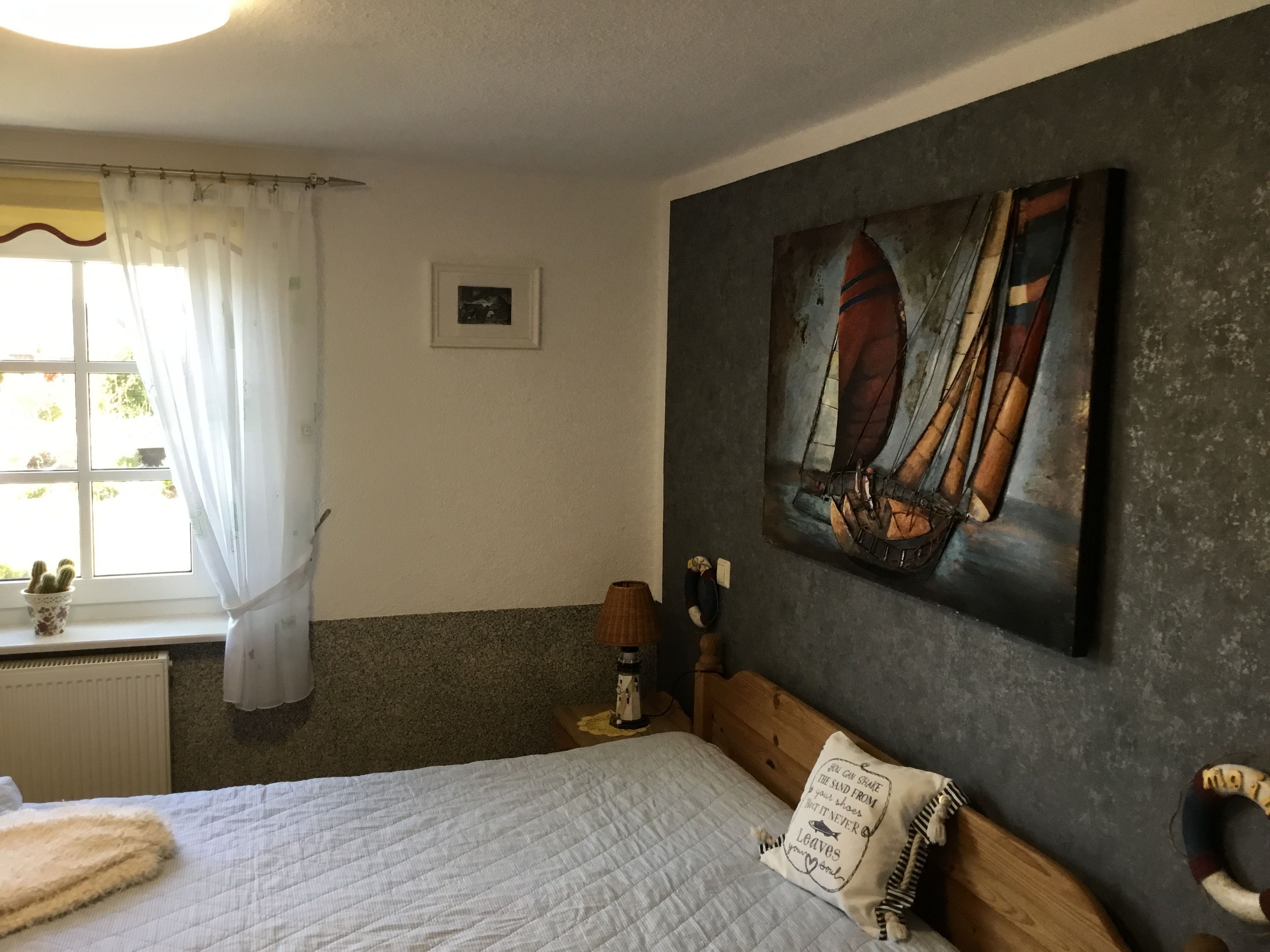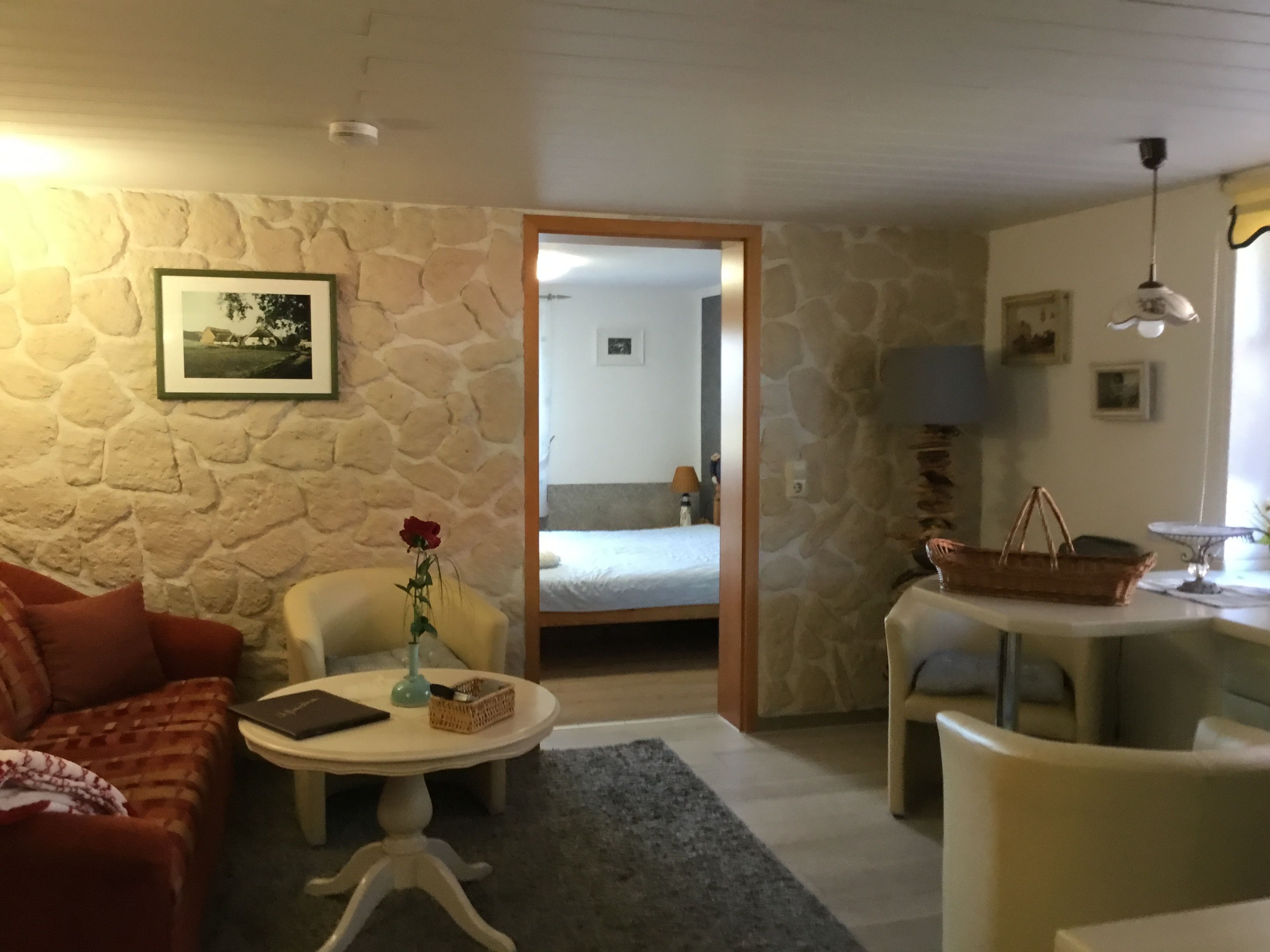 Die gemütliche Ferienwohnung (Nichtraucher) bietet mit seinen ca. 34 qm ausreichend Platz für 2-3 Personen. Der Wohnbereich umfasst eine gemütliche Couchecke (Aufbettung für 3.Person) mit Couchtisch ein Sideboard mit Radio und TV-Gerät. Die angrenzende Einbauküchenzeile mit Essecke bietet Ihnen ein 2 Ceranfeld, Abzugshaube, kleinen Backofen, Spüle, Kaffeemaschine, Wasserkocher, Toaster sowie diverse Küchenutensilien. Das Schlafzimmer verfügt über ein Doppelbett mit Nachtischkonsolen und einen Kleiderschrank. Das geflieste Tageslichtbad verfügt über eine Dusche, WC, Waschtisch und einen Fön. WLAN inklusive. Die bestuhlte Gemeinschaftsterrasse lädt zum Verweilen ein. Das separate und gemütliche Blockhaus auf dem Grundstück der Vermieter, steht allen Gästen der Pension zur Verfügung. Ein gemütlicher Grillabend findet in der Saison 1 x wöchentlich zusammen mit dem Vermieter statt. Genauere Informationen erhalten Sie vor Ort. Auf Anfrage können Sie vor Ort ebenfalls den Brötchenservice in Anspruch nehmen sowie das Frühstück p.P. für 7,00 Euro dazu buchen. Bis 14 Tage vor Anreise können Sie die Erstausstattung eines Wäschepaketes für 6,00 Euro p.P. dazu buchen bzw. durch eigene ergänzen. Ein Haustier ist gegen einen Aufpreis ein gern gesehener Gast.
