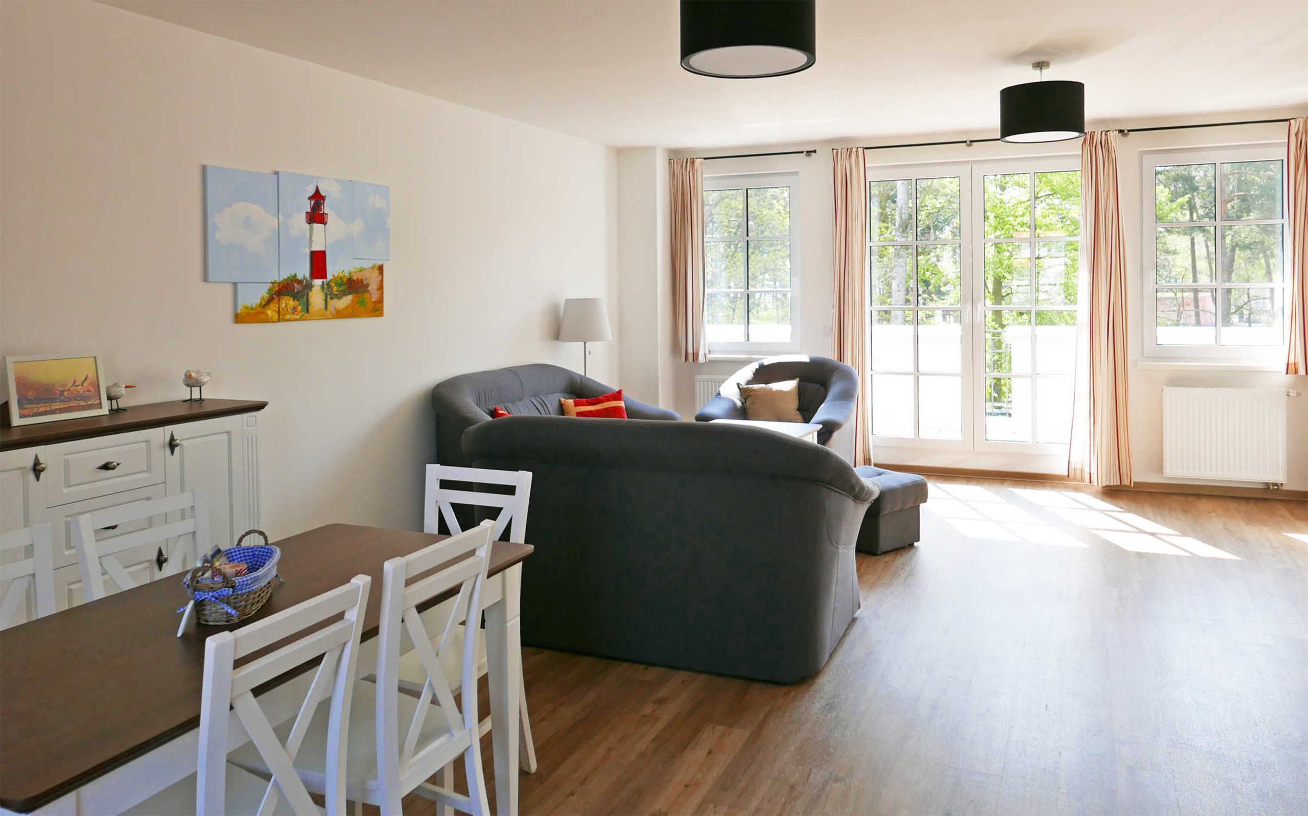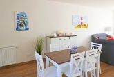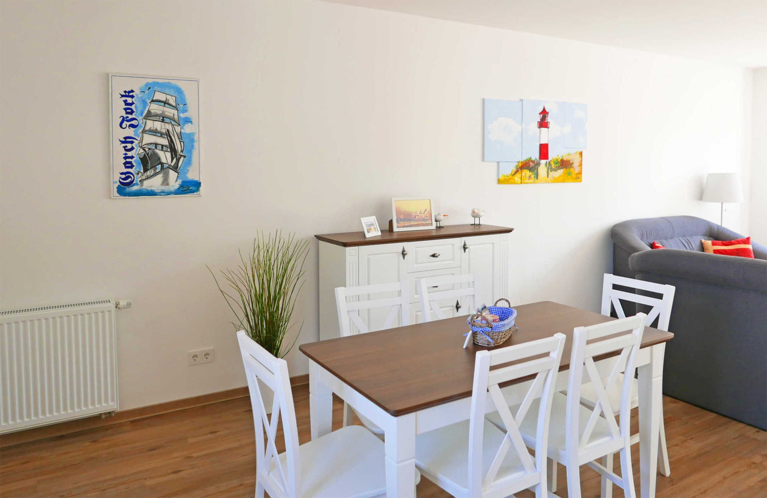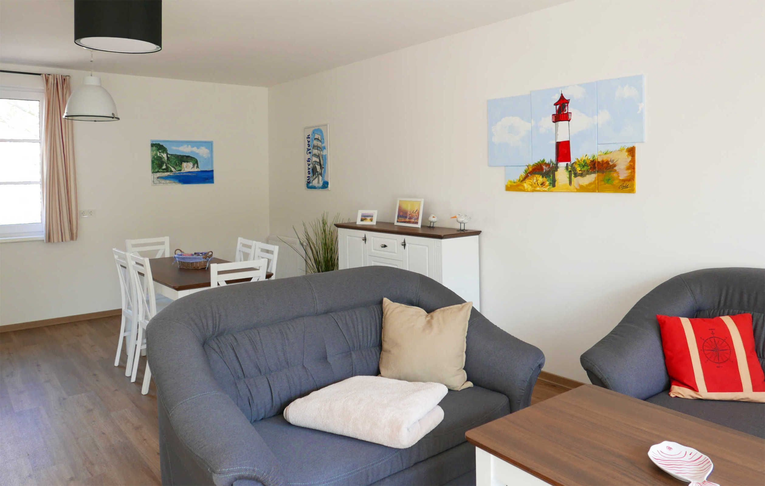 Die Ferienwohnung Sandbank bietet auf 89 Quadratmetern reichlich Platz für bis zu 6 Personen. Das helle Wohnzimmer macht mit geweißten Holzmöbeln so richtig Lust auf Urlaub. Der Balkon bietet einen tollen Meerblick.
