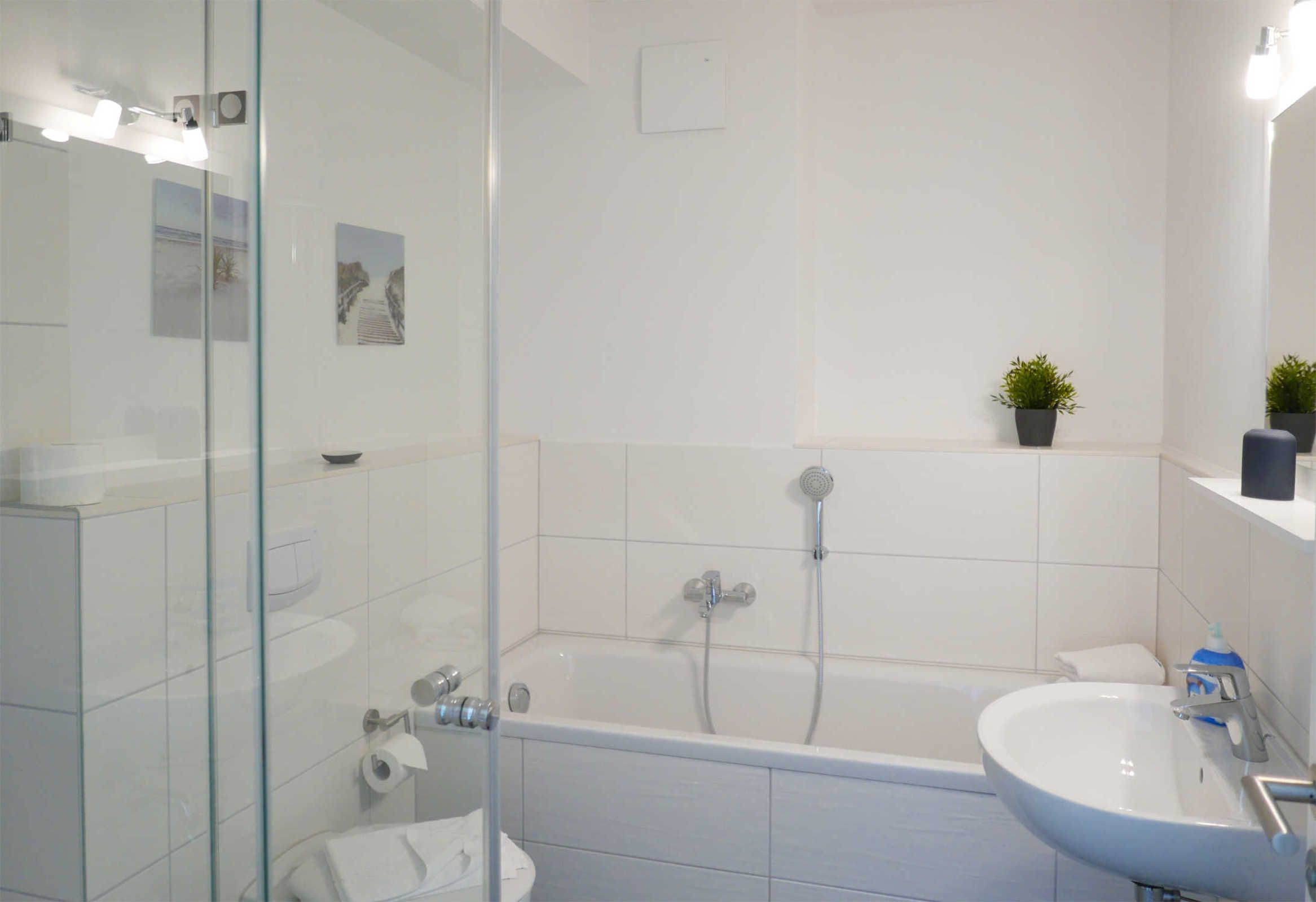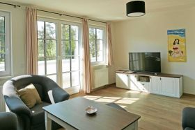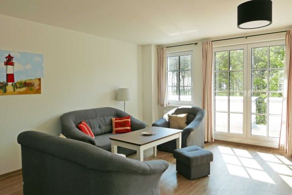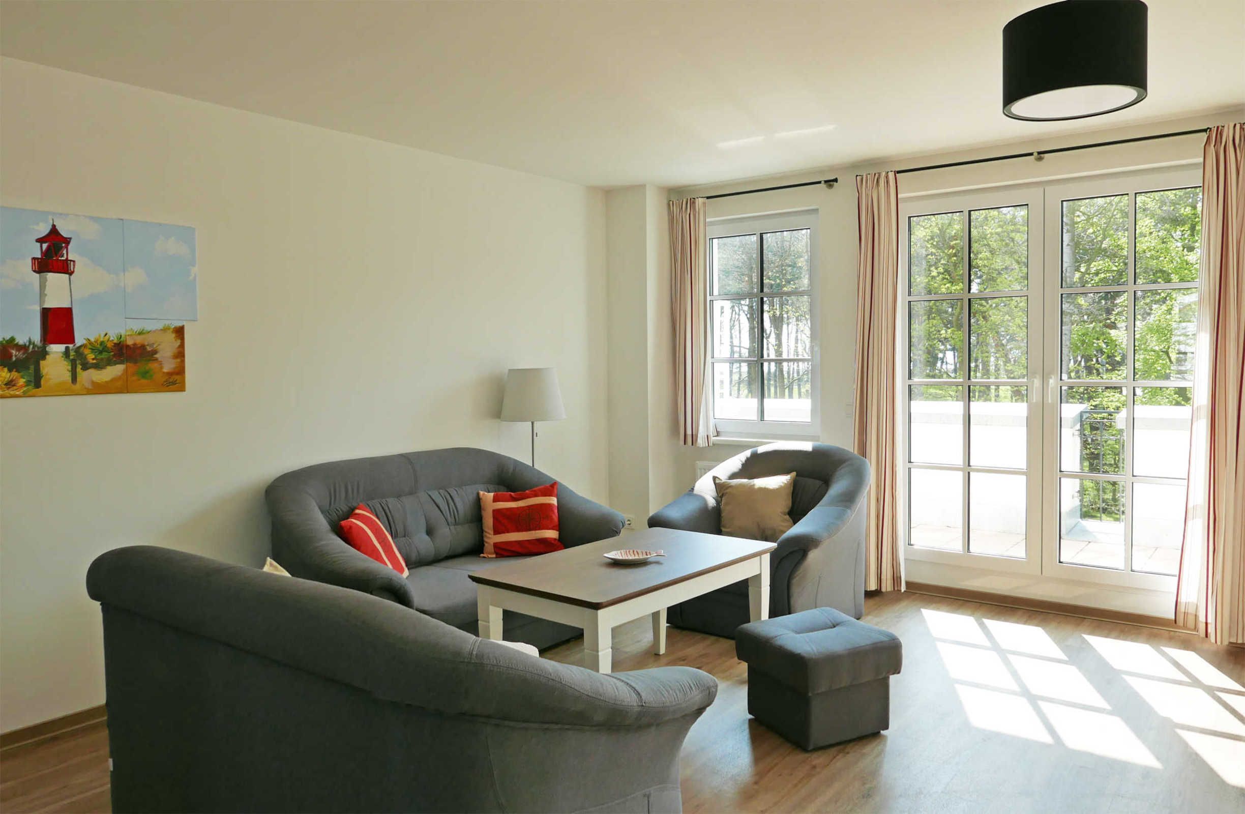 Die Ferienwohnung Sandbank bietet auf 89 Quadratmetern reichlich Platz für bis zu 6 Personen. Das helle Wohnzimmer macht mit geweißten Holzmöbeln so richtig Lust auf Urlaub. Der Balkon bietet einen tollen Meerblick.
