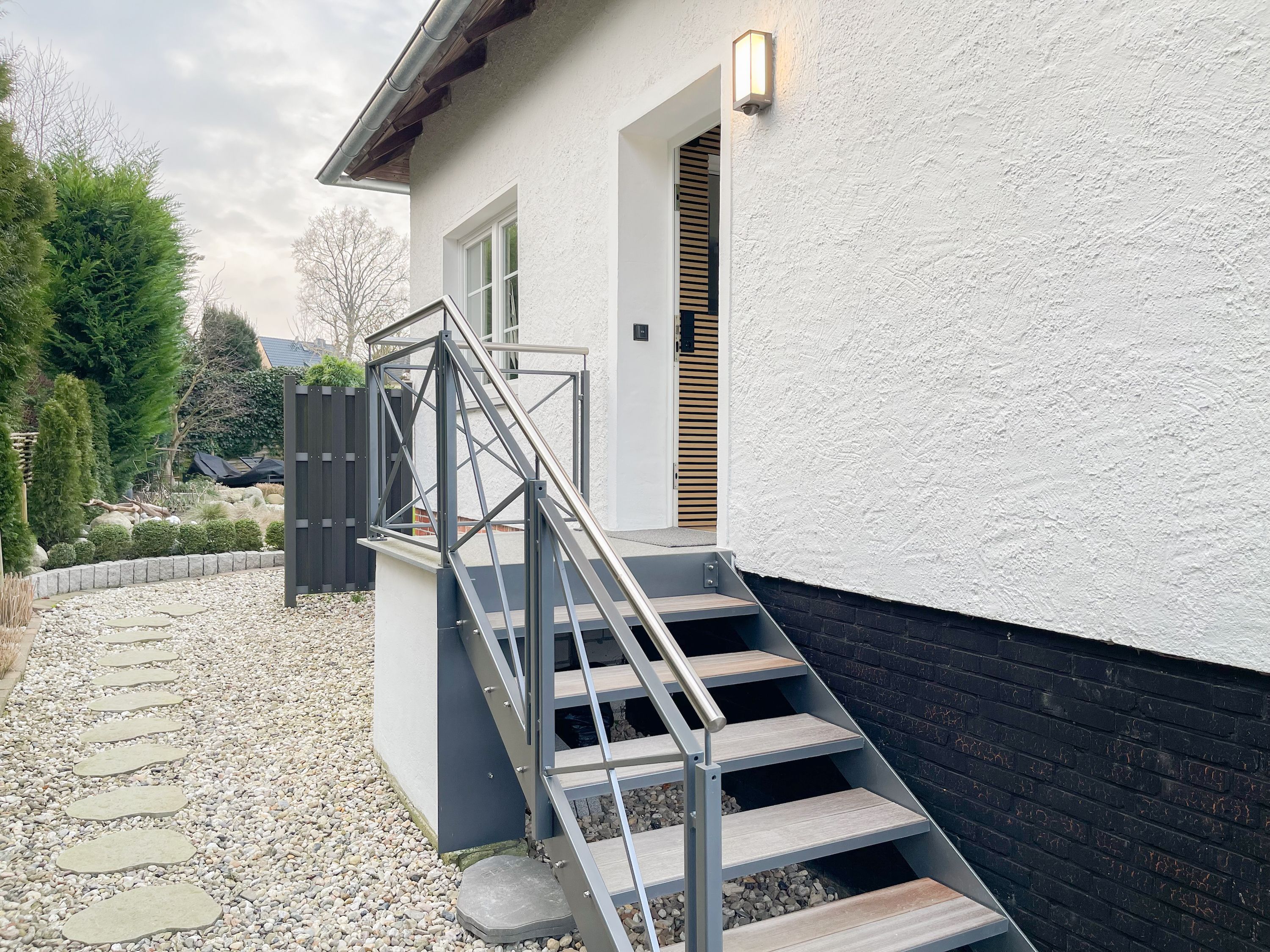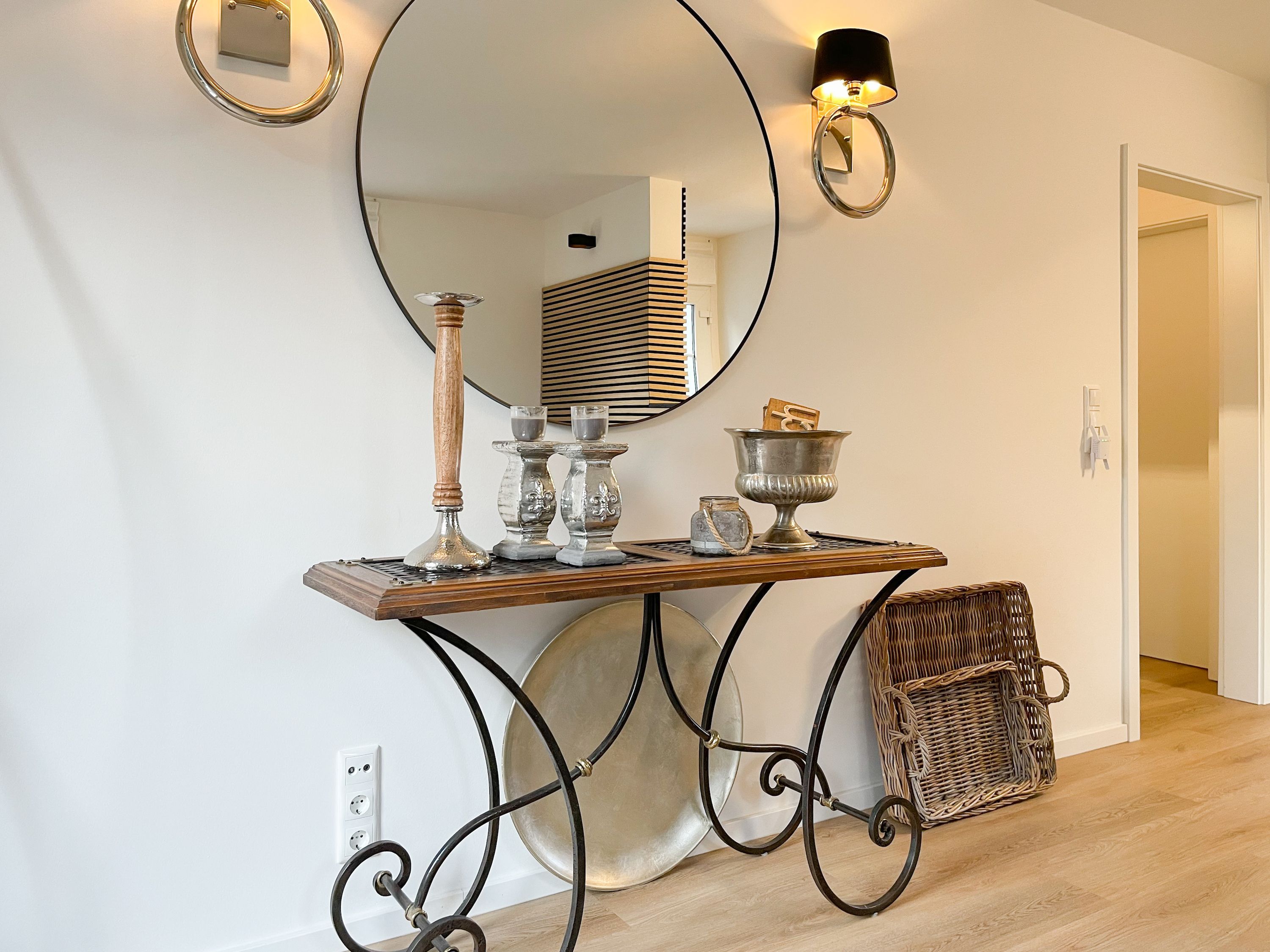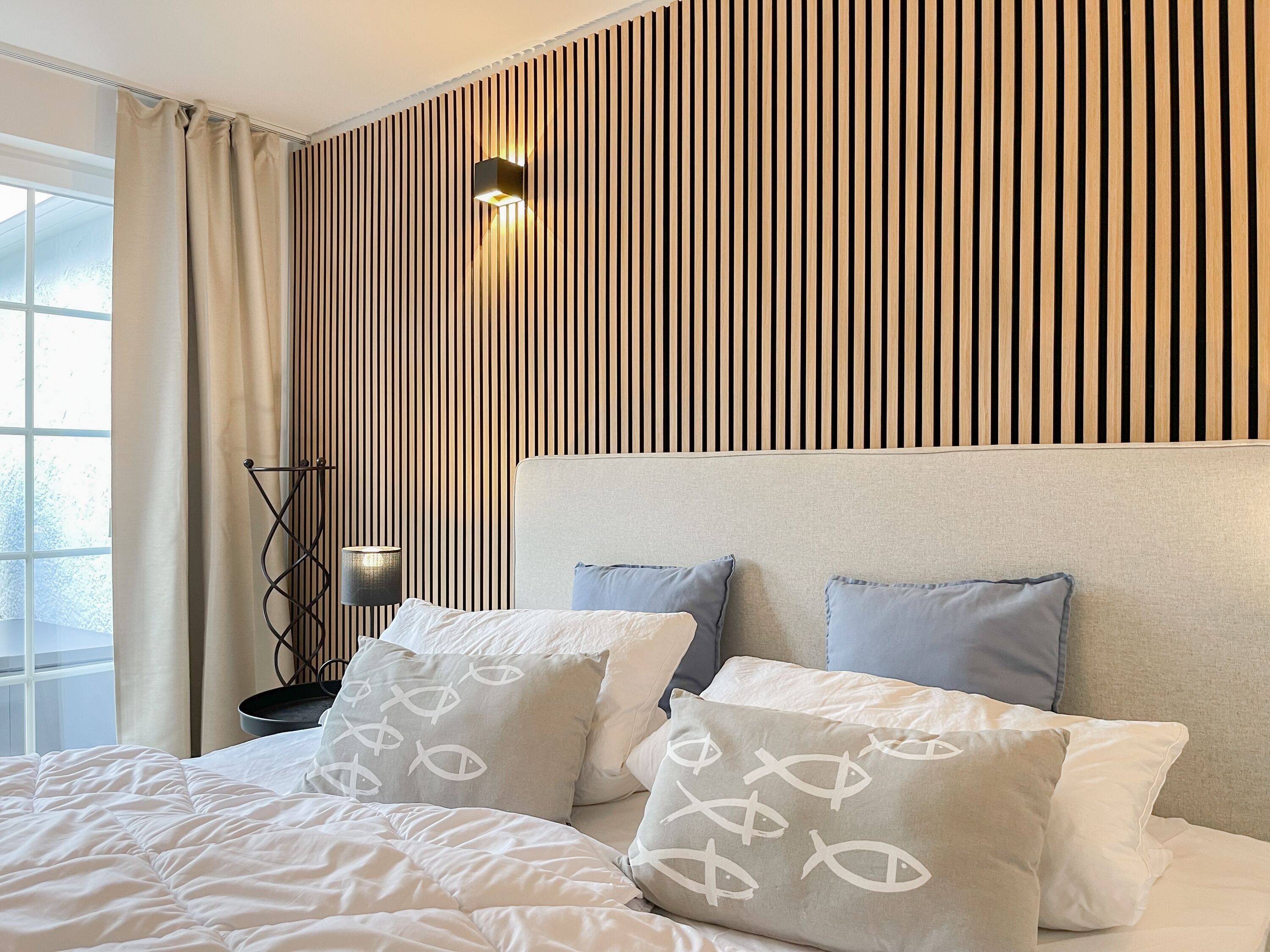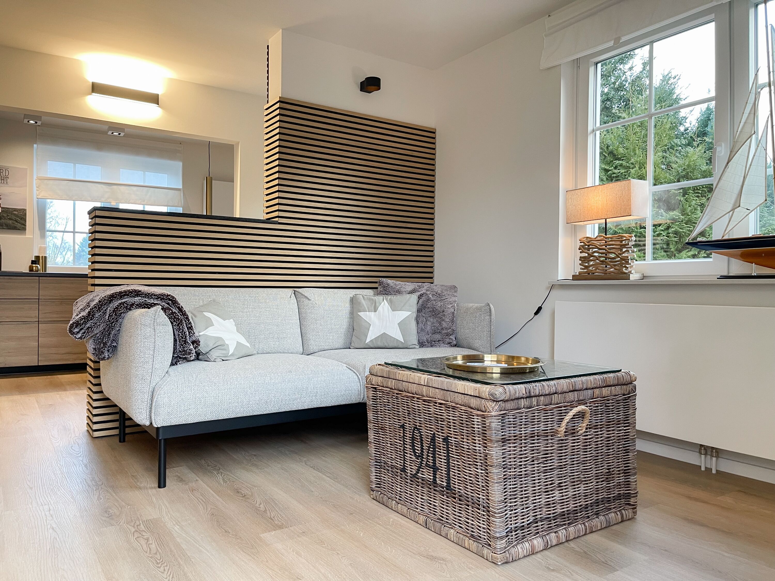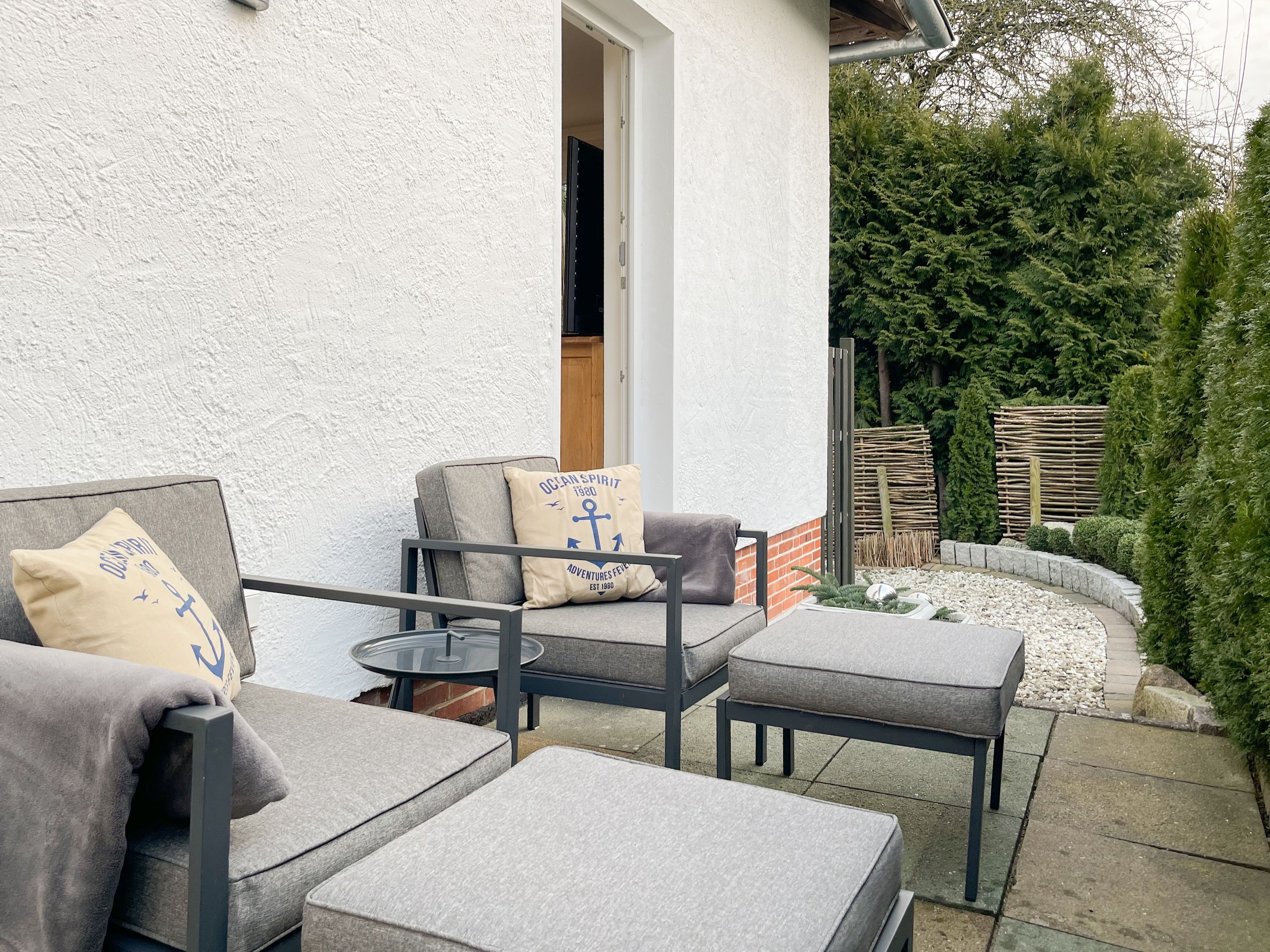 Frisch und aufwendig renoviert in 2024, erwartet Sie eine hochwertige und mit vielen liebevollen Details eingerichtete Ferienwohnung, die im Hochpaterre liegt und über einen eigenen, privaten Eingang verfügt. Ein Highlight ist die großzügige, begrünte und uneinsehbare Terrasse, für viele entspannte Stunden mit Sonnenschein vom Nachmittag bis zum Sonnenuntergang. Der stilvolle Wohnbereich mit Terrassenzugang ist lichtdurchflutet und mit einem bequemen Sofa zum Relaxen sowie einem Smart-TV ausgestattet. WLAN steht selbstverständlich zur Verfügung. Die offene Wohnküche in perfekter Ausstattung verfügt unter anderem über Spülmaschine, Backofen mit integrierter Mikrowelle, Induktionskochfeld, Kühlschrank und Gefrierfach. Der integrierte Essbereich ist sehr gemütlich gestaltet. Das großzügig angelegte Schlafzimmer ist mit einem Boxspringbett (180x200), Kleiderschrank für die Urlaubsgarderobe und einem Schreibtisch eingerichtet. Die bodentiefen Terrassenfenster lassen sich mit Vorhängen verdunkeln. Im modernen Bad sorgen zwei Fenster für reichlich Tageslicht. Die hochwertige Ausstattung umfasst eine Walk-In Dusche, Waschtisch, Spiegel mit indirekter Beleuchtung, Handtuchtrockner und WC.