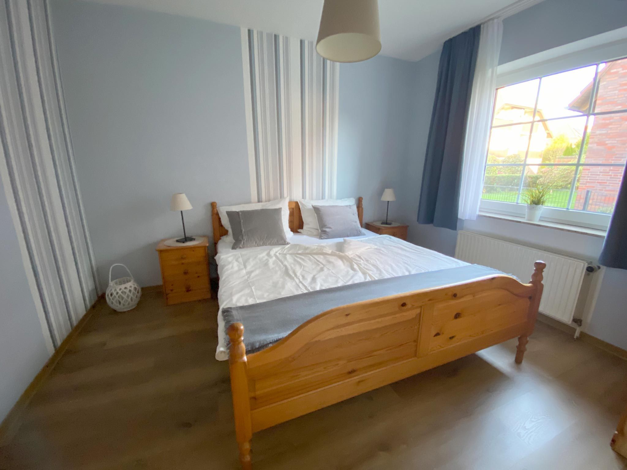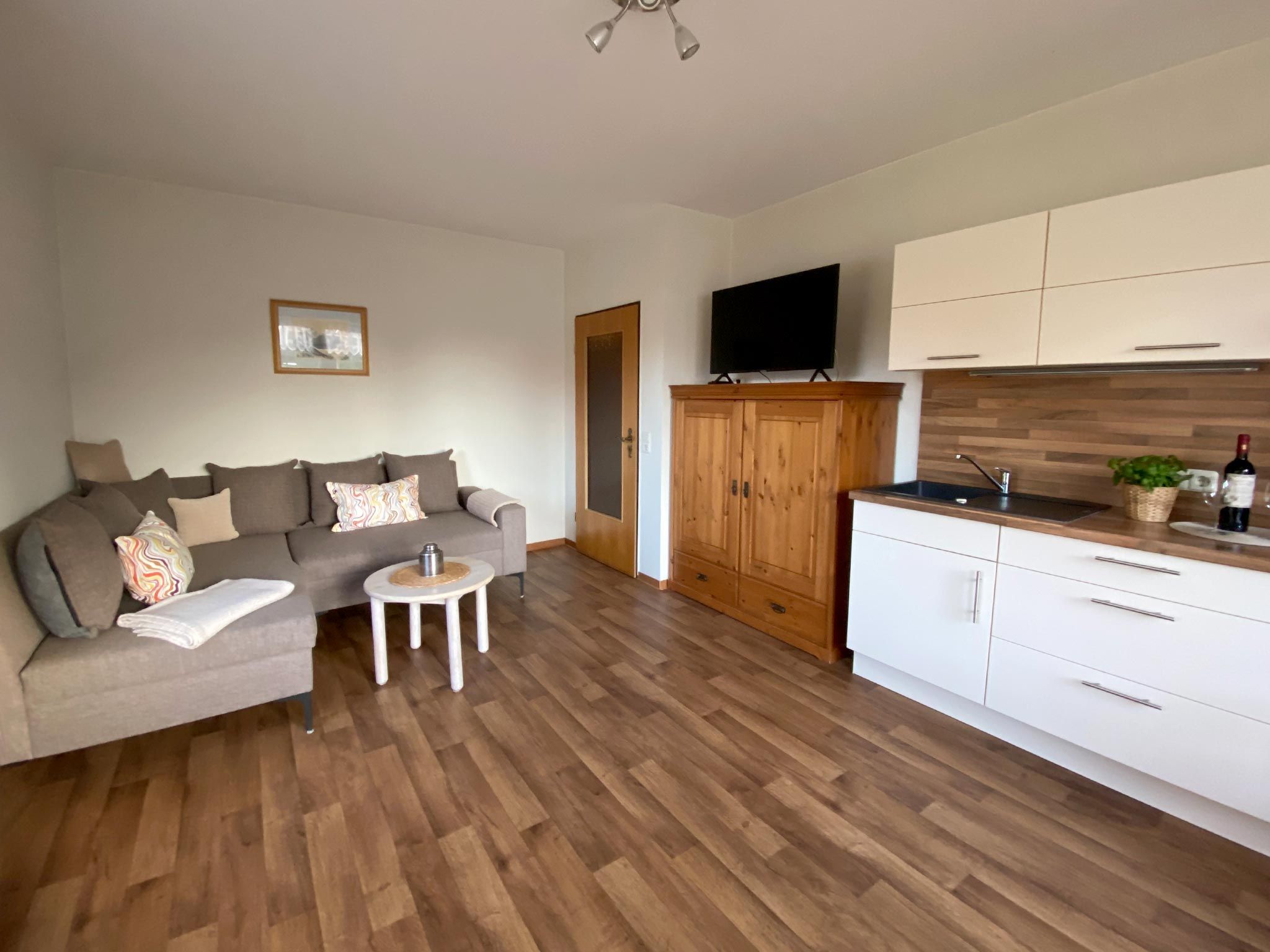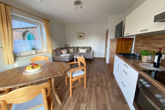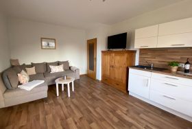 Ferienwohnung für 2 Personen mit Wohn-/Esszimmer und einem Schlafzimmer mit Doppelbett. Die offene Küche ist komplett ausgestattet. Bad mit barrierefreier Dusche und WC. Terrasse mit Gartenmöbeln und Grillmöglichkeit.