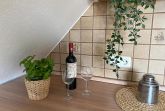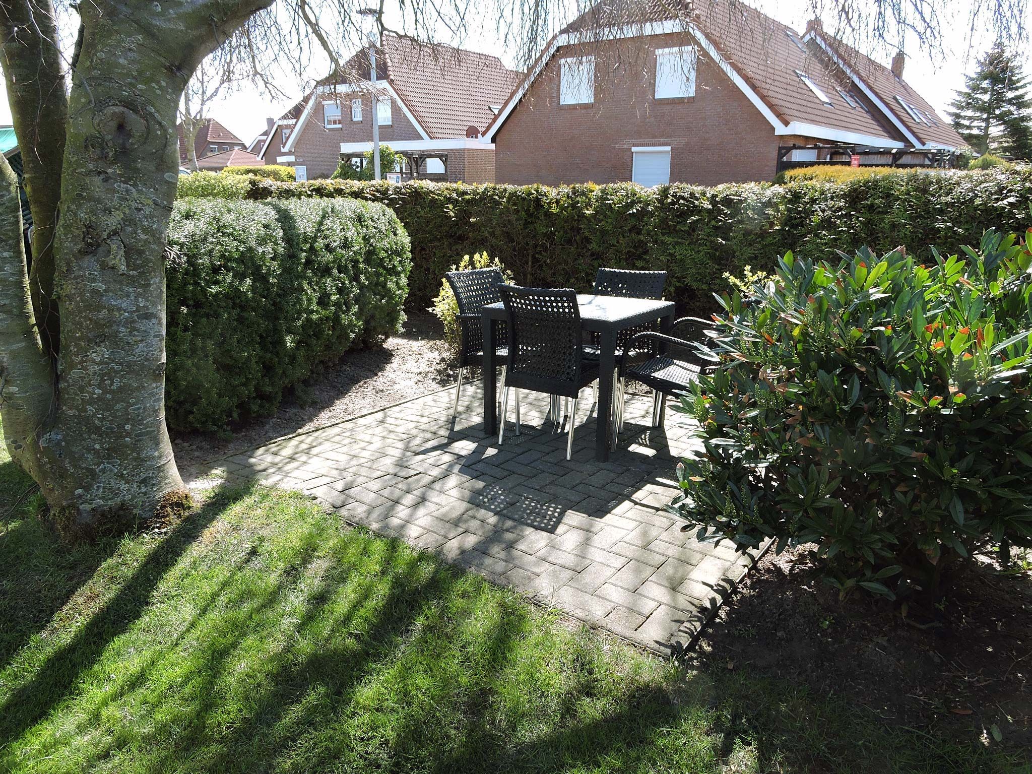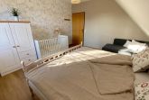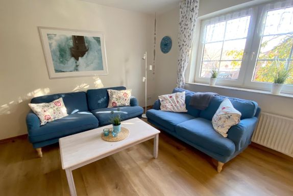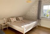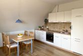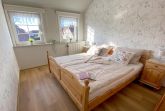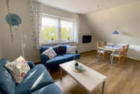 Ferienwohnunng für 4 Erwachsene und ein Kleinkind im Obergeschoss. Die Wohnung bietet Wohn- und Esszimmer, offene, komplett ausgestatte Küche, 2 Schlafzimmer jeweils mit Doppelbett sowie Bad mit Dusche und WC. Im Garten steht eine Terrasse mit Strandkorb und Grillmöglichkeit zur Verfügung.