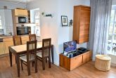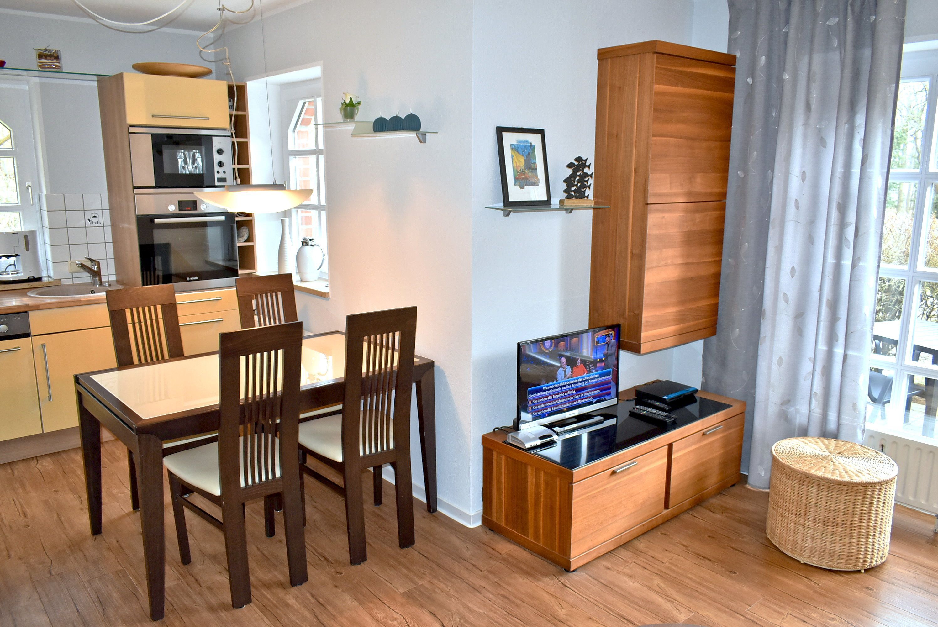 Wohnzimmer: Beistelltisch, 2 Plattenherd mit Ceranfeld, 5 Stühle, Couchtisch, Eckcouch, Esstisch, Geschirr, Kochtöpfe, Küchenzeile, Kühlschrank mit 3* Gefrierfach, Stereoanlage mit CD-Player, Spülmaschine, Stehlampe, Tischlampe, Toaster, SAT-TV, Flachbildschirm, Wasserkocher, Kaffeemaschine, TV-Unterschrank, Dunstabzugshaube