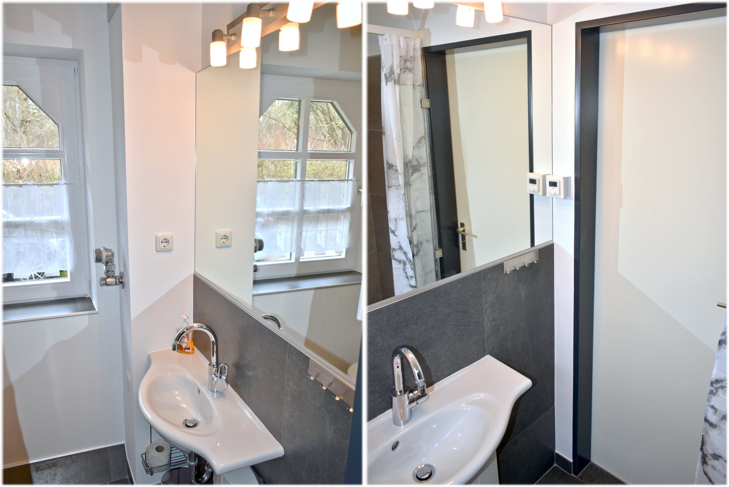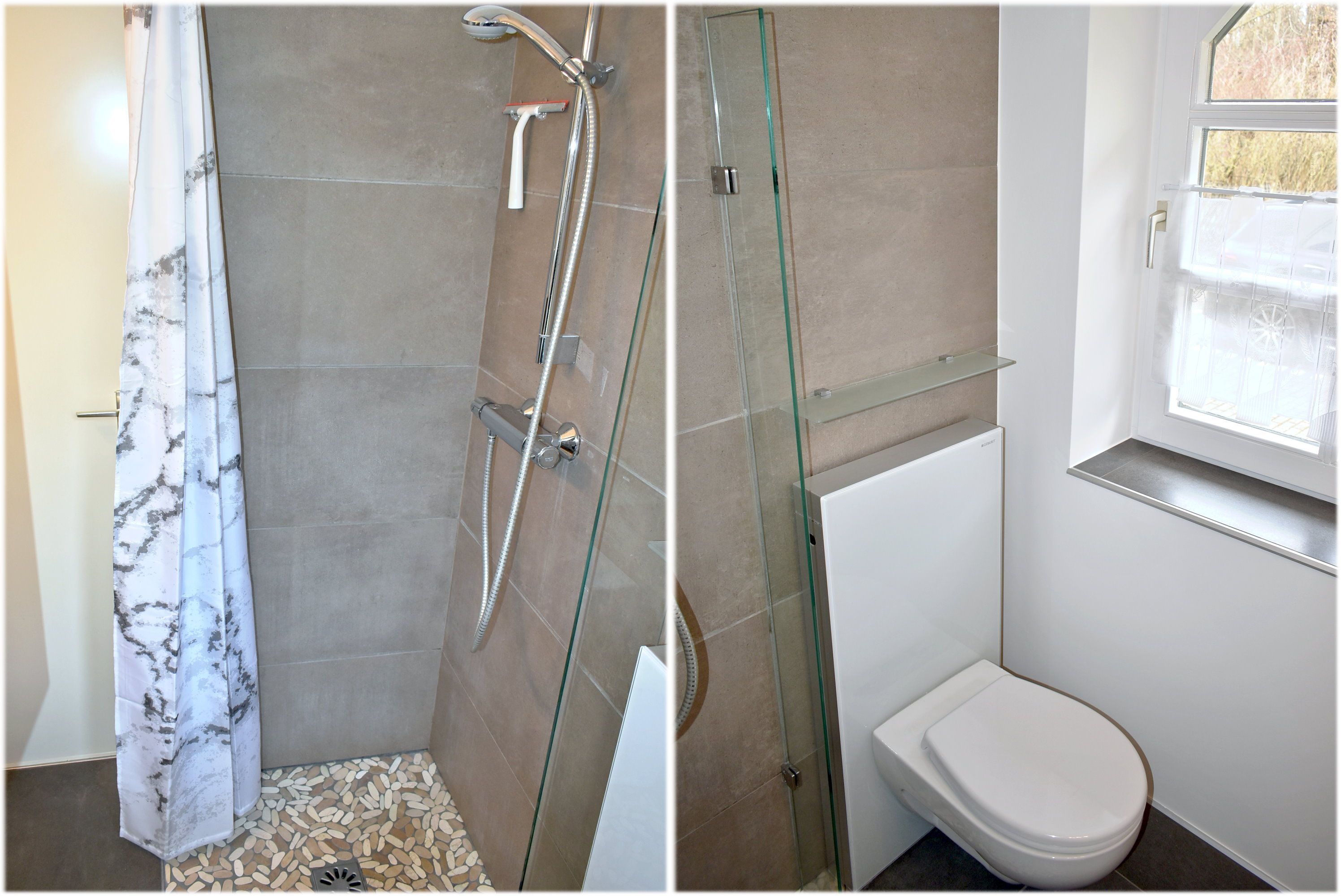 Bad 1: Dusche bodengleich, Spiegel, Waschbecken, WC