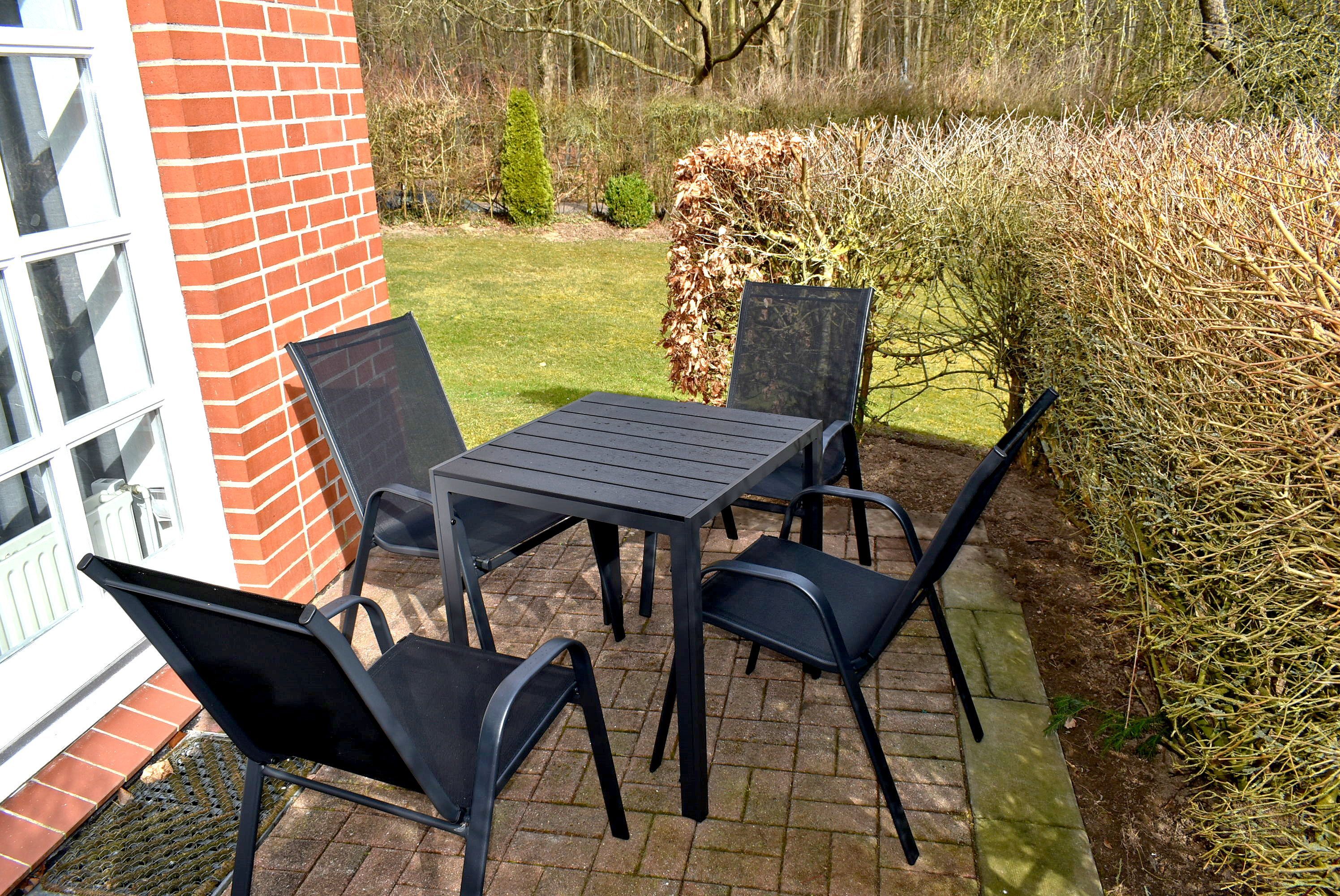 Terrasse: 4 Stühle, Tisch, Sonnenschirm