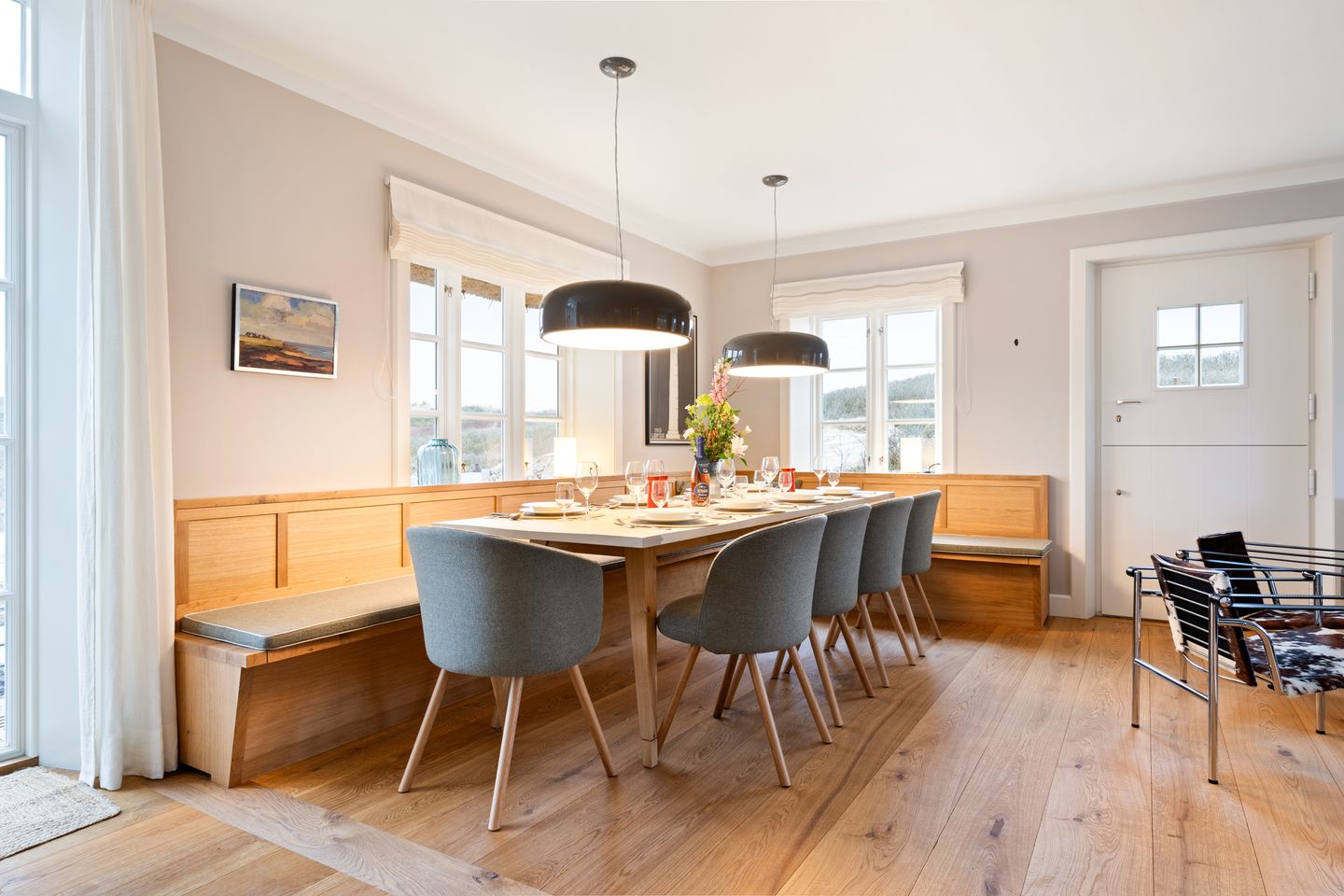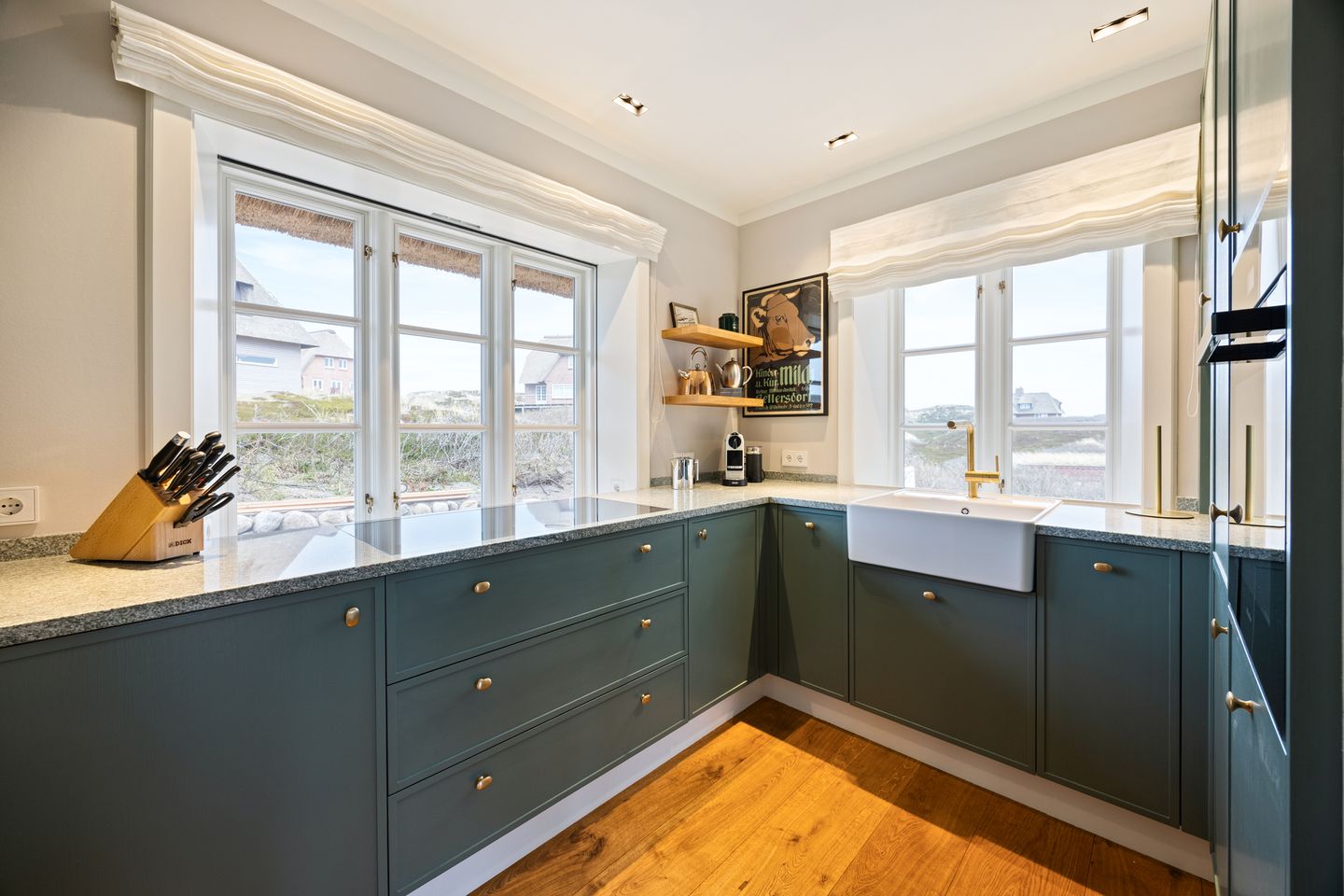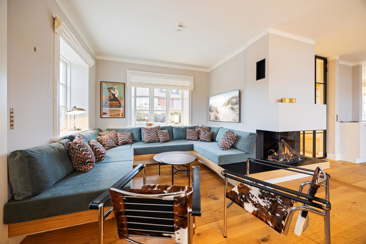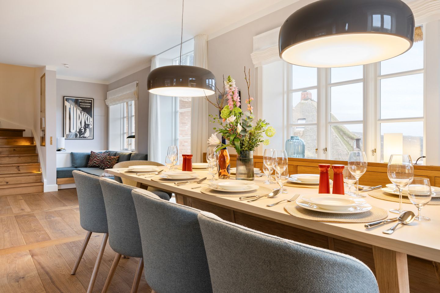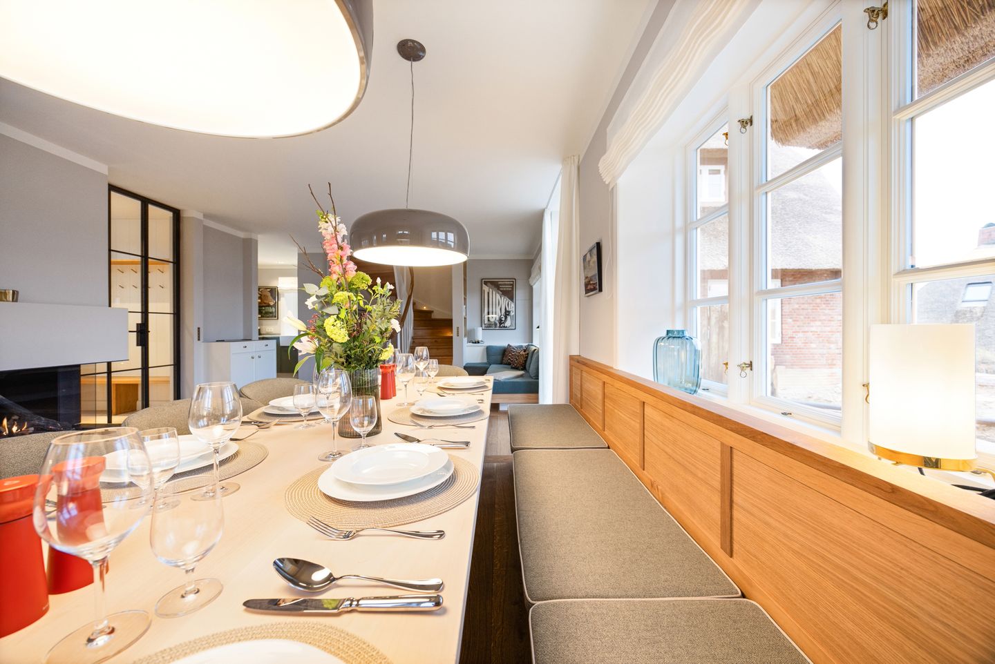 Der offene Wohn- und Essbereich beeindruckt mit einer stilvollen Einrichtung und einer einladenden Atmosphäre. Der große Esstisch, ein rustikaler Brauhaustisch in einer sonnigen Sitzecke, lädt zu geselligen Mahlzeiten ein. Gegenüber befindet sich die moderne Kochinsel, die die offene Raumgestaltung perfekt abrundet. Der elegante Gaskamin sorgt an kühleren Abenden für wohlige Wärme und Gemütlichkeit. In der Sofaecke oder den zwei bequemen Ledersesseln können Sie entspannen und die einmalige Aussicht auf die Dünenlandschaft genießen.