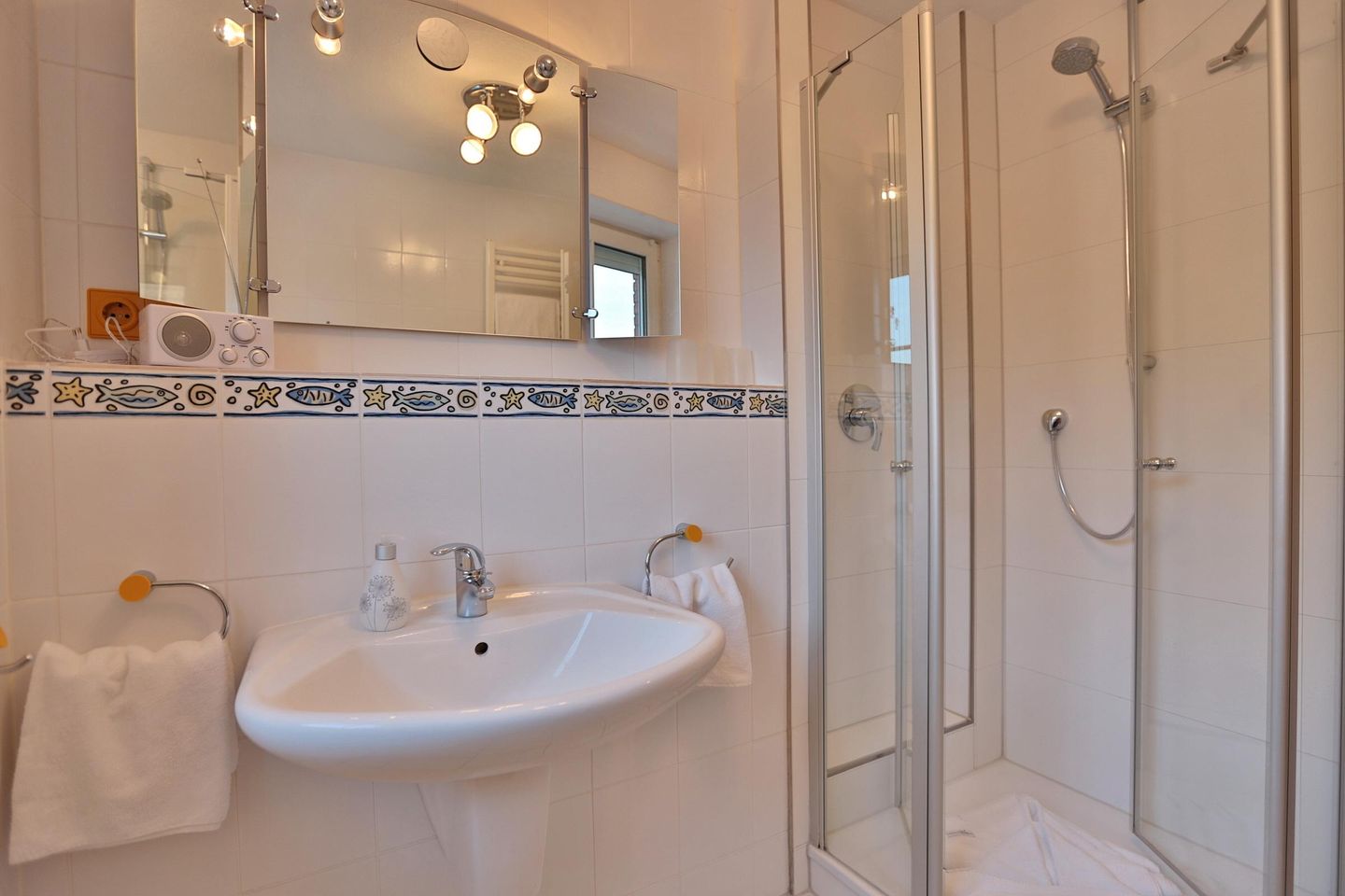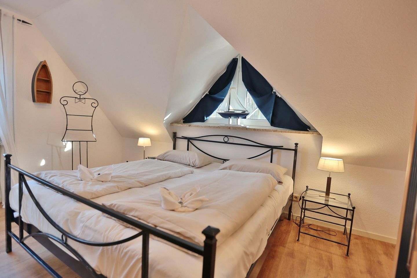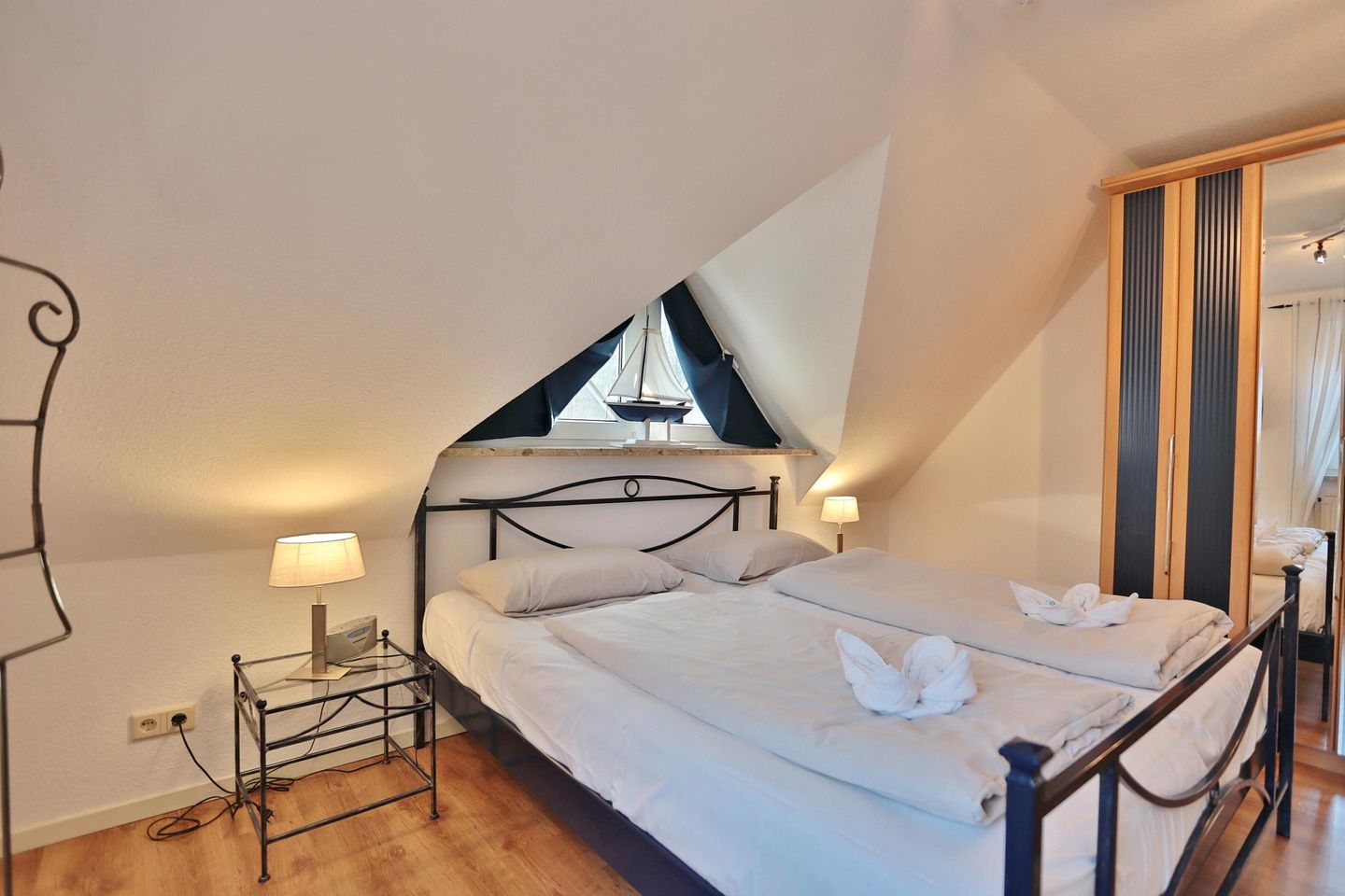 Das großzügige Schlafzimmer bietet ein gemütliches Doppelbett (180cm x 200cm) für einen erholsamen Schlaf. Kleine dekorative Artikel, sowie ein Kleiderschrank mit Spiegel tragen zum Wohlfühlmoment bei.