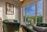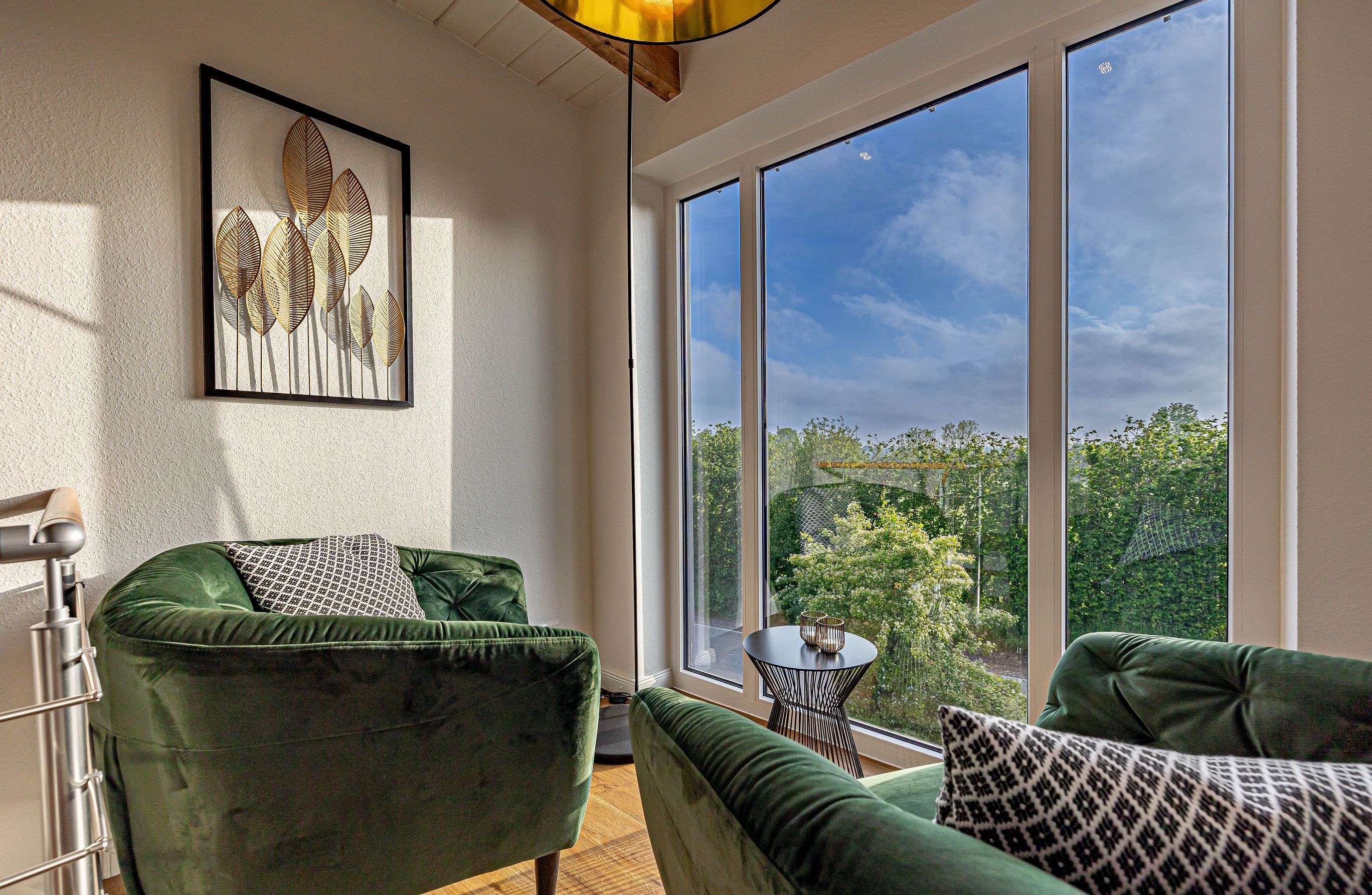- Moderne Galerie mit Sitzgelegenheit und weitem Blick über die Felder