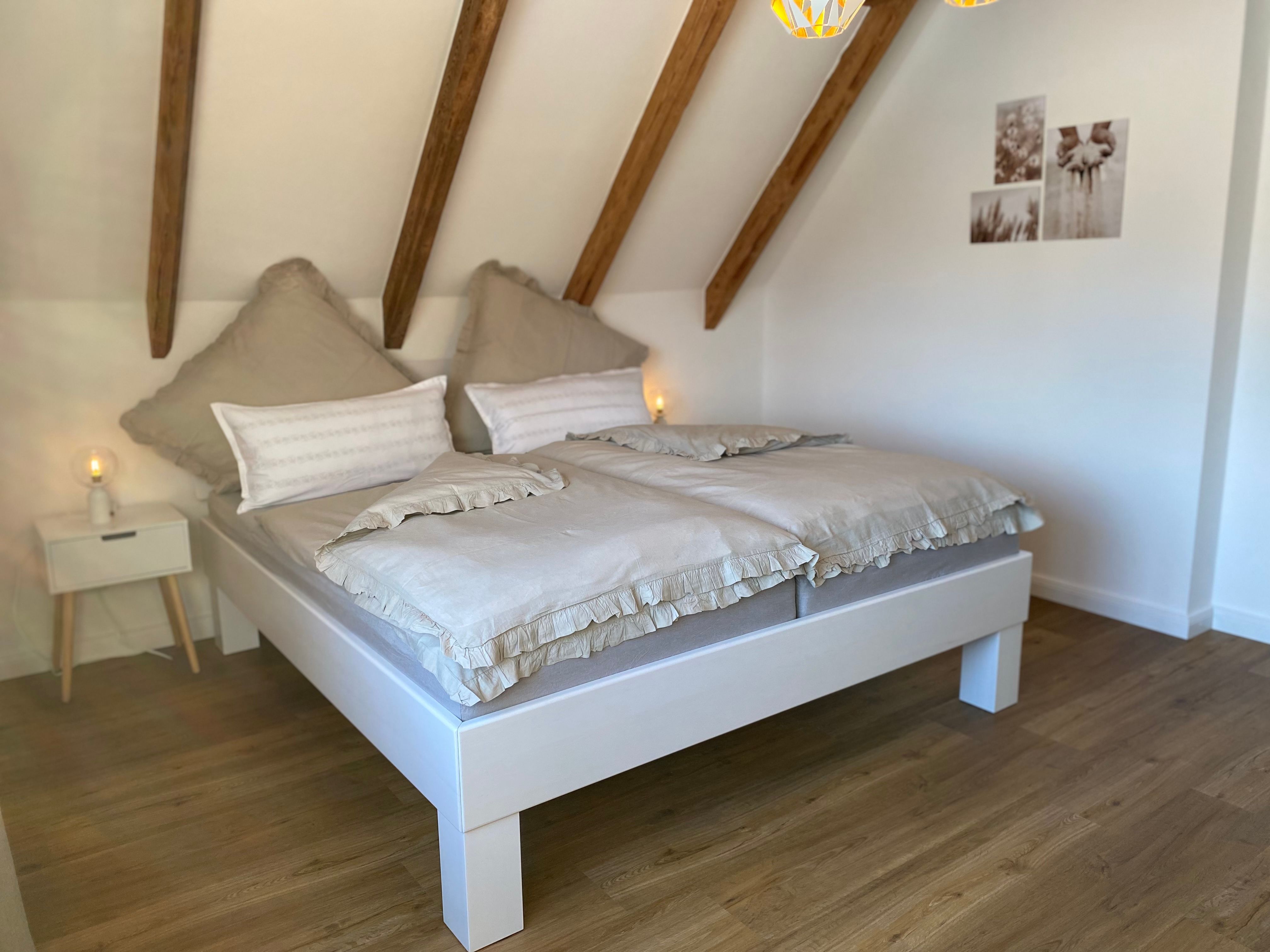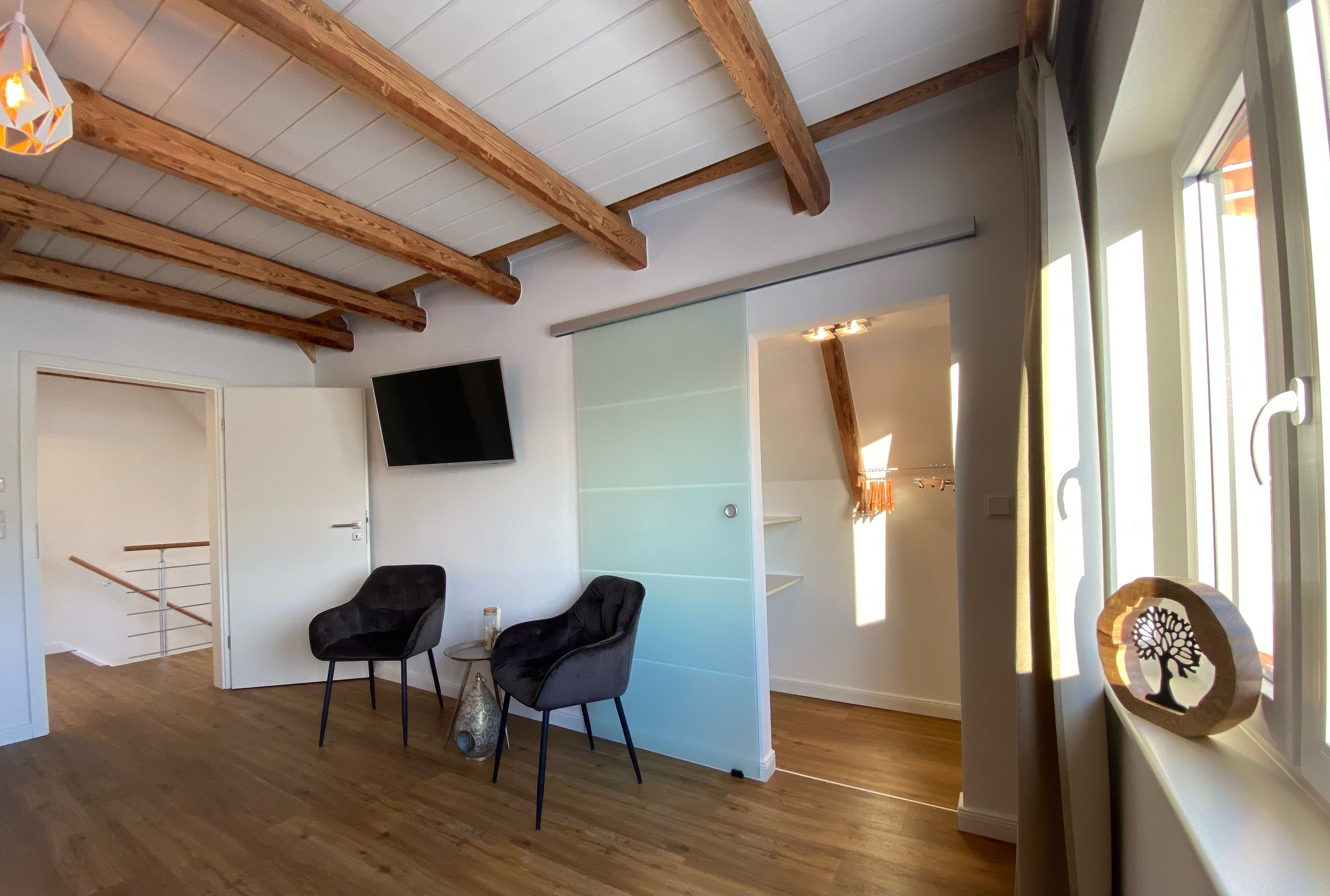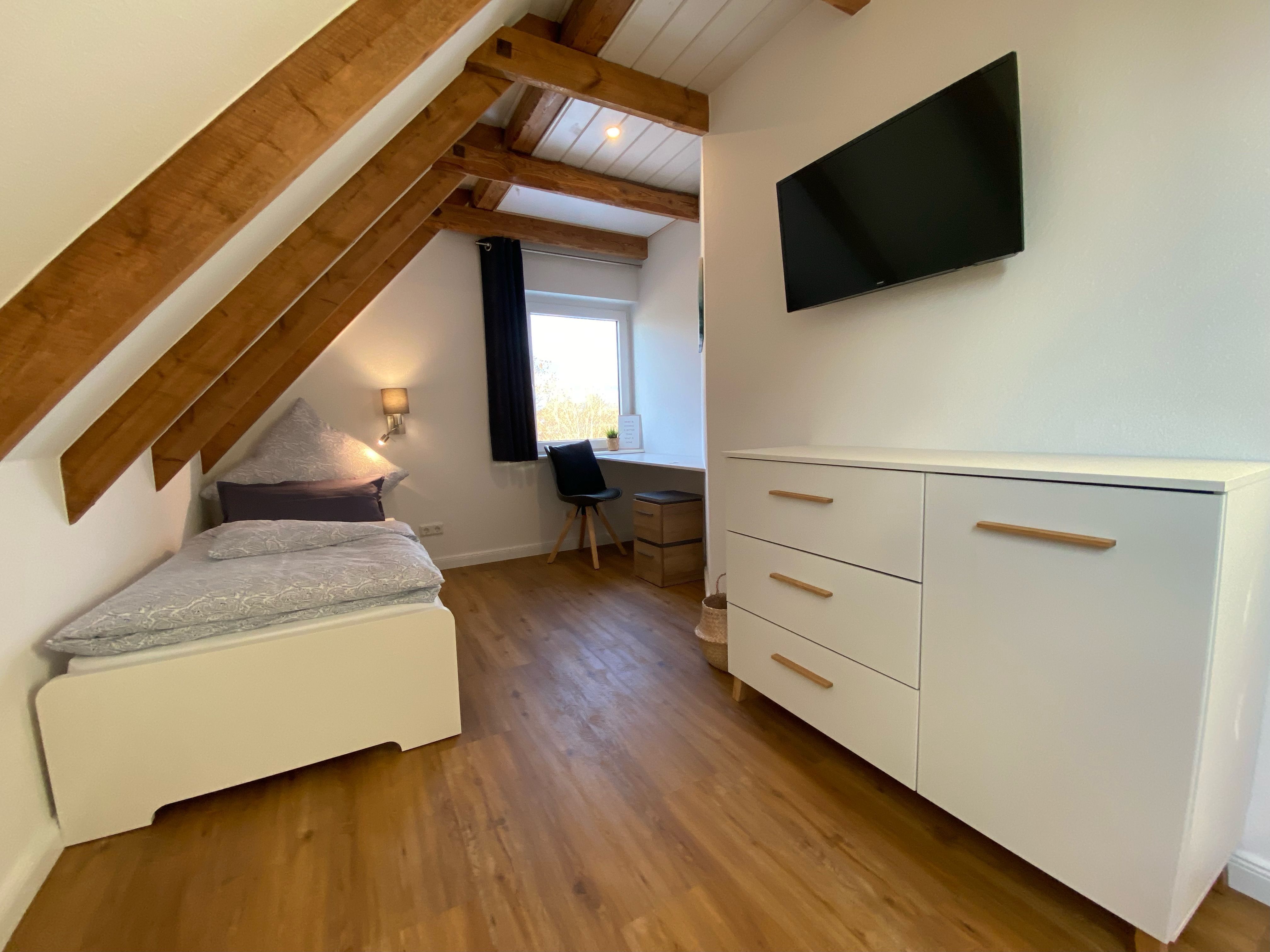- 1 Schlafraum mit Doppelbett (Matratzen 2x 90x200), begehbarem kl. Kleiderschrank, Smart-TV, Sitzgelegenheit
