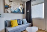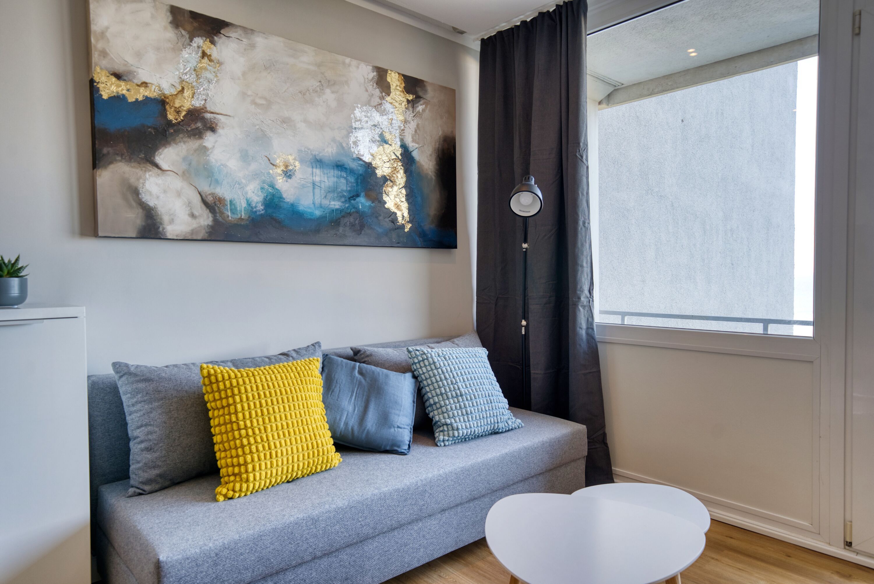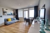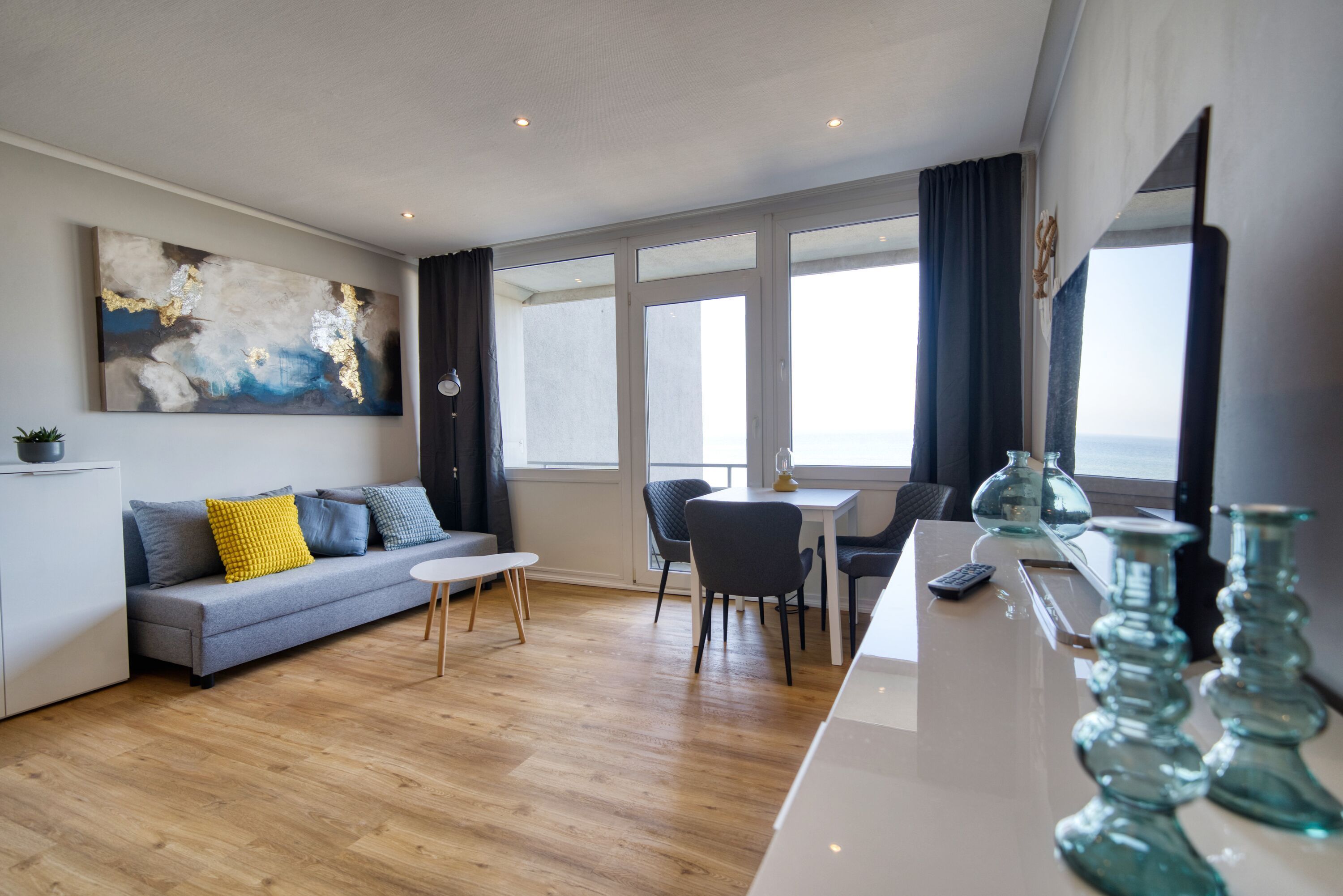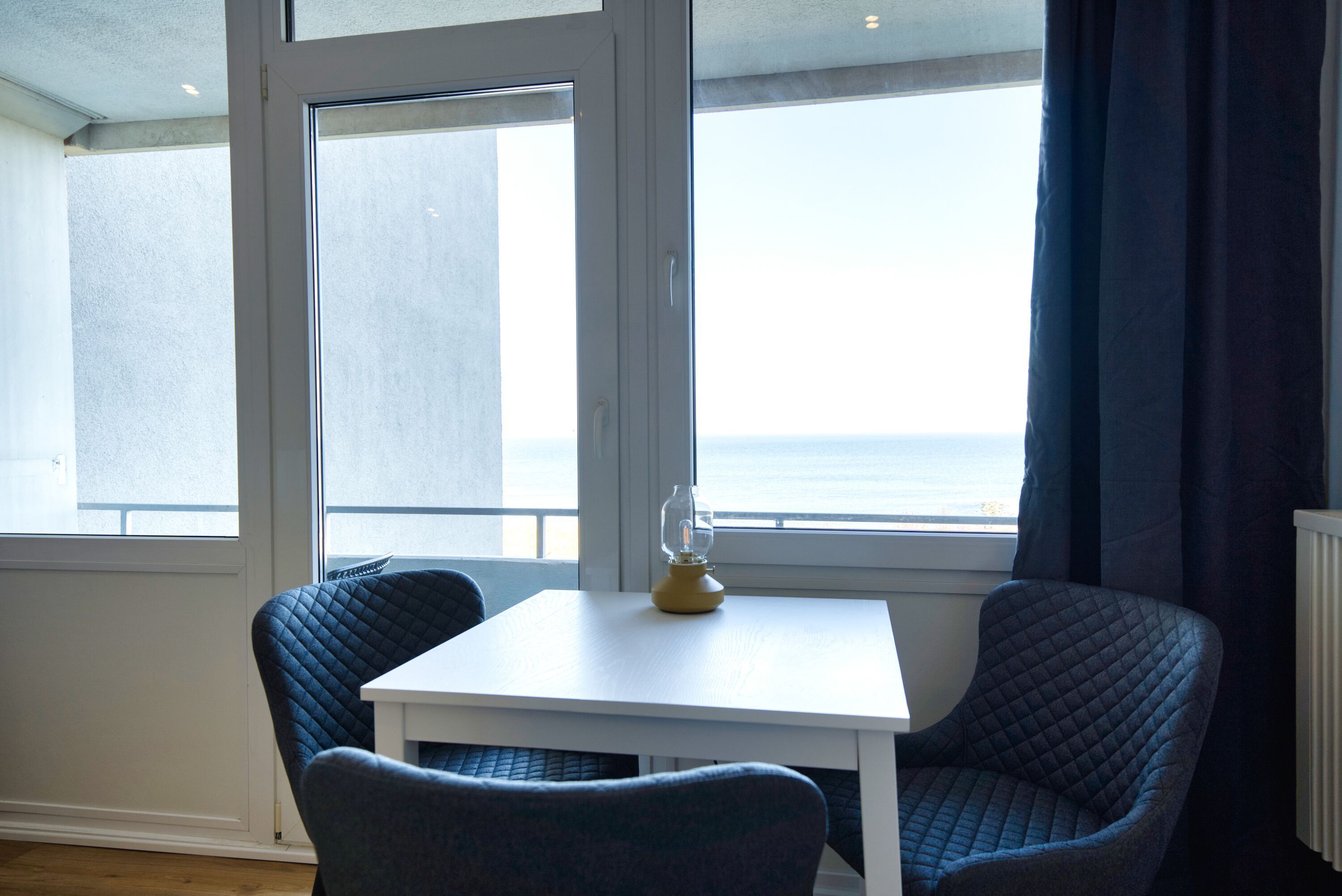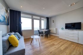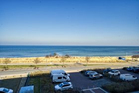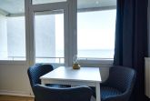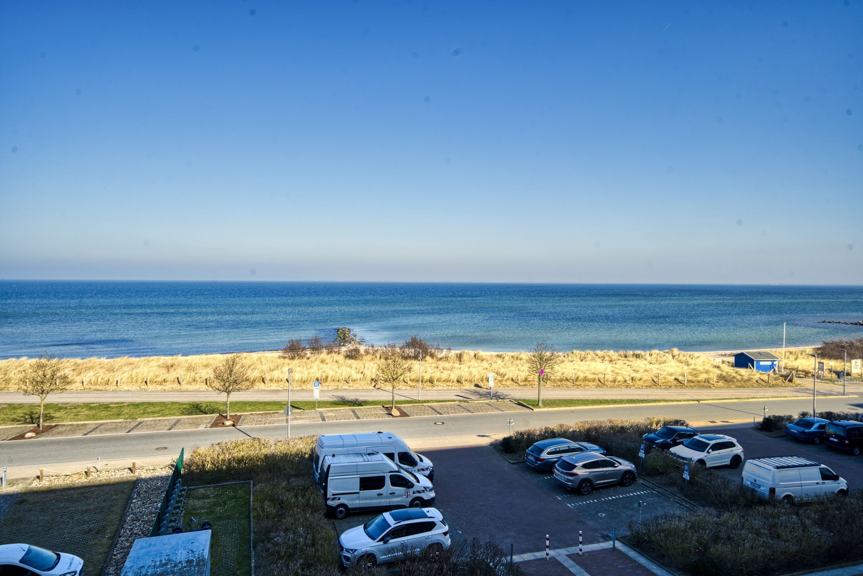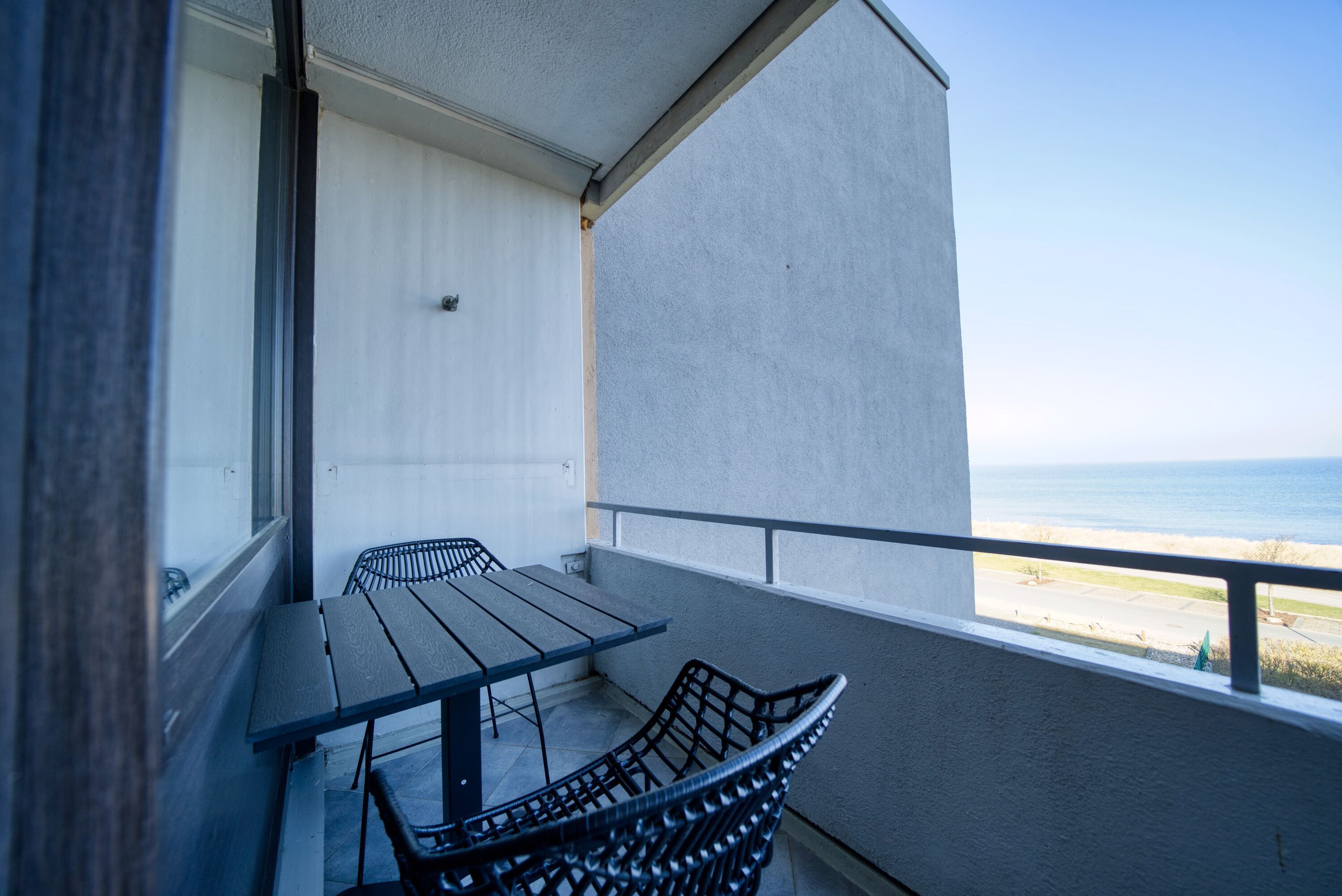 Genießen Sie den spektakulären Ostseeblick von Ihrem eigenen Balkon aus, auf dem Sie die frische Meeresbrise und den beruhigenden Klang der Wellen in vollen Zügen erleben können. Der Wohnbereich ist mit stylischem Vinylboden ausgestattet und strahlt eine warme, einladende Atmosphäre aus.