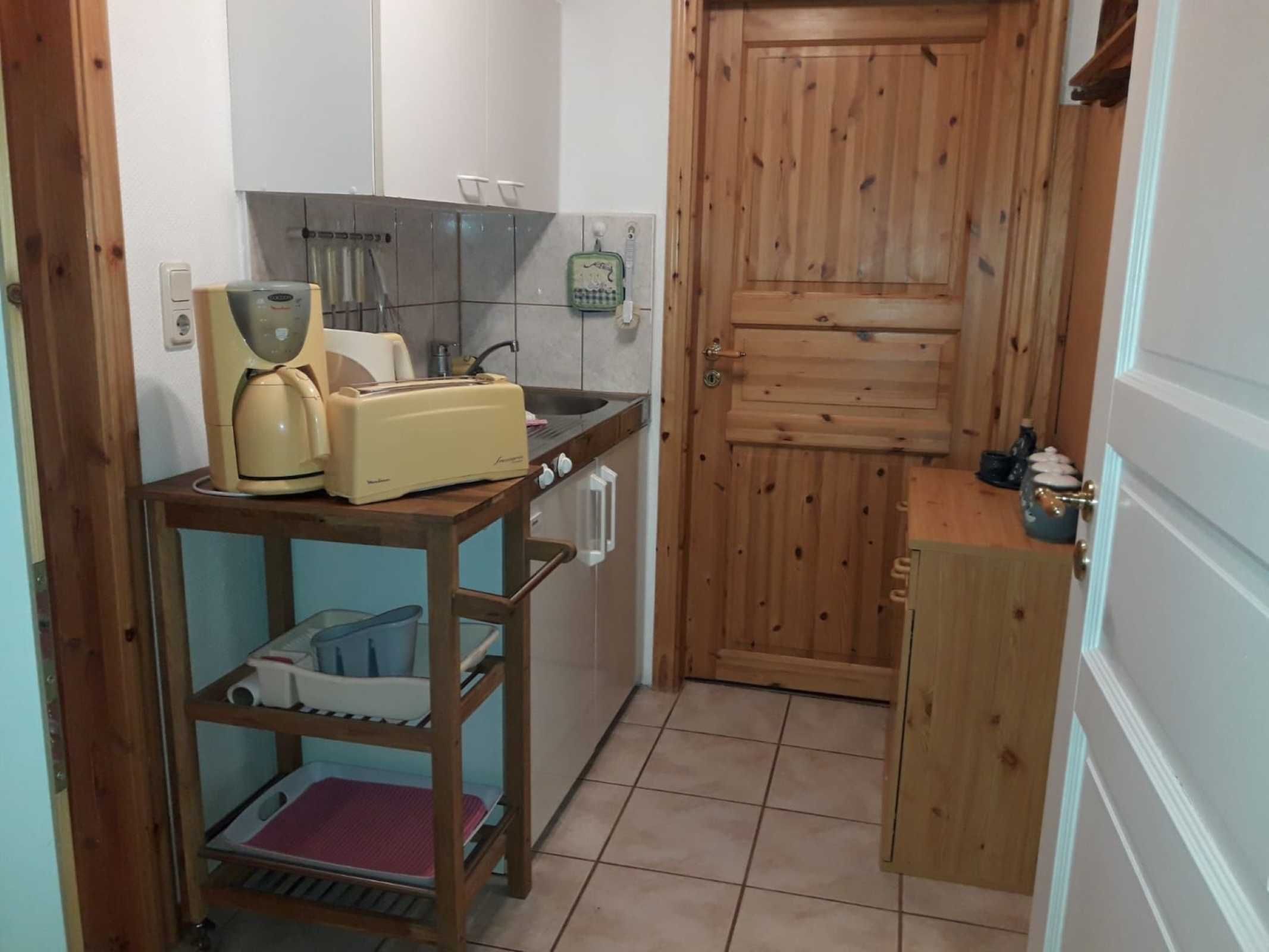 In der Miniküche gibt es einen Kühlschrank mit Tiefkühl-Fach, eine Kaffeemaschine, einen Wasserkocher und einen Toaster. Geschirr ist vorhanden.