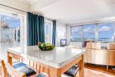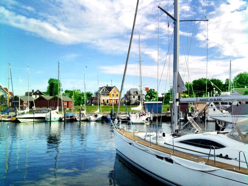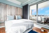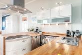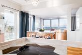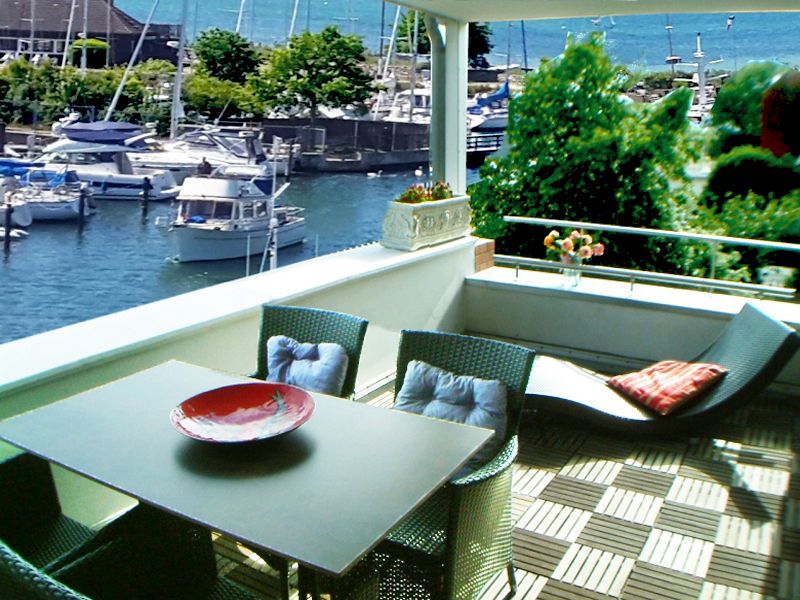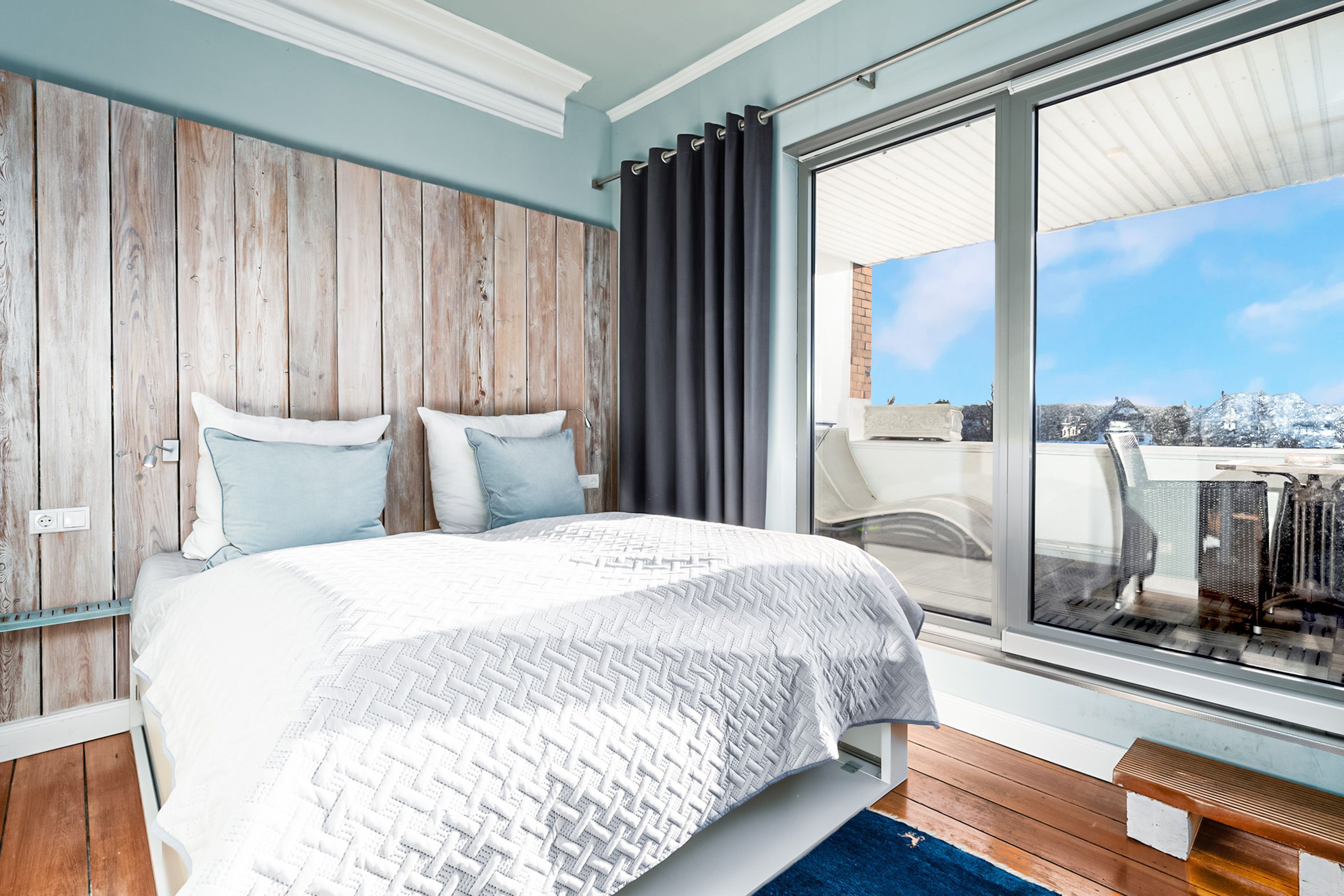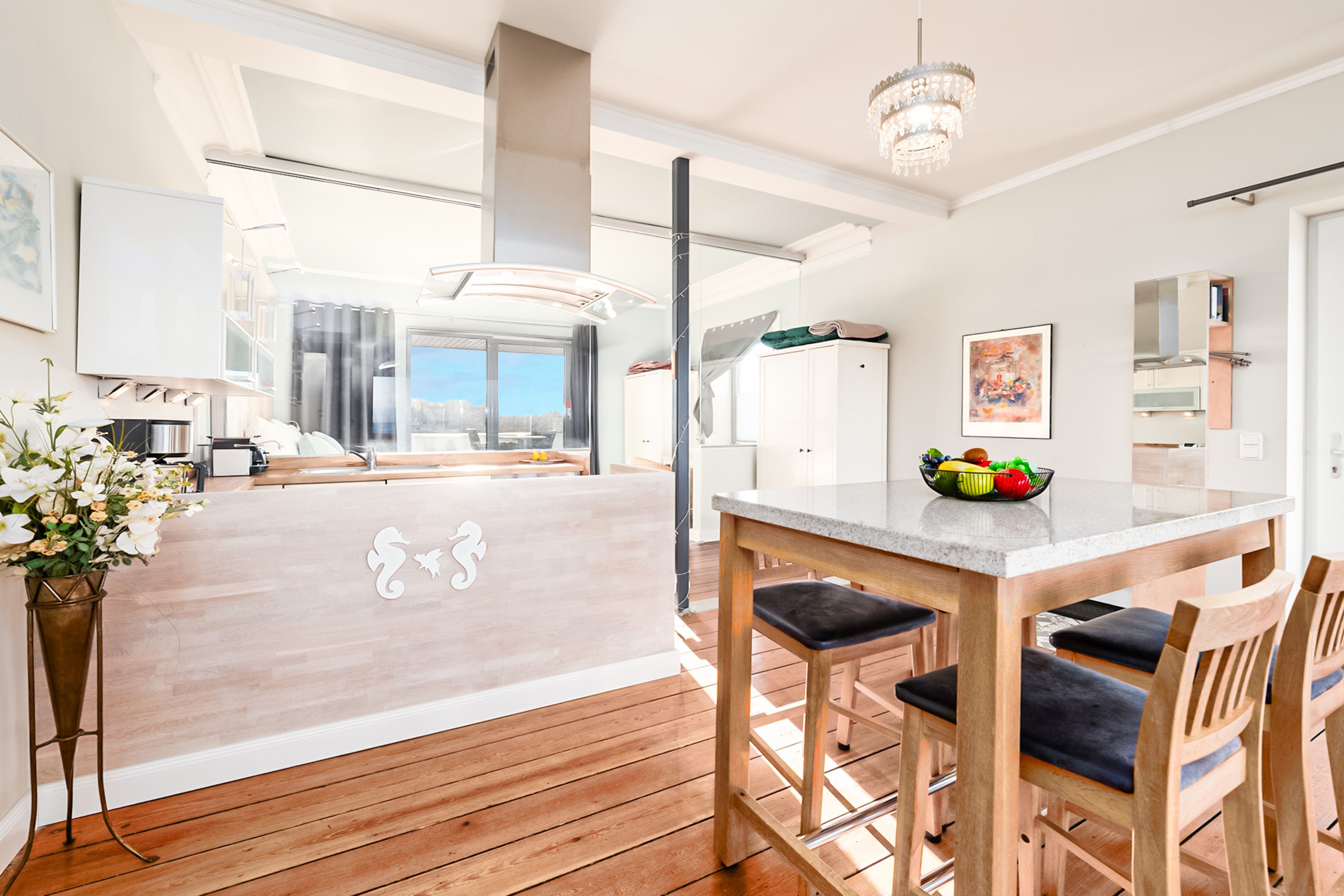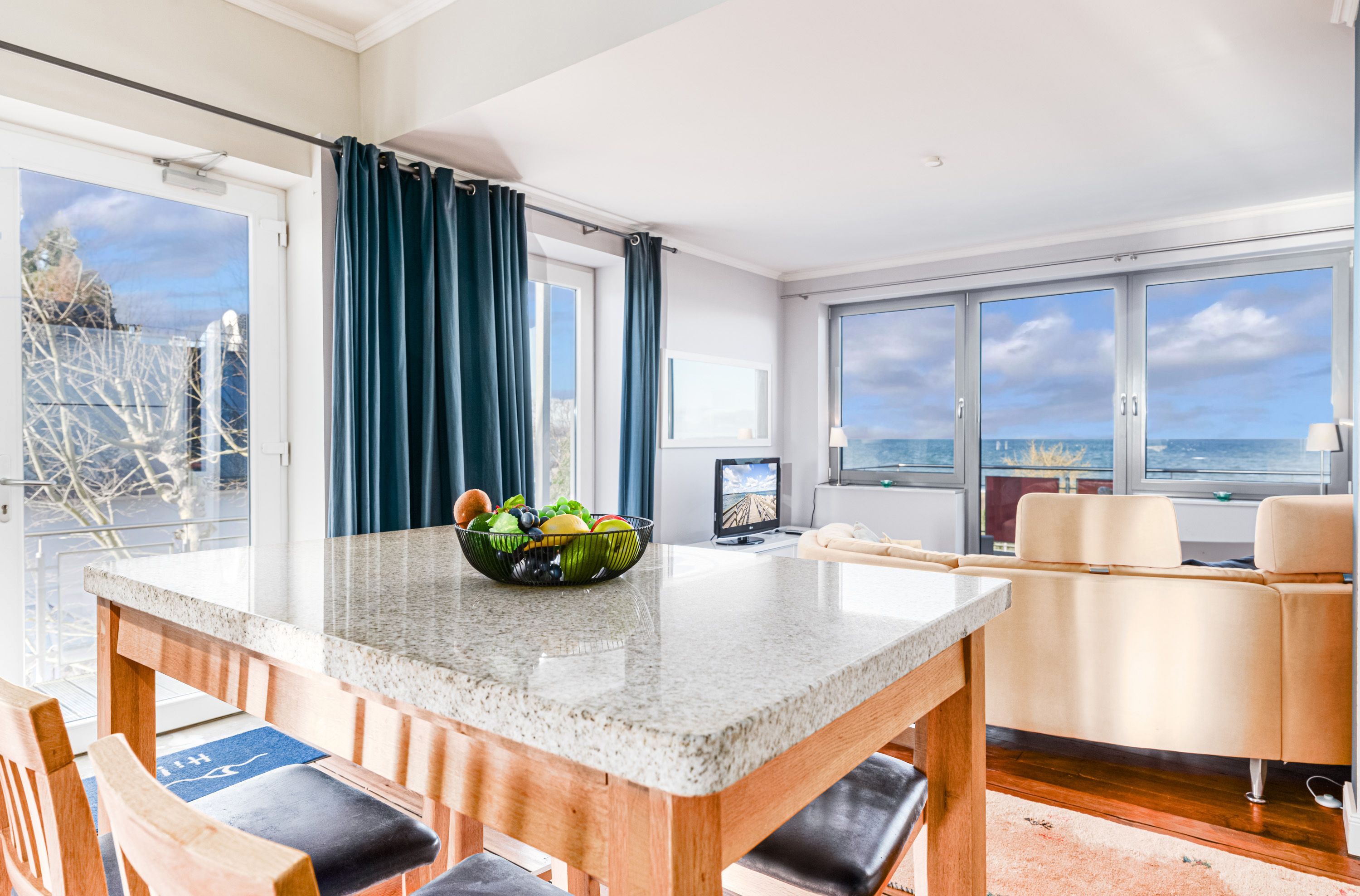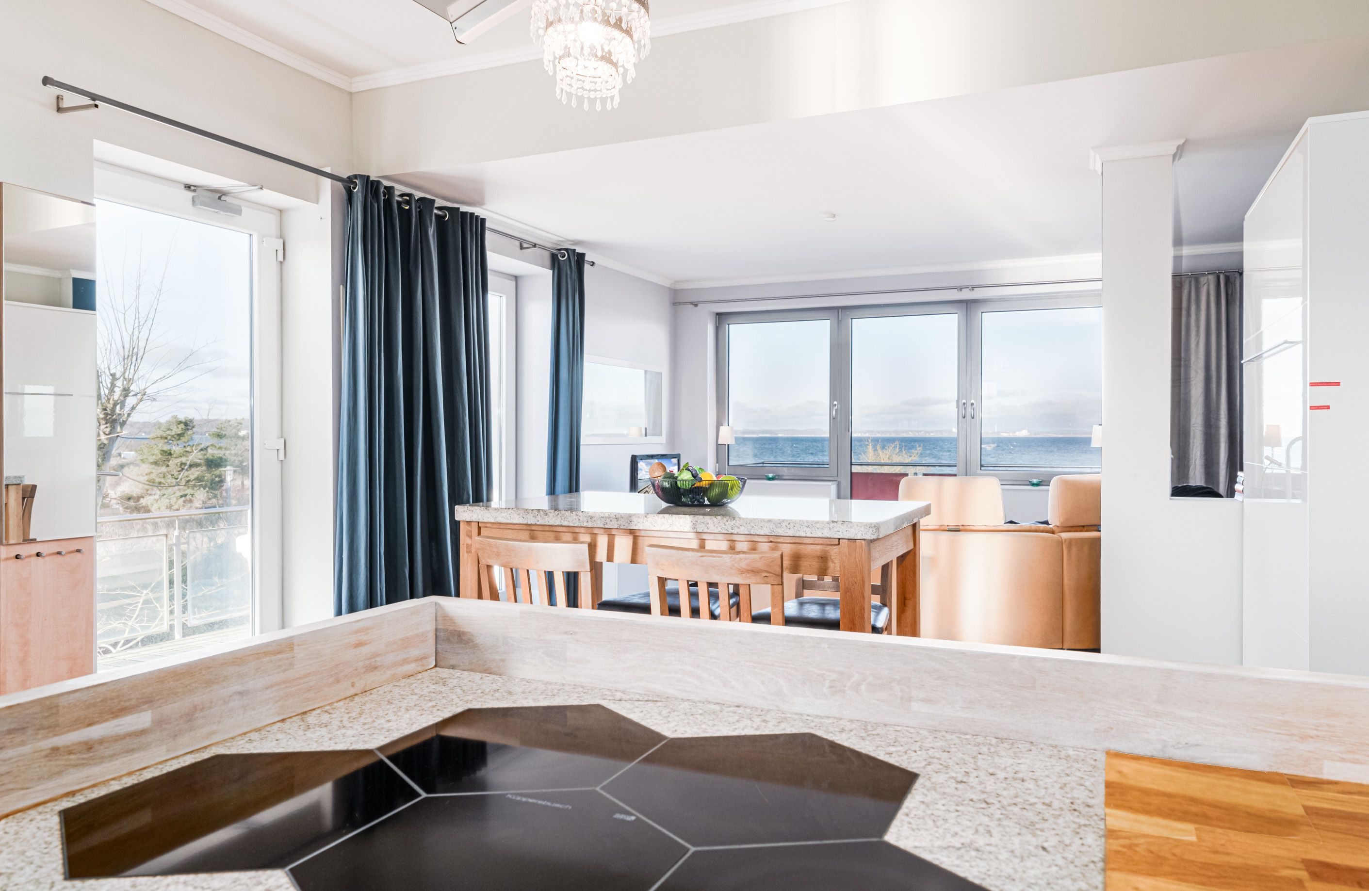 Das Feriendomizil im 1. OG ist über eine Außentreppe am Haus erreichbar und bietet auf 58m² viel Platz für bis zu zwei Personen. Das Appartement ist sehr hochwertig ausgestattet und durch die beiden Balkone, einer davon überdacht, erleben Sie spektakuläre Sonnenauf- und -untergänge sowie einen einzigartigen Blick auf den malerischen Hafen. Das Schlafzimmer ist durch eine Glasschiebewand vom Wohnraum getrennt und ermöglicht dadurch einen durchgängigen Blick vom Hafen bis zur Ostsee. Das Wohnzimmer verfügt über eine integrierte und gut ausgestattete Küche und lädt zum gemeinsamen Kochen ein.
