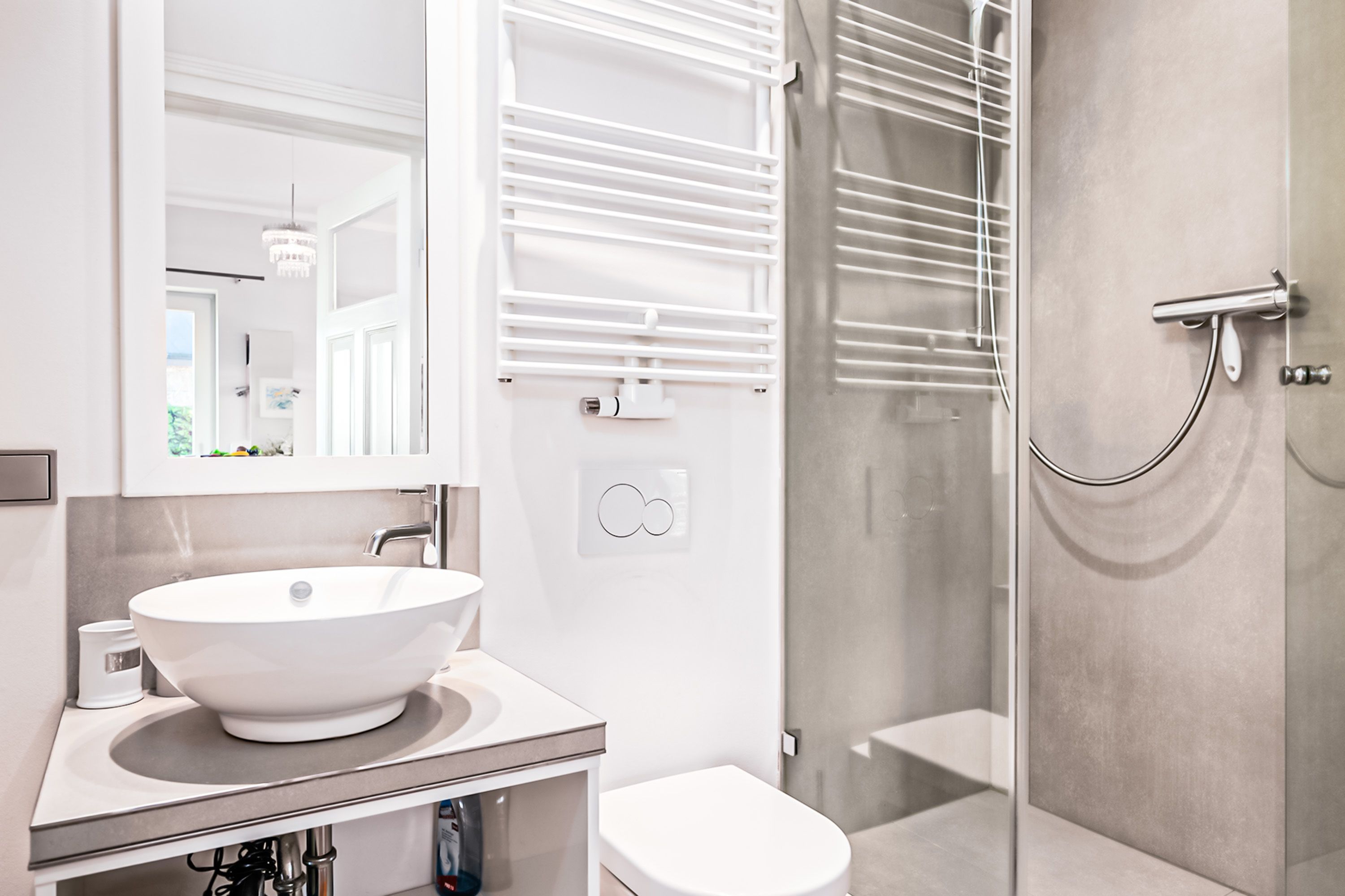 Um sich von einem erlebnisreichen Urlaubstag zu erfrischen, steht Ihnen ein kleines aber sehr geschmackvoll eingerichtetes Badezimmer mit einer Dusche und einem Handtuchtrockner zur Verfügung.