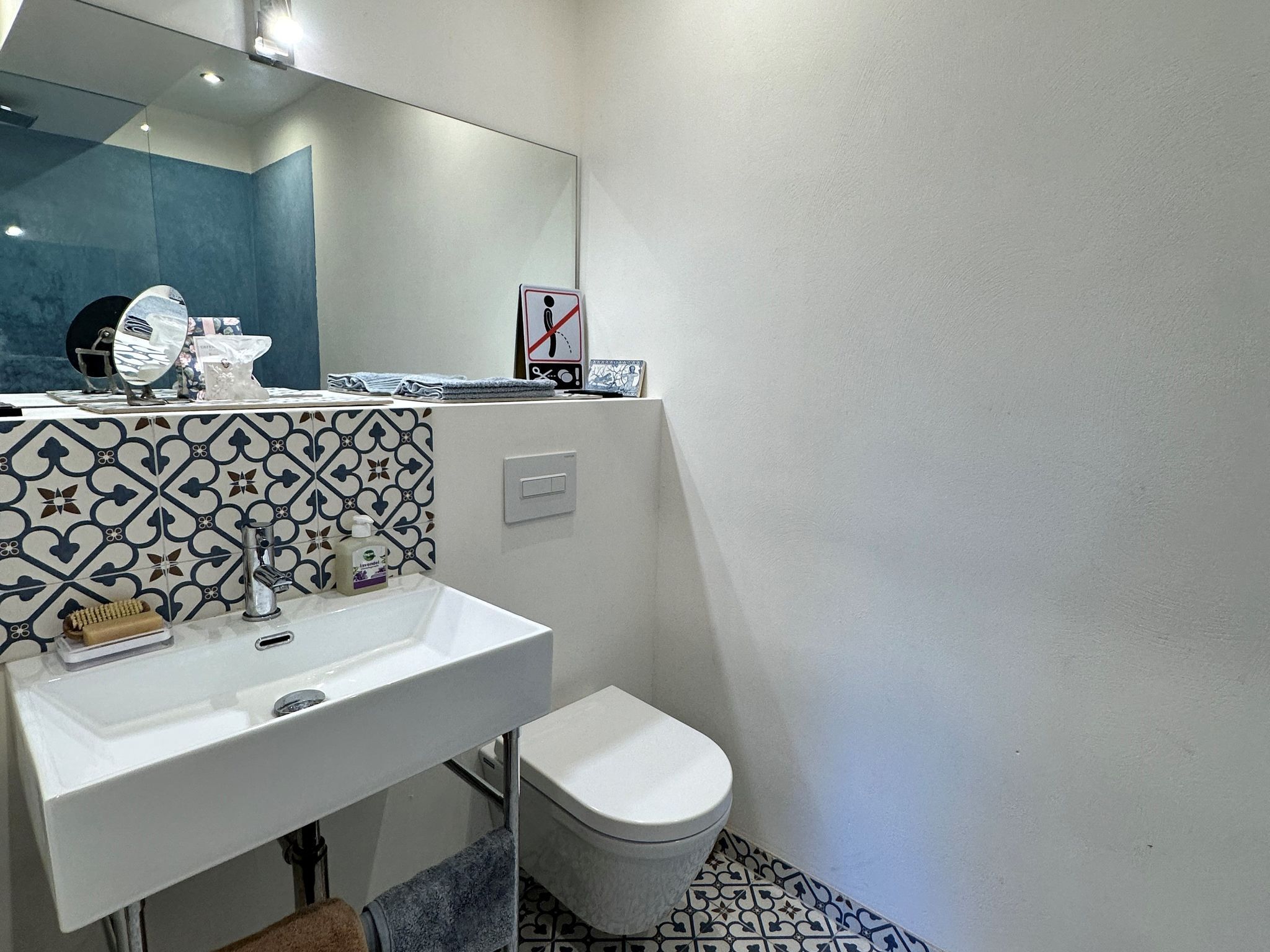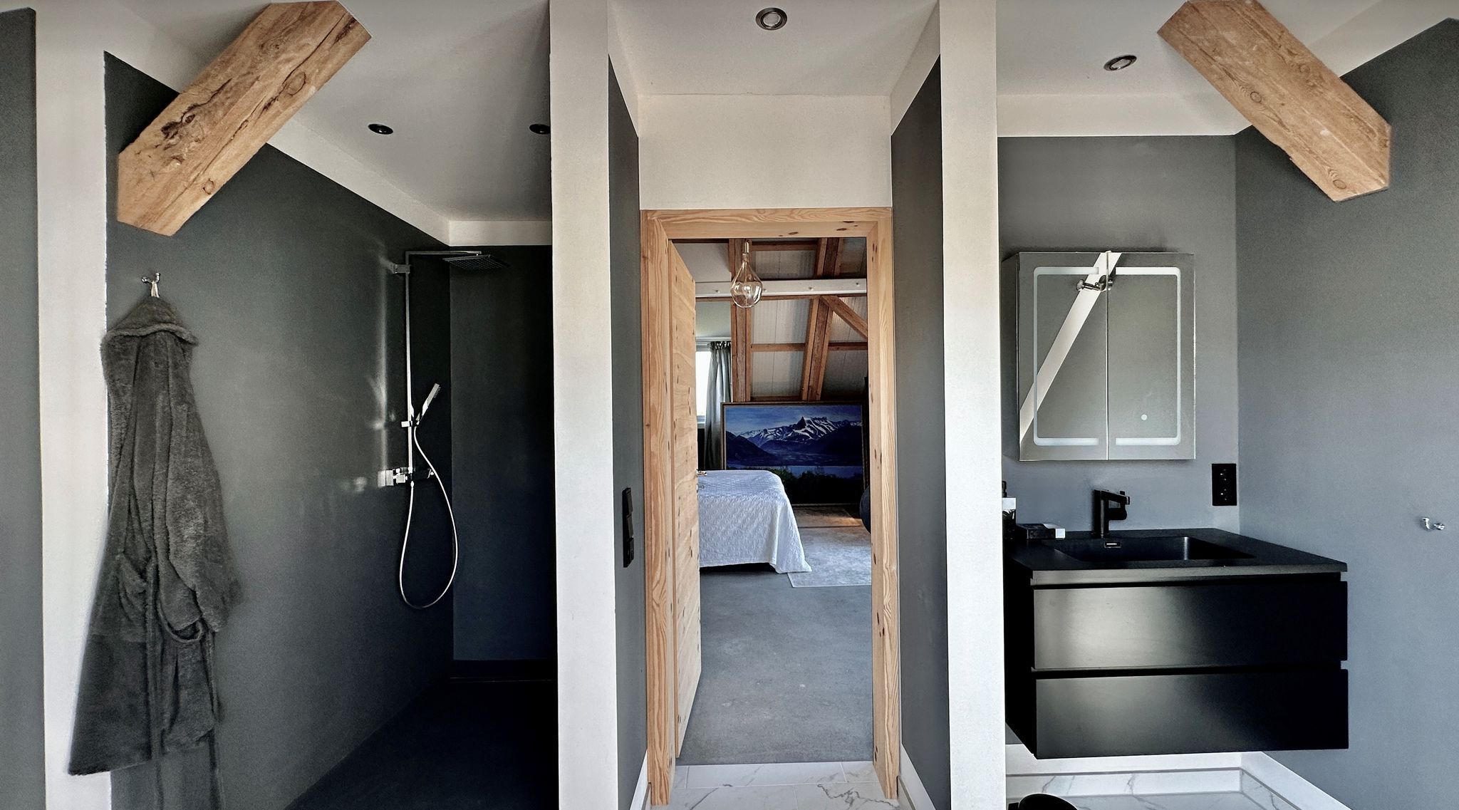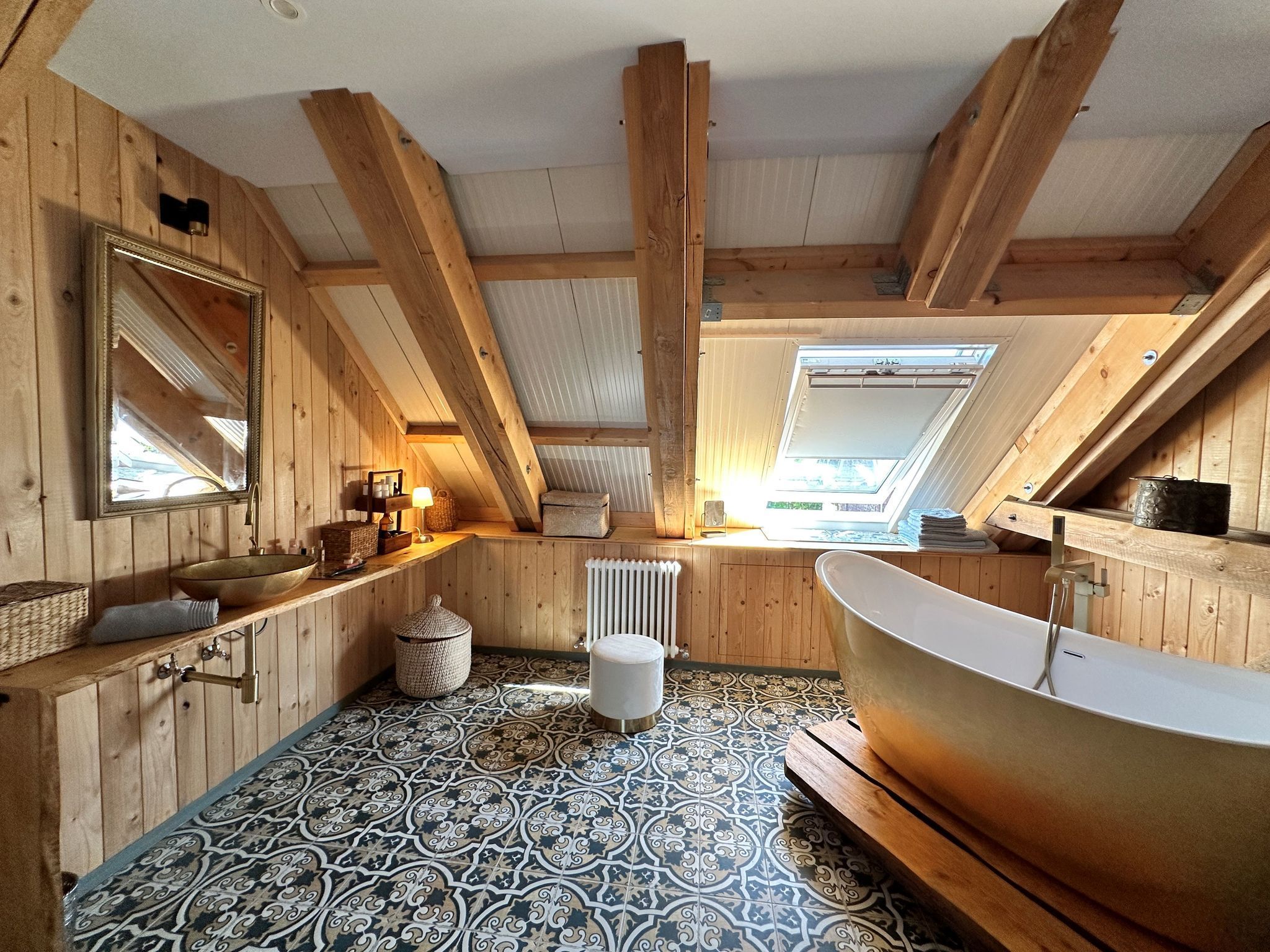 • Badezimmer-Highlights: Eine elegante Badewanne im einen, eine begehbare Dusche im anderen Zimmer.