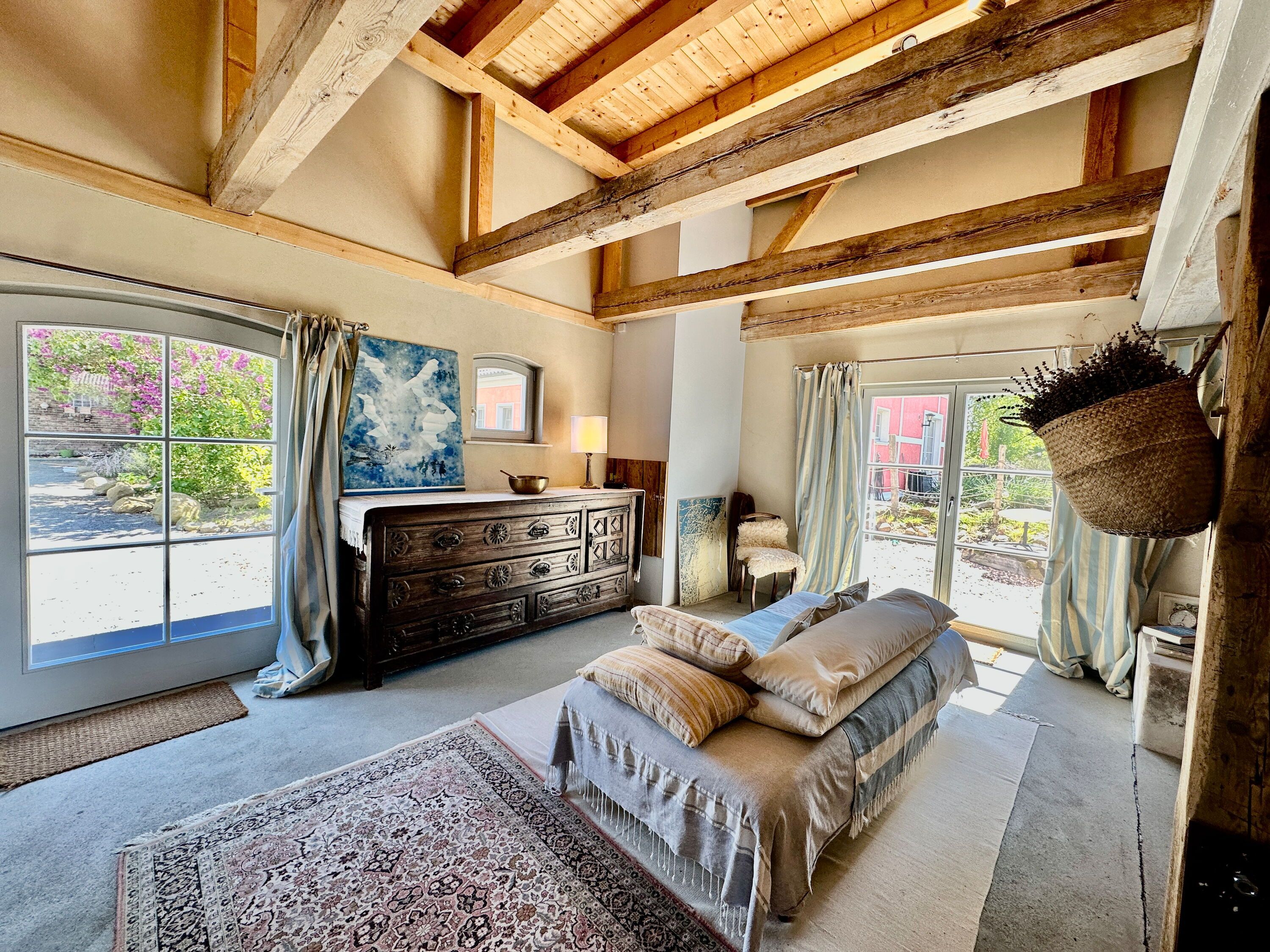 • Ein stilvolles Masterbedroom mit imposanter Spitzdecke und viel Raum für Erholung.