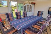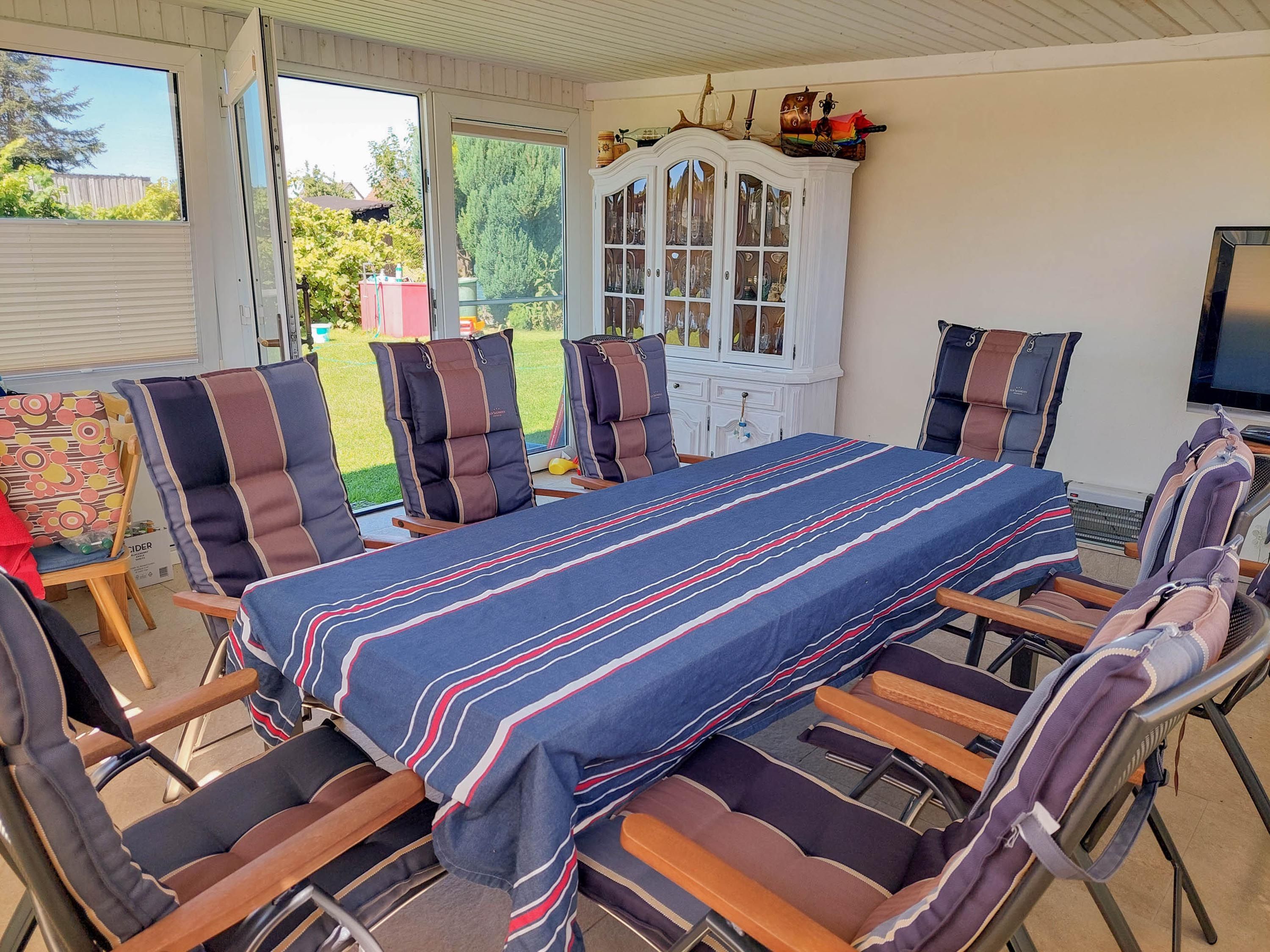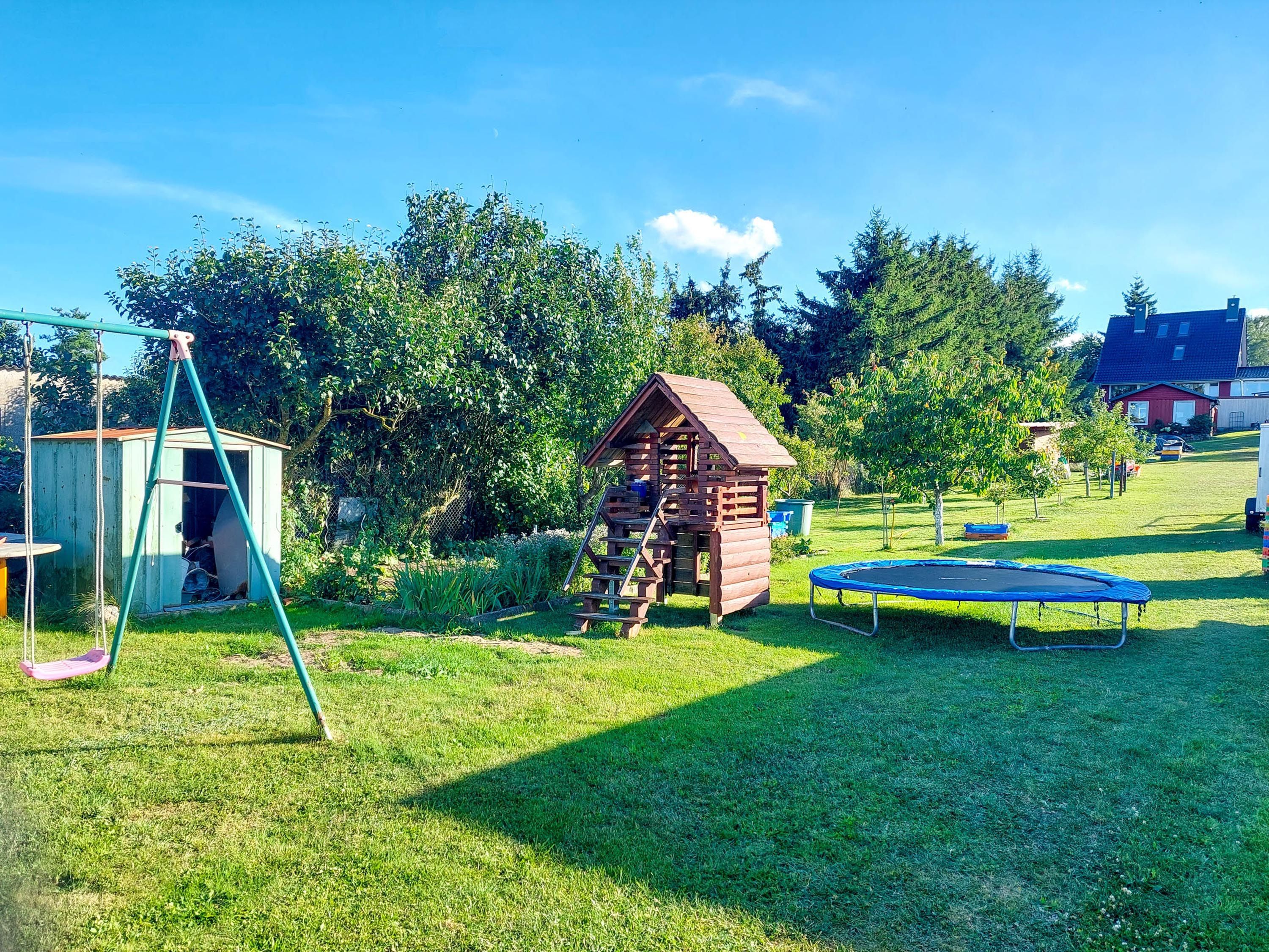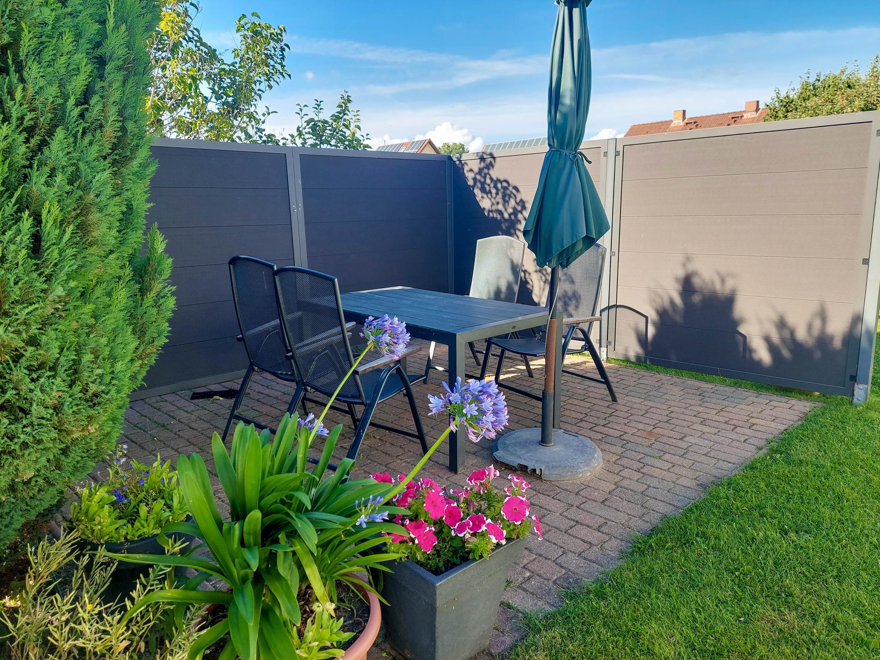 Auf dem Grundstück gibt es eine Terrasse mit Gartenmöbeln und Grill sowie Abstellmöglichkeiten für Fahrräder und Pkw.