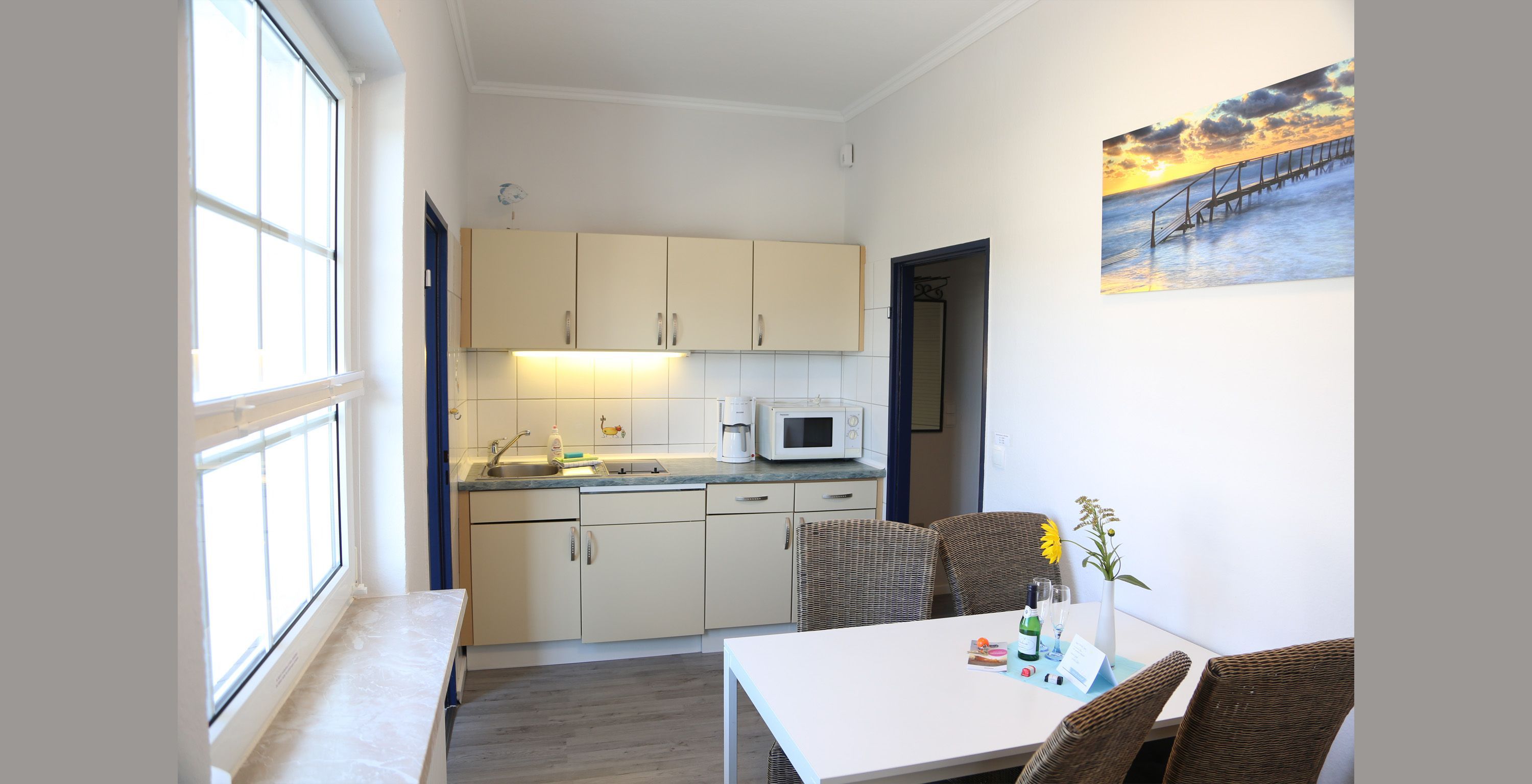 In der separaten Küche stehen eine Kaffeemaschine (Filter) und ein Kombigerät (Mikrowelle/ Backofen) zur Verfügung.