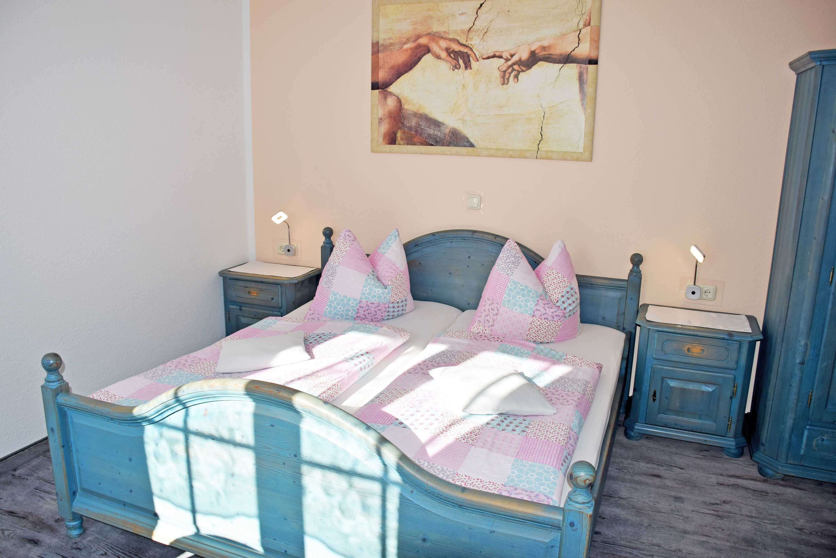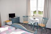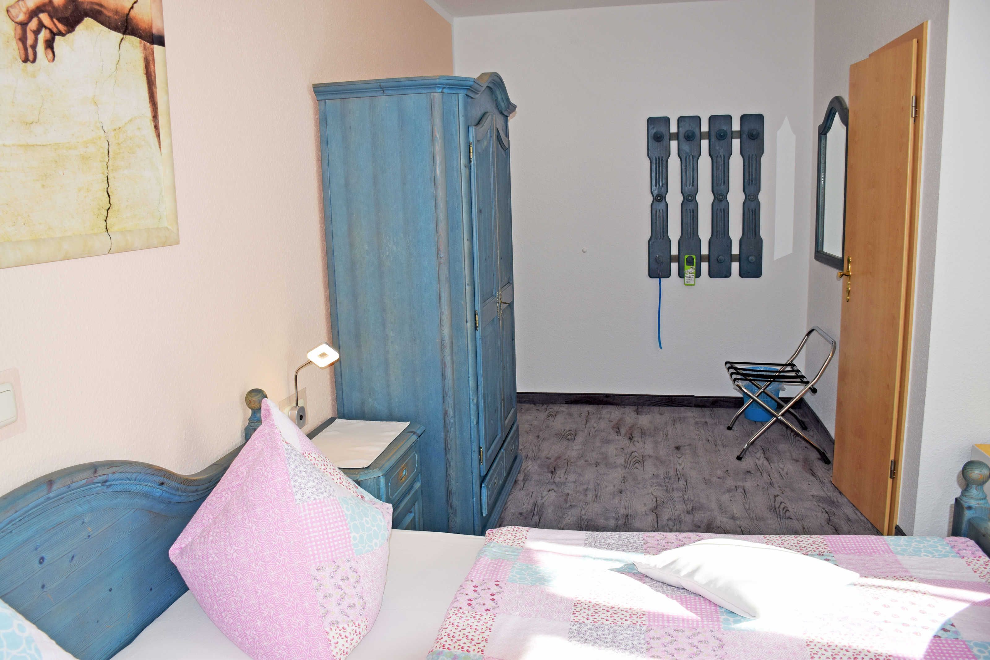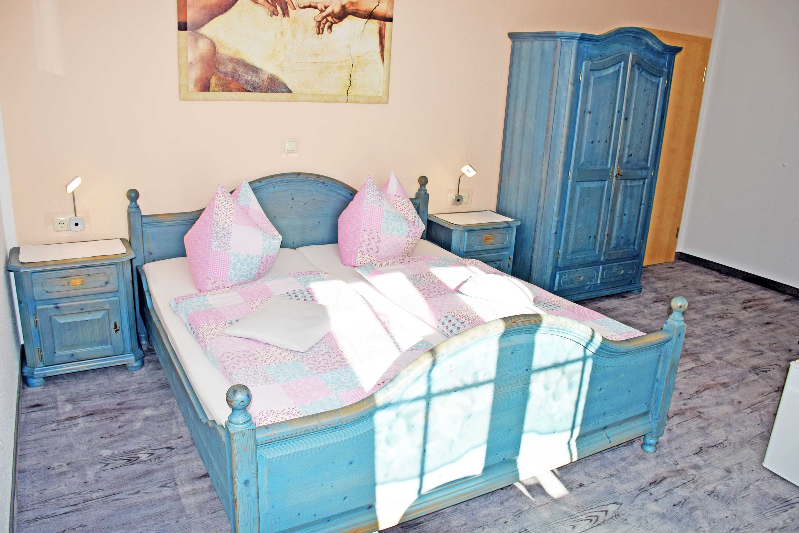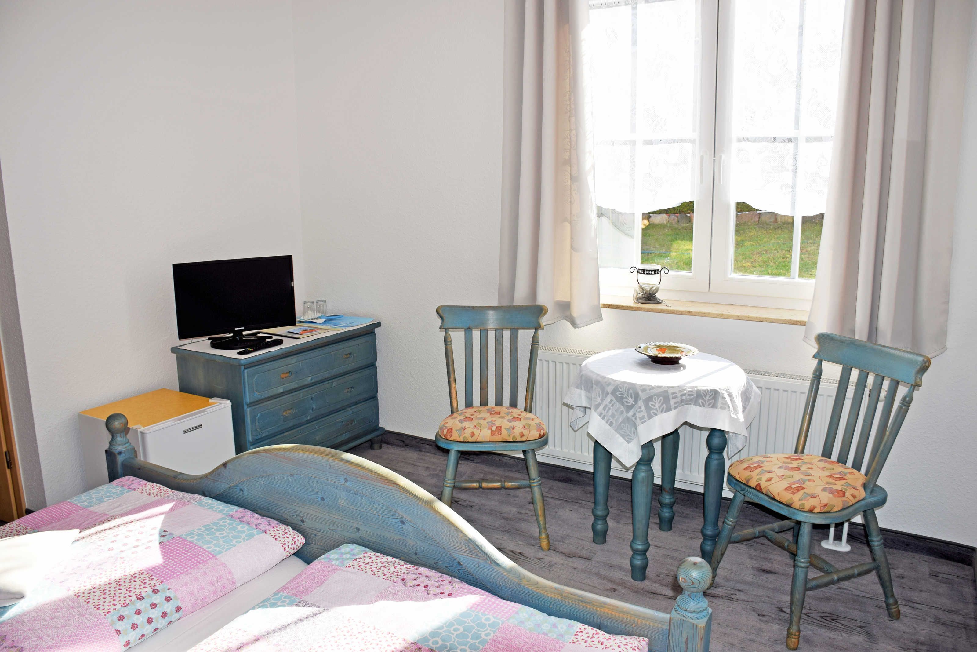 Unsere modern eingerichteten Doppelzimmer (21 qm) sind mit rustikalen Bauernmöbeln komfortabel ausgestattet und in den Farben Blau oder Grün gehalten. Zur Ausstattung gehören bequeme Doppelbetten mit Nachttischen und Leselampen, Sitzmöbel mit Tisch, Kleiderschrank, Kühlschrank, Wasserkocher, Flachbild-TV und Radio.Tassen und Löffel sind ebenfalls vorhanden. Separat für alle Gäste haben wir Geschirr, wie Teller, Teetassen sowie Besteck und Geschirrhandtücher. Ab 2016 gibt es auch einen kostenlosen WLAN-Anschluss. Bei Ihrer Anreise liegen frische Handtücher bereit und die Betten sind selbstverständlich bereits mit Bettwäsche bezogen. Alle Zimmer verfügen über ein separates Bad mit Tageslicht, Dusche und WC. In unserem Frühstücksraum starten Sie den Tag mit einem ausgiebigen Frühstück vom reichhaltigem Buffet. Wir halten auch eine Auswahl an Getränken für Sie bereit.