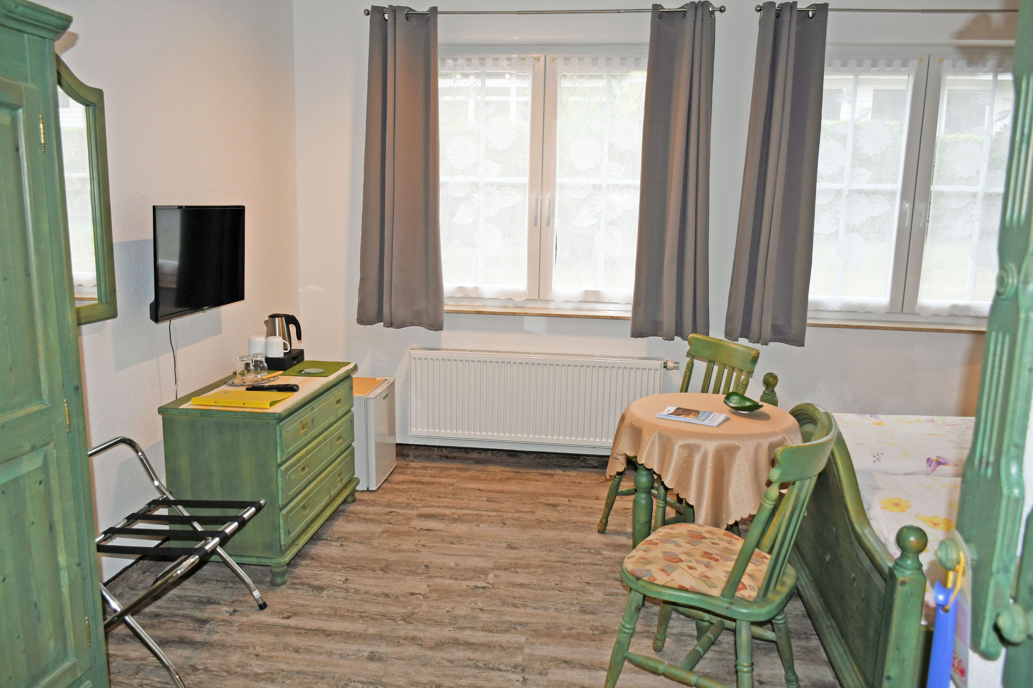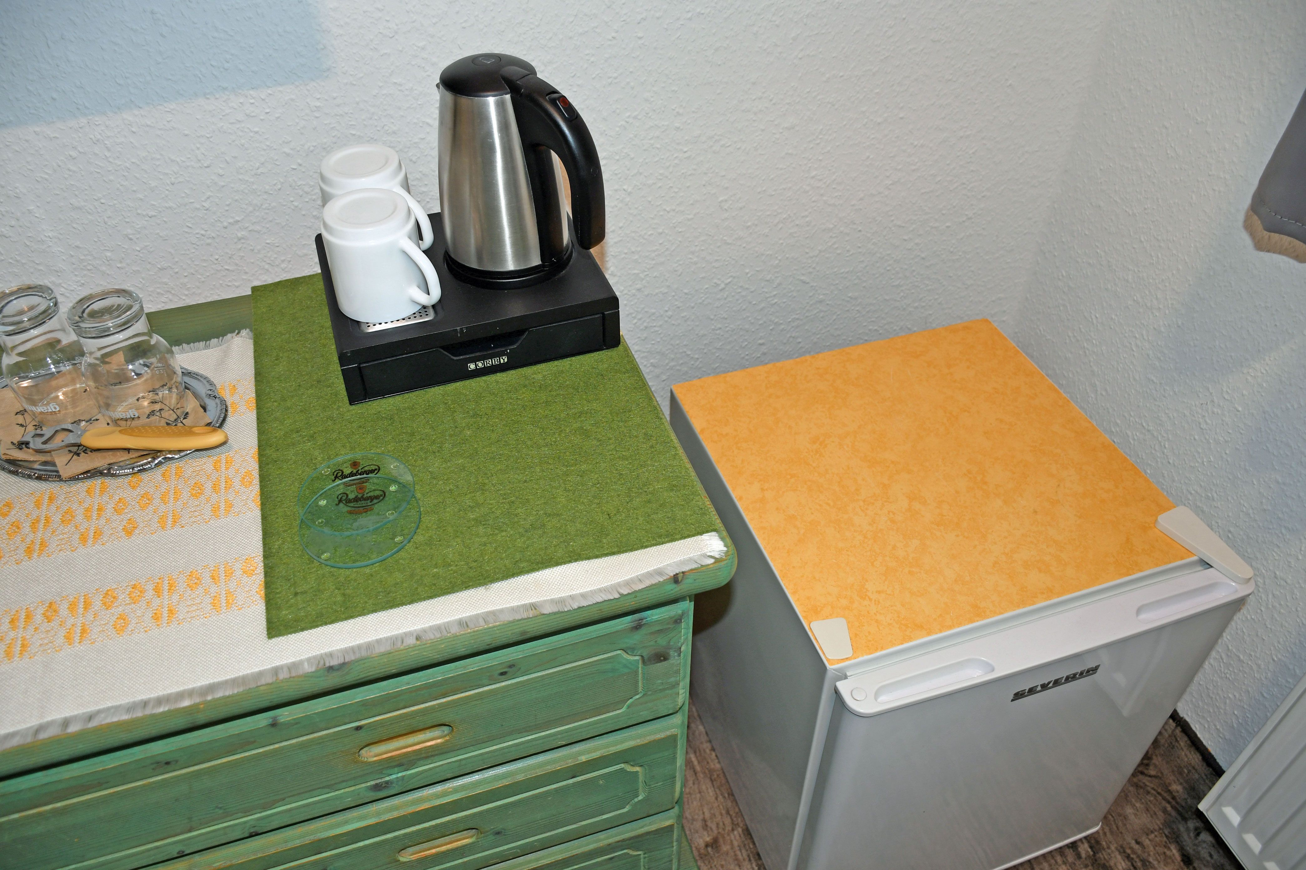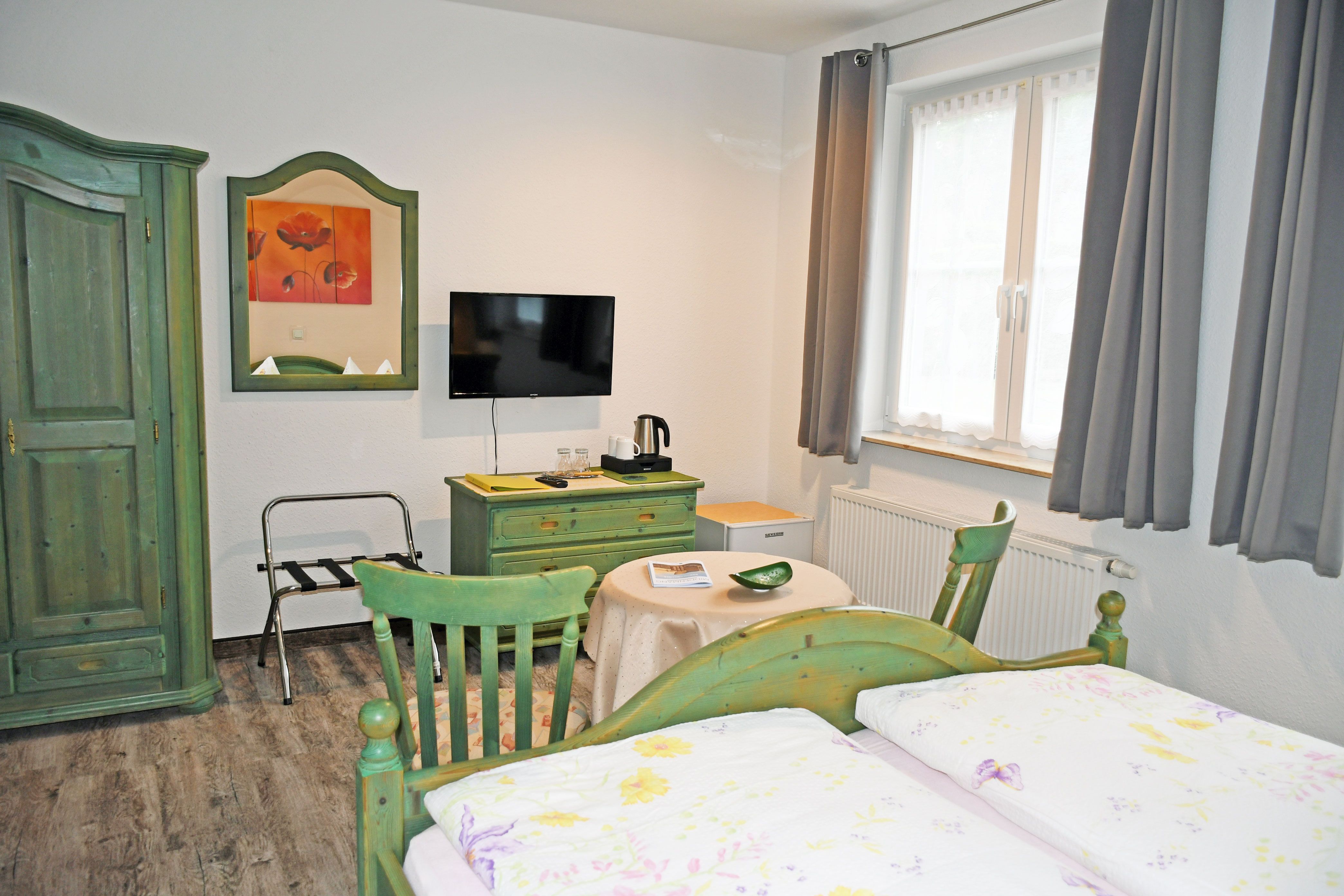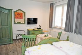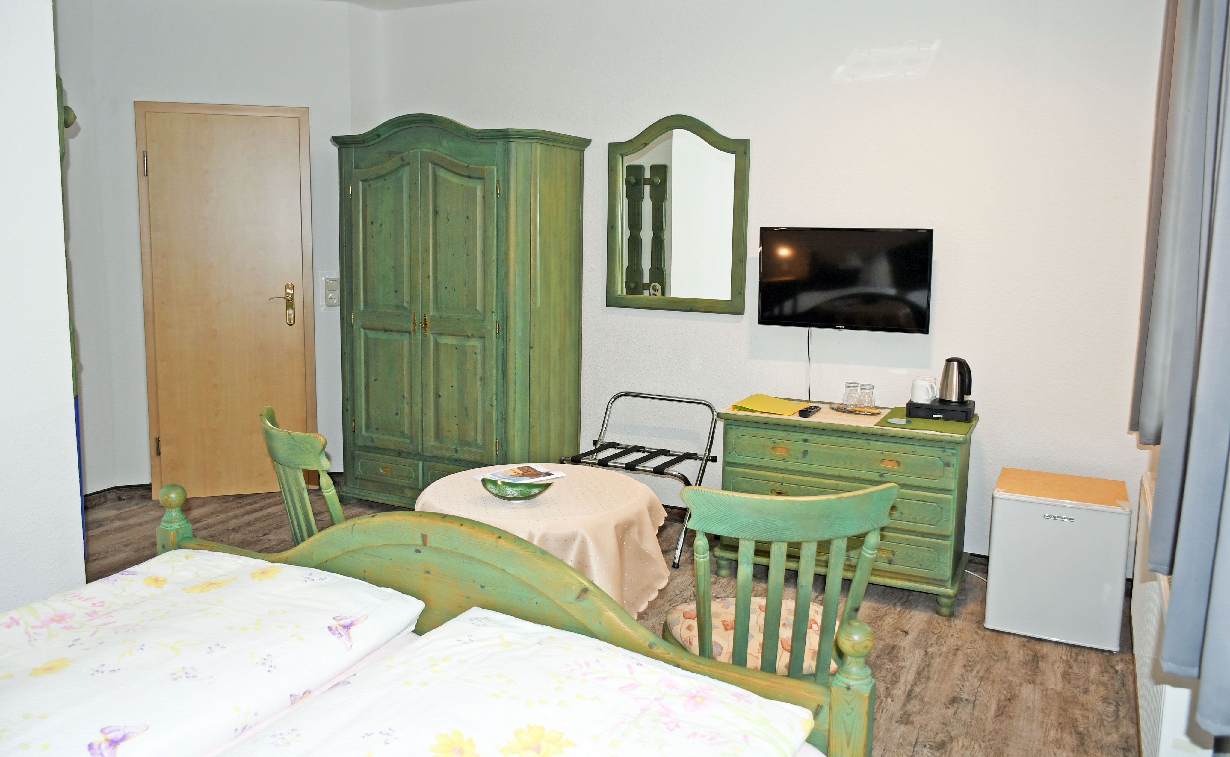 Unsere modern eingerichteten Doppelzimmer (21 qm) sind mit rustikalen Bauernmöbeln komfortabel ausgestattet und in den Farben Blau oder Grün gehalten. Zur Ausstattung gehören bequeme Doppelbetten mit Nachttischen und Leselampen, Sitzmöbel mit Tisch, Kleiderschrank, Kühlschrank, Wasserkocher, Flachbild-TV und Radio.Tassen und Löffel sind ebenfalls vorhanden. Separat für alle Gäste haben wir Geschirr, wie Teller, Teetassen sowie Besteck und Geschirrhandtücher. Ab 2016 gibt es auch einen kostenlosen WLAN-Anschluss. Bei Ihrer Anreise liegen frische Handtücher bereit und die Betten sind selbstverständlich bereits mit Bettwäsche bezogen. Alle Zimmer verfügen über ein separates Bad mit Tageslicht, Dusche und WC. In unserem Frühstücksraum starten Sie den Tag mit einem ausgiebigen Frühstück vom reichhaltigem Buffet. Wir halten auch eine Auswahl an Getränken für Sie bereit.