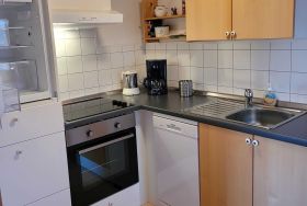 - offene Küche Ceranfeld, Backofen, Spülmaschine, Kaffeemaschine und kleiner Sitzecke