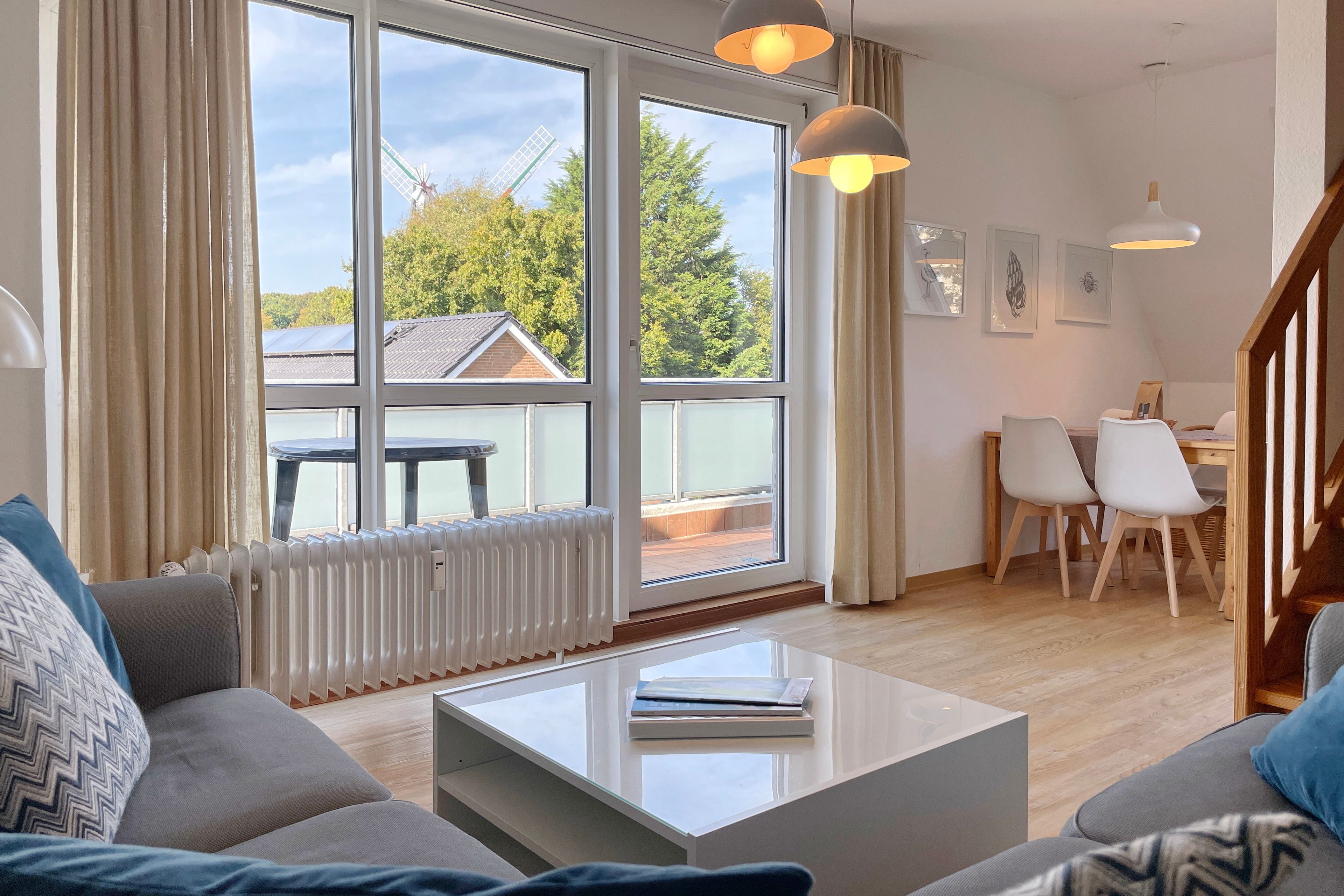 Unser Seeadler 14 ist eine helle Maisonette-Wohnung in der beliebten Anlage Seeadler am Sandwall - unweit der Wyker Innenstadt. Genießen Sie herrliche Urlaubstage in dieser charmanten Wohnung. Maritime Accessoires geben der Wohnung ihren nordfriesischen Charme. Im zweiten Stock befindet sich der Wohnraum mit einer bequemen Couch, einer integrierten Essecke und einer gut ausgestatteten Küchenzeile. Das neue Bad mit Dusche wurde Anfang 2025 renoviert. Im Schlafzimmer laden zwei Einzelbetten zum Ausschlafen ein. Auf der offenen dritten Etage befindet sich neben einer Leseecke mit Blick auf die Wyker Mühle und ein Doppelbett zum Träumen. Direkt angrenzend steht ein Etagenbett und ein Maltisch für die Kleinen bereit. Im Sommer können Sie auf dem Balkon relaxen, der von ca. Mai bis September mit Gartenmöbeln ausgestattet ist. Schauen Sie gleich nach freien Zeiten in unserem Seeadler 14 und buchen Sie Ihre erholsame Föhrer Auszeit!