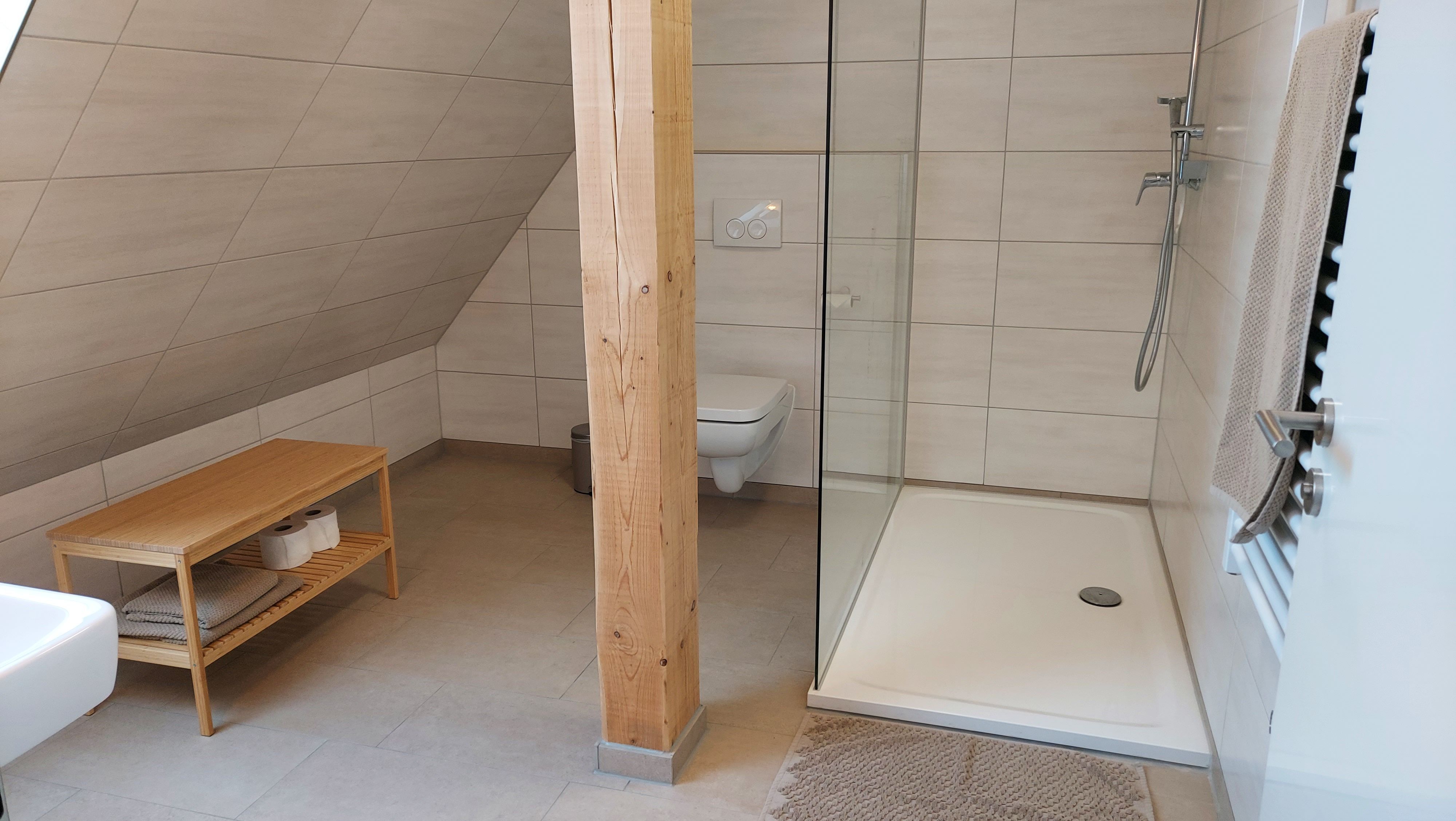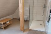 Im ersten Obergeschoss finden die Gäste einen gemütlich eingerichteten Wohnraum mit Esstisch sowie eine kleine Küche mit Loggia sowie einer weiteren Küche mit Esstisch. Beide Küchen sind sehr gut ausgestattet und verfügen je über Backofen, Kühlschrank mit kleinem Gefrierfach, 4-Platten-Herd, Kaffeemaschine, Wasserkocher und Toaster ideal für die Zubereitung von Mahlzeiten während des Aufenthalts. Ein Schlafraum mit Doppelbett (2 x 0,9 m x 2m) sowie zwei Badezimmer mit ebenerdigen Duschen und WC`s, die für zusätzlichen Komfort sorgen.