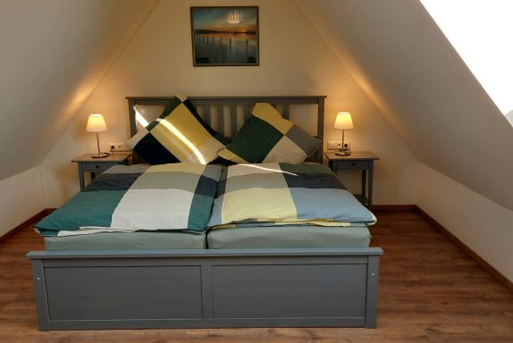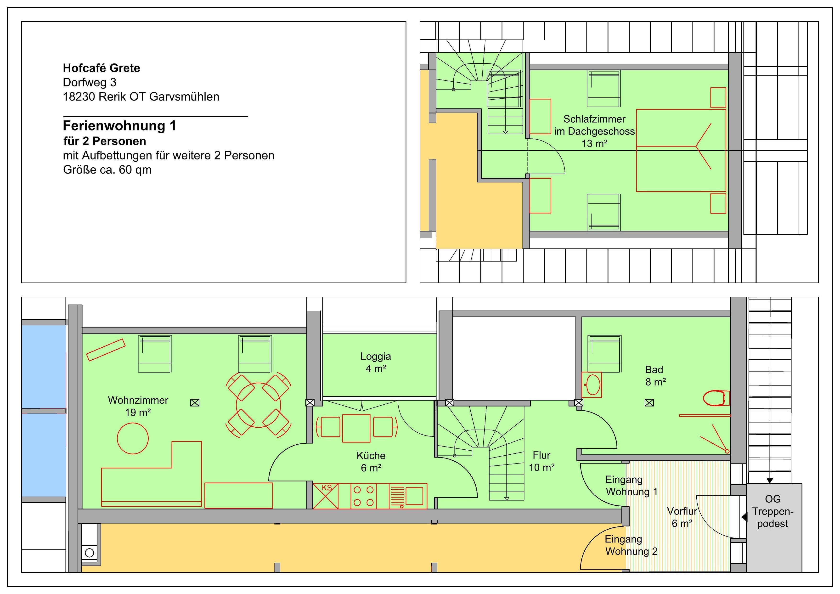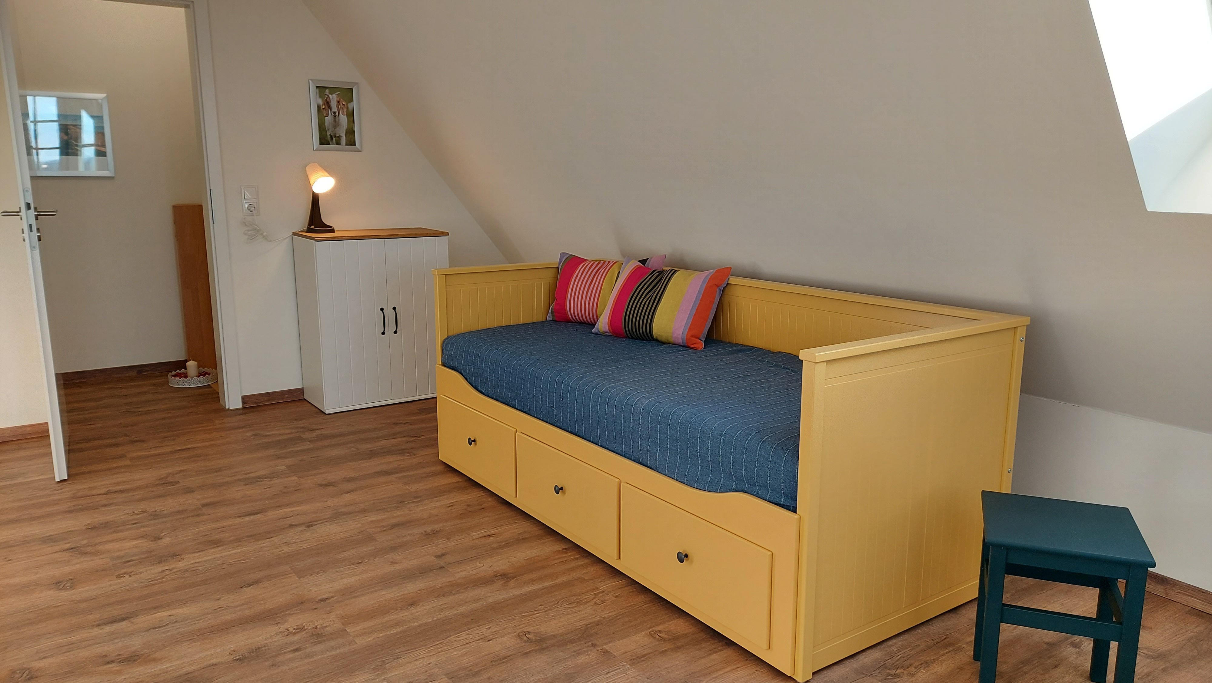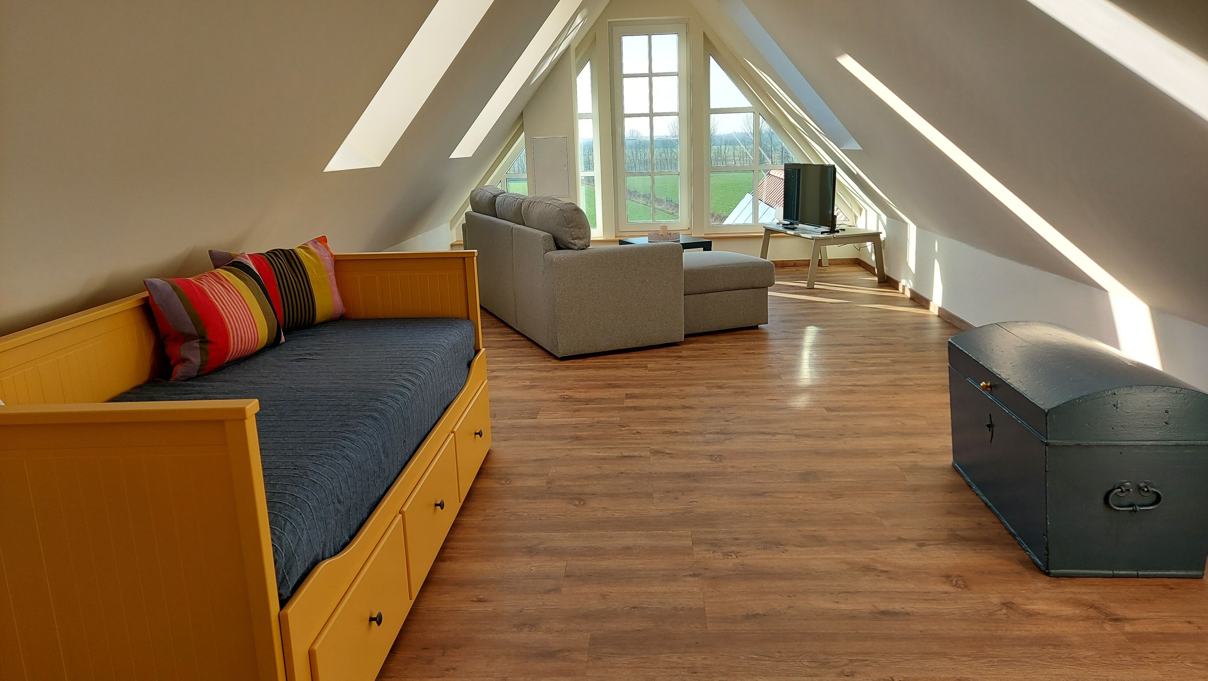 Im 2.OG: befindet sich ein weiterer Schlafraum mit Doppelbett (2 x 0,90 m x 2 m), sowie ein Wohn-/ Schlafraum mit einer Schlafcouch (1,80 m x 2 m) + 2 Einzelbetten (je 0,9 m x 2 m) und TV.