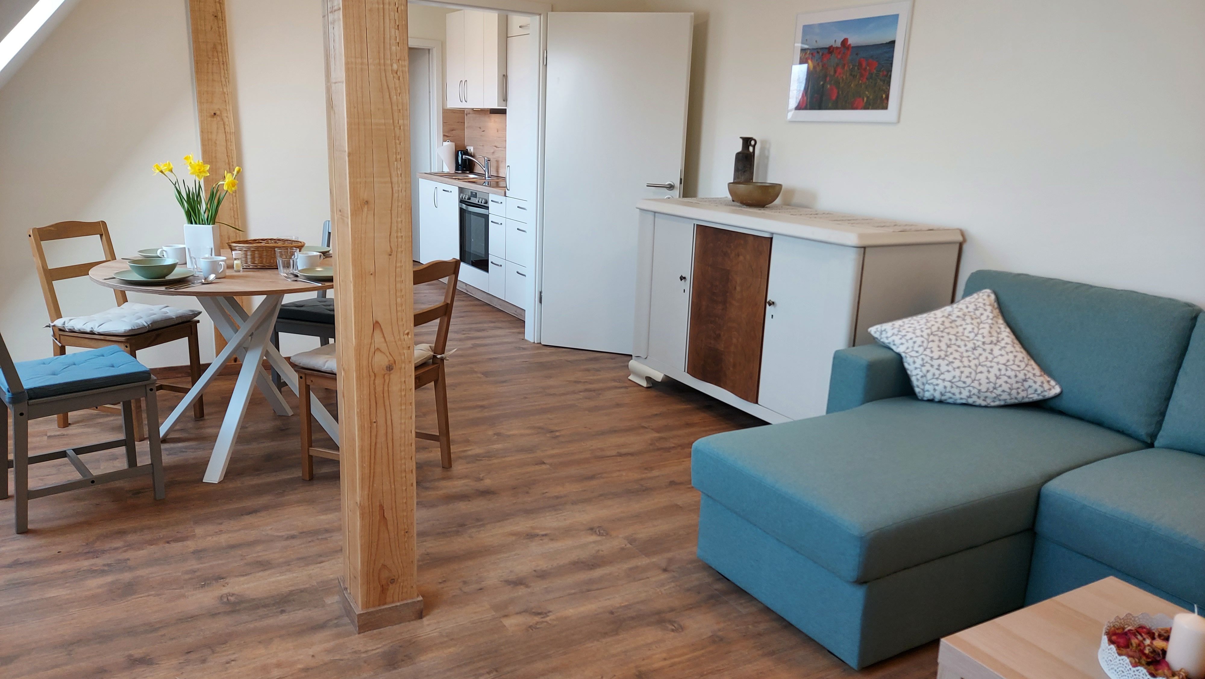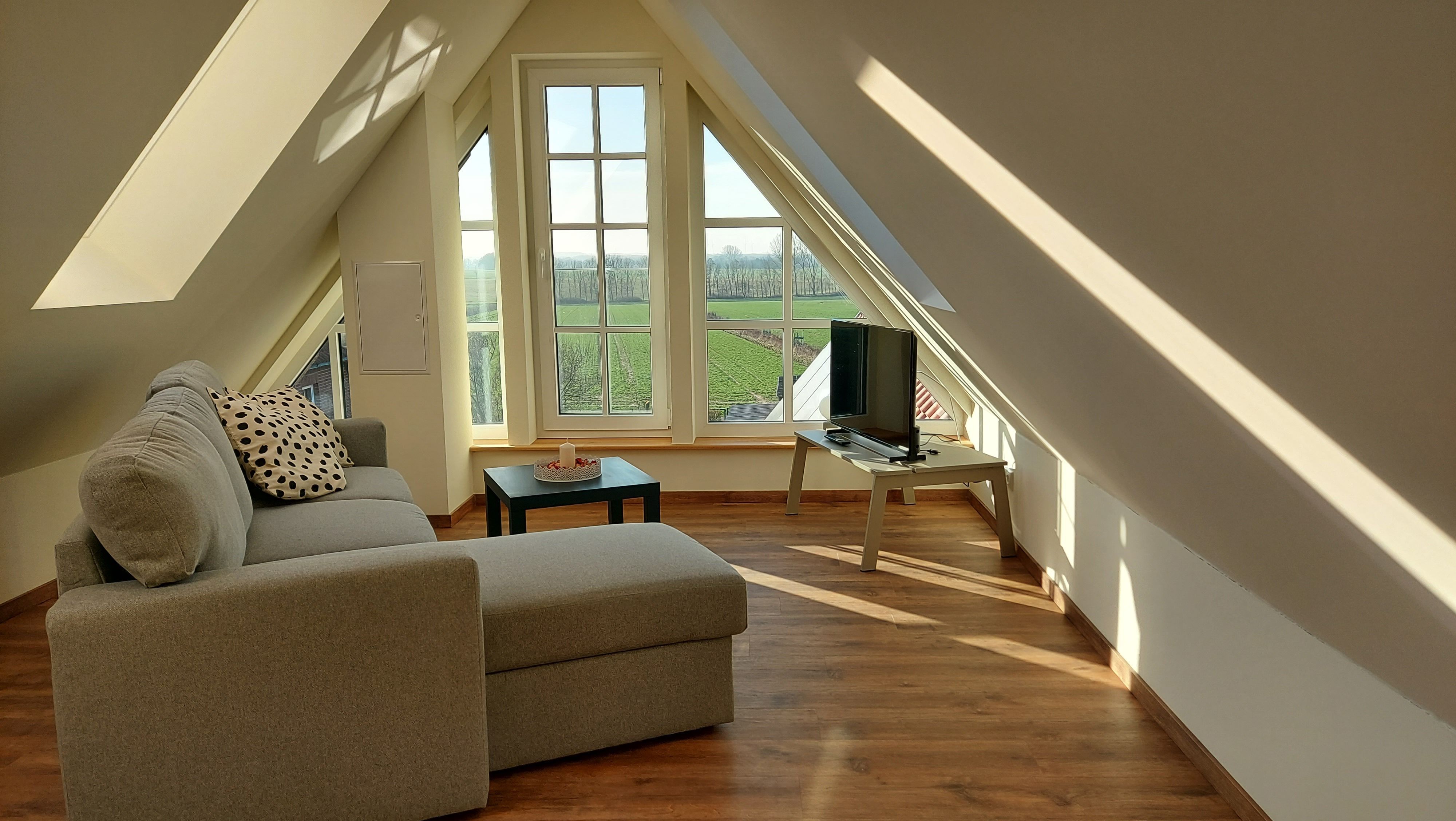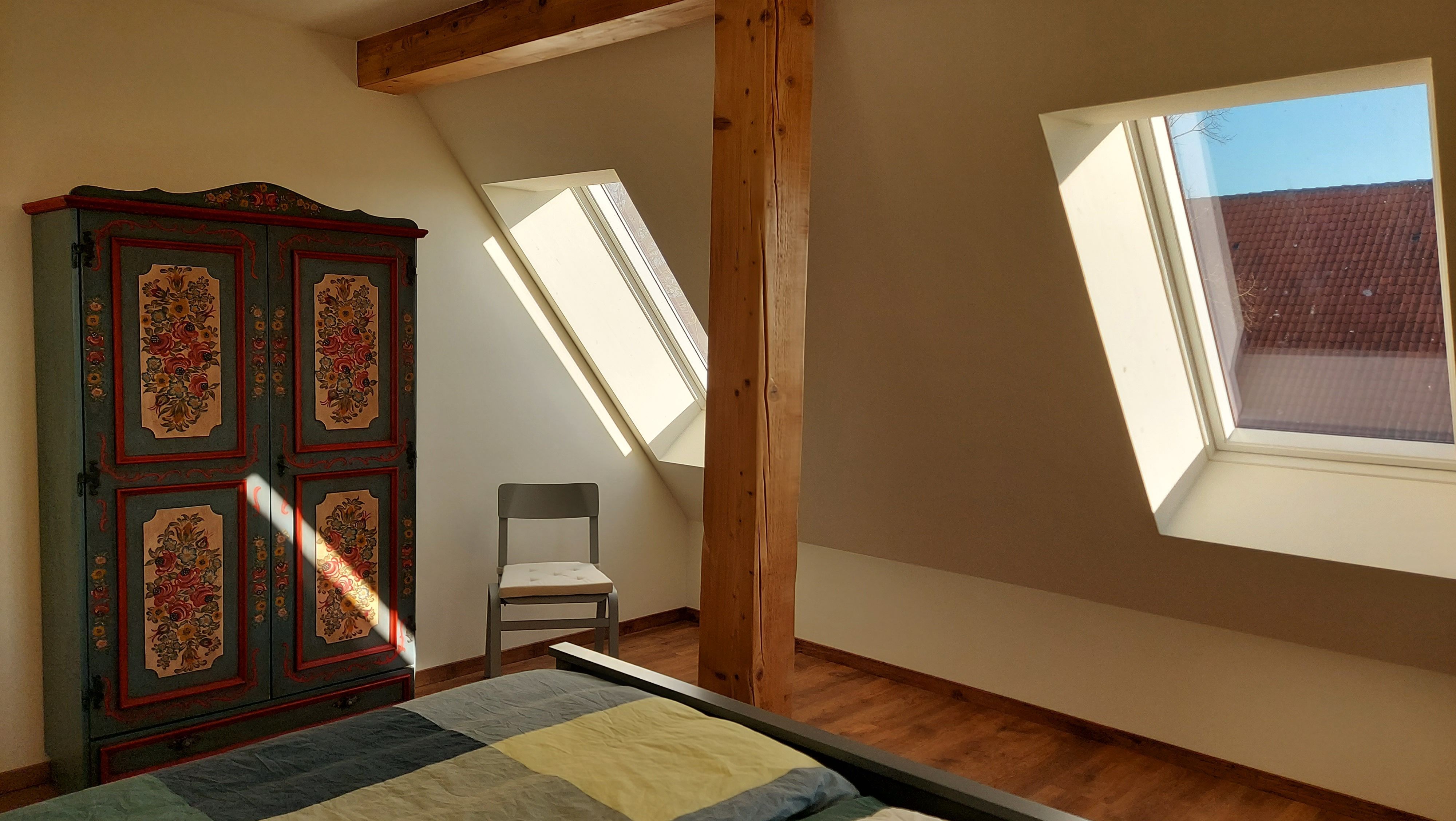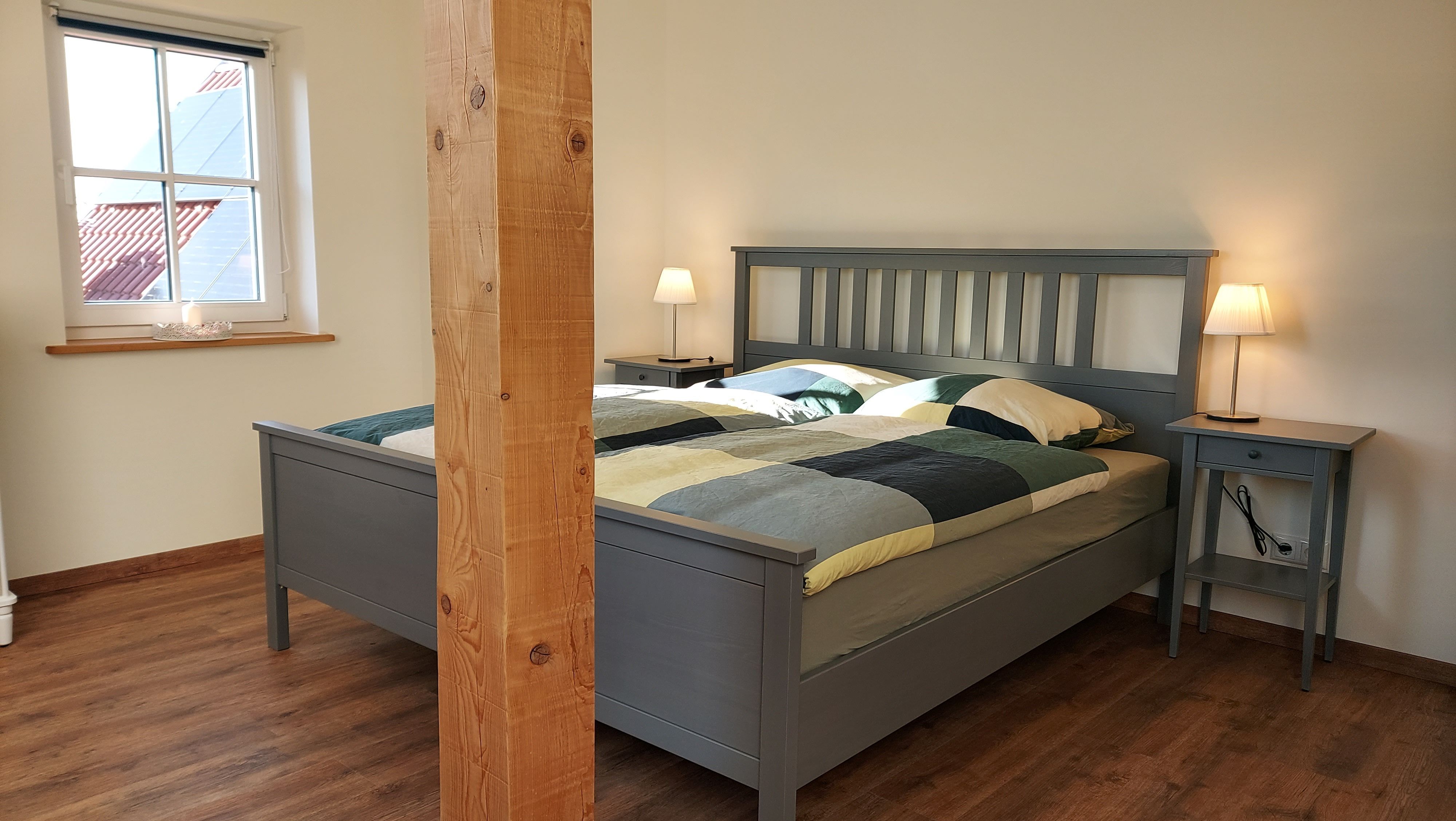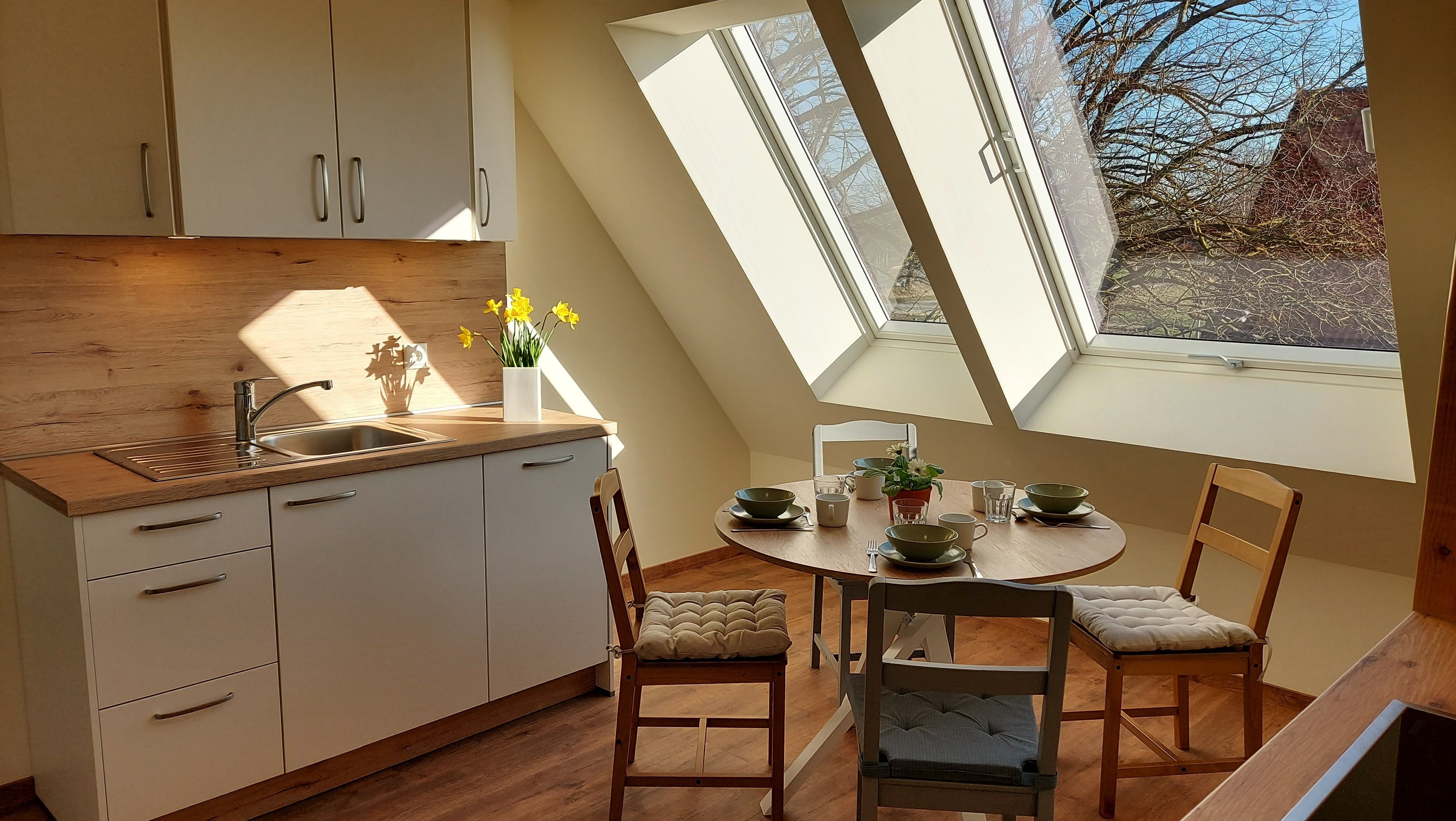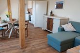 Liebevoll eingerichtete 1- und 2-Raum-Ferienwohnungen im Obergeschoss der modernisierten Scheune bieten nicht nur modernen Komfort, sondern auch einen schönen Wiesenblick. Die Möglichkeit, auf der Loggia, dem Balkon oder der Hofterrasse zu entspannen, rundet das Urlaubstag perfekt ab.