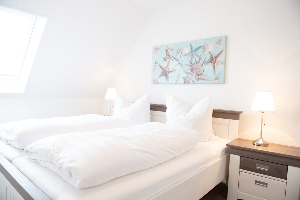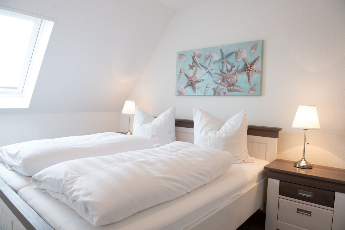Über eine gemütliche Holztreppe gelangen Sie ins 2. OG - dort sind 2 getrennte Schlafzimmer, jeweils mit einem Doppelbett, in einem Schlafzimmer ist ein Fernseher vorhanden und Aussenrolladen, im 2. Schlafzimmer ist ein Veluxfenster mit Verdunklungsplissees vorhanden.