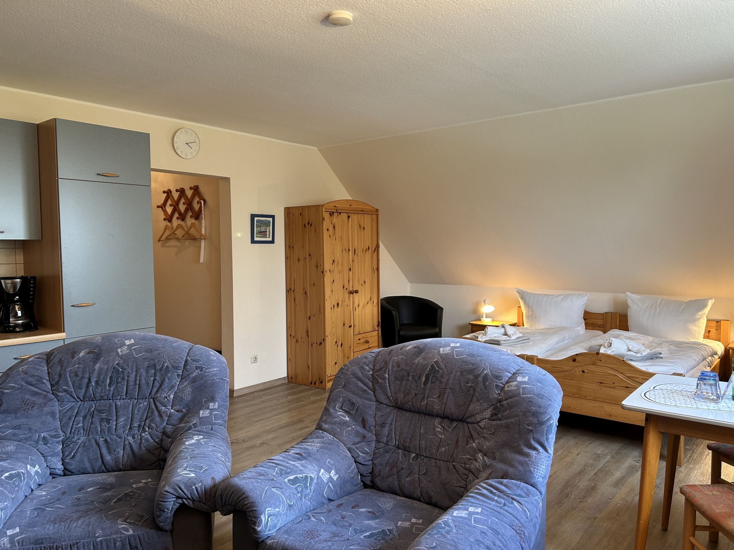 • Einraum-Apartment mit 2-Einzelbetten als Doppelbett gestellt und mit Küchenzeile