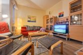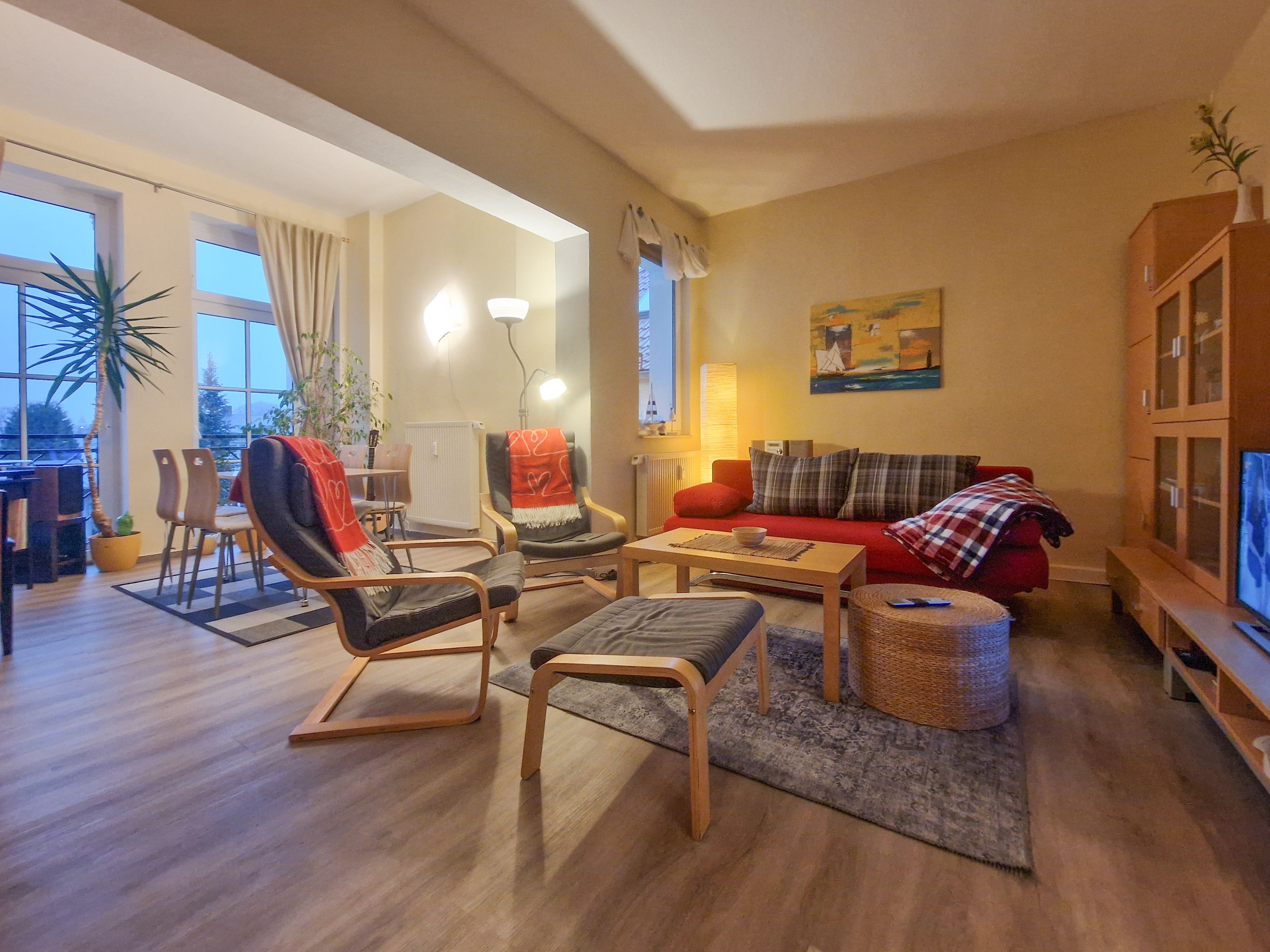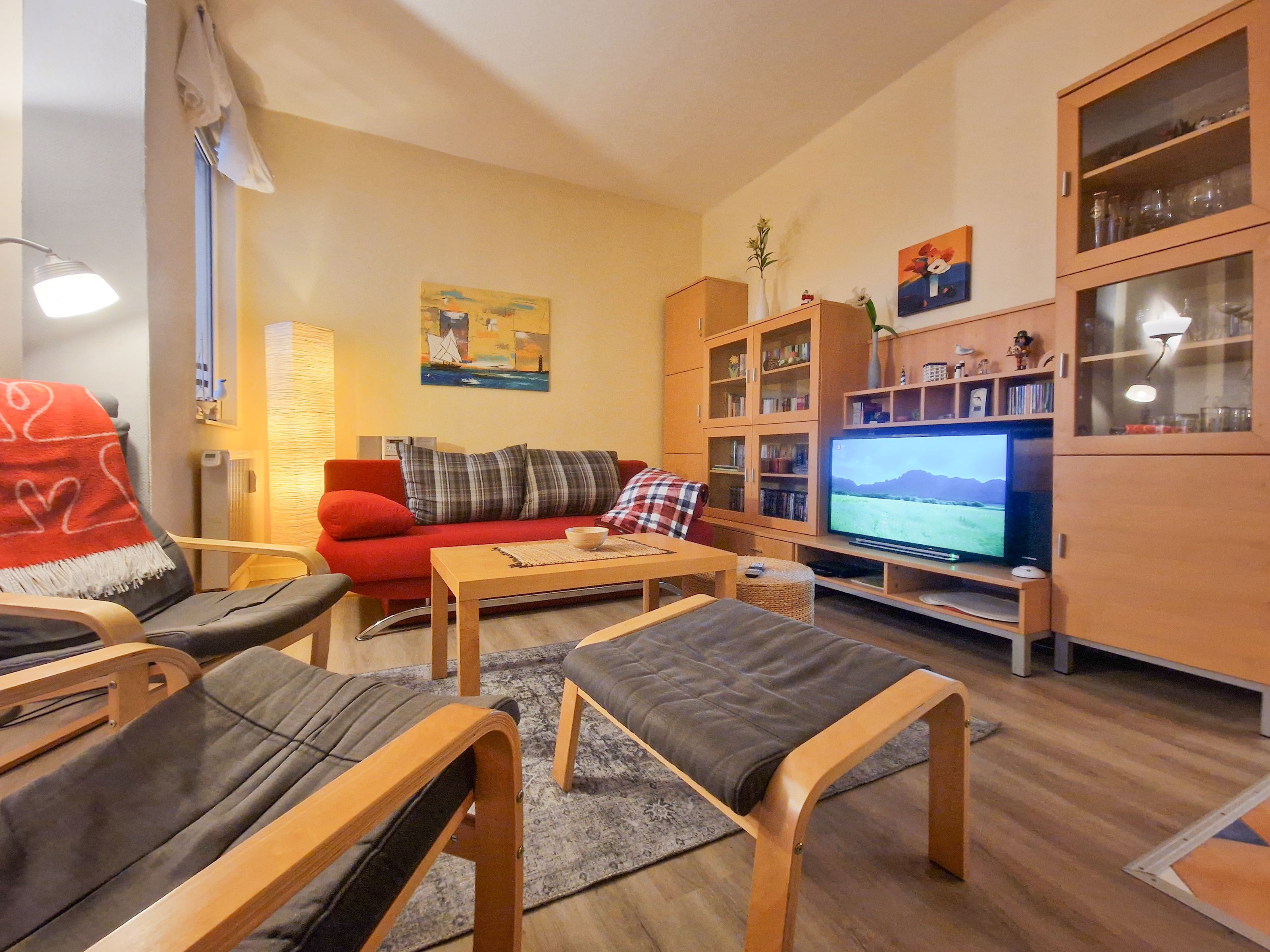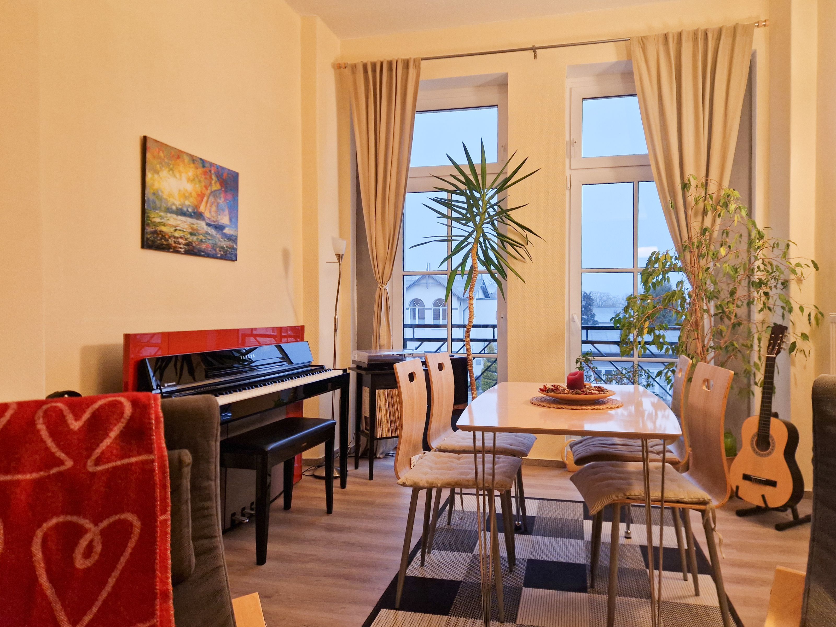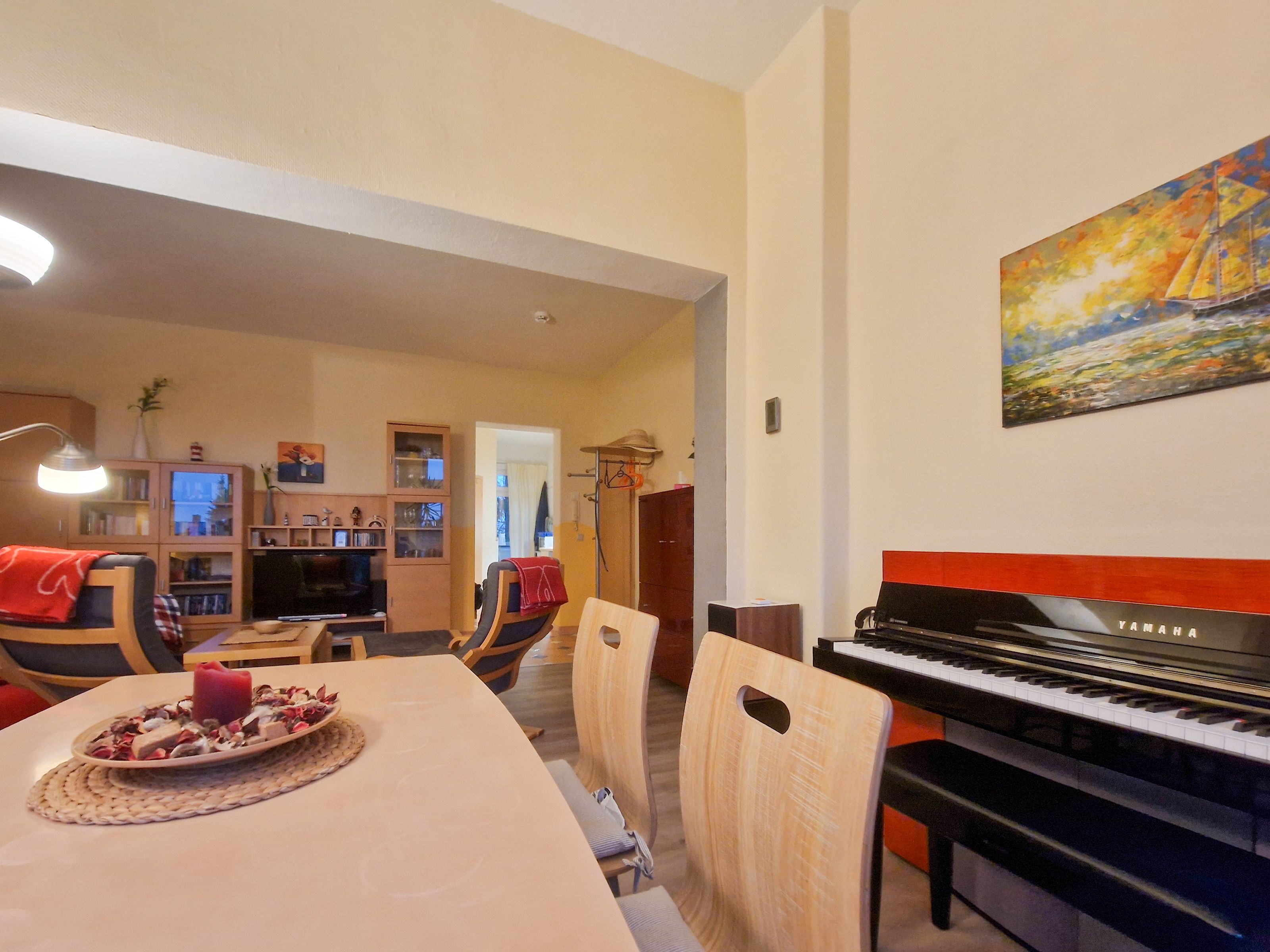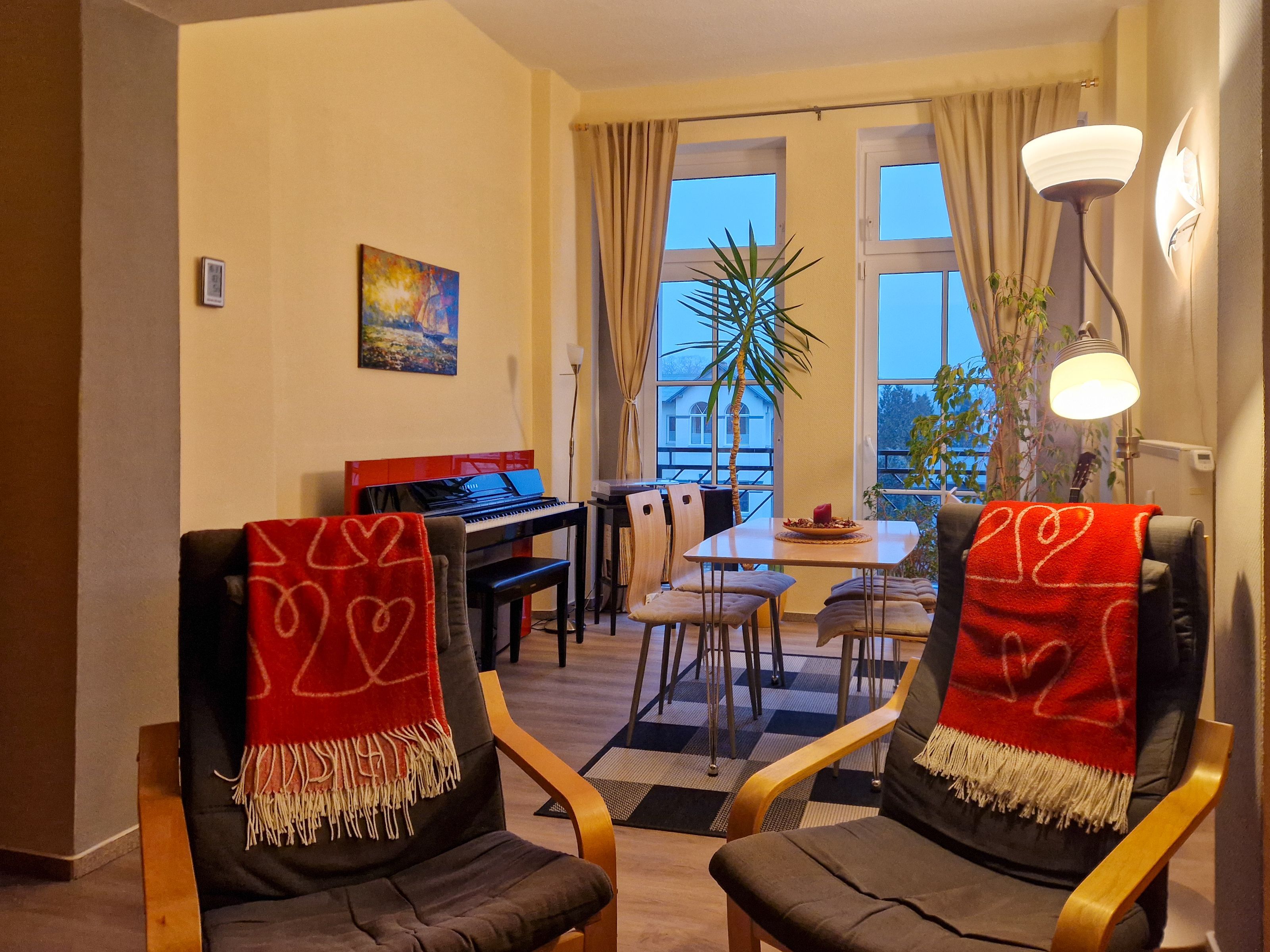 Über eine Treppe im Haupthaus gelangen Sie zur gemütlichen 53m² Ferienwohnung im Obergeschoss. Der einladende Wohnbereich erwartet Sie mit einer bequemen Couch, die bei Bedarf zur Schlafcouch umfunktioniert werden kann, einem Flat-TV und einer kleinen Bibliothek mit einem Plattenspieler sowie dem erwähnten Klavier. Am Esstisch finden vier Personen bequem Platz, um gemeinsam zu essen oder einfach die Zeit miteinander zu genießen.