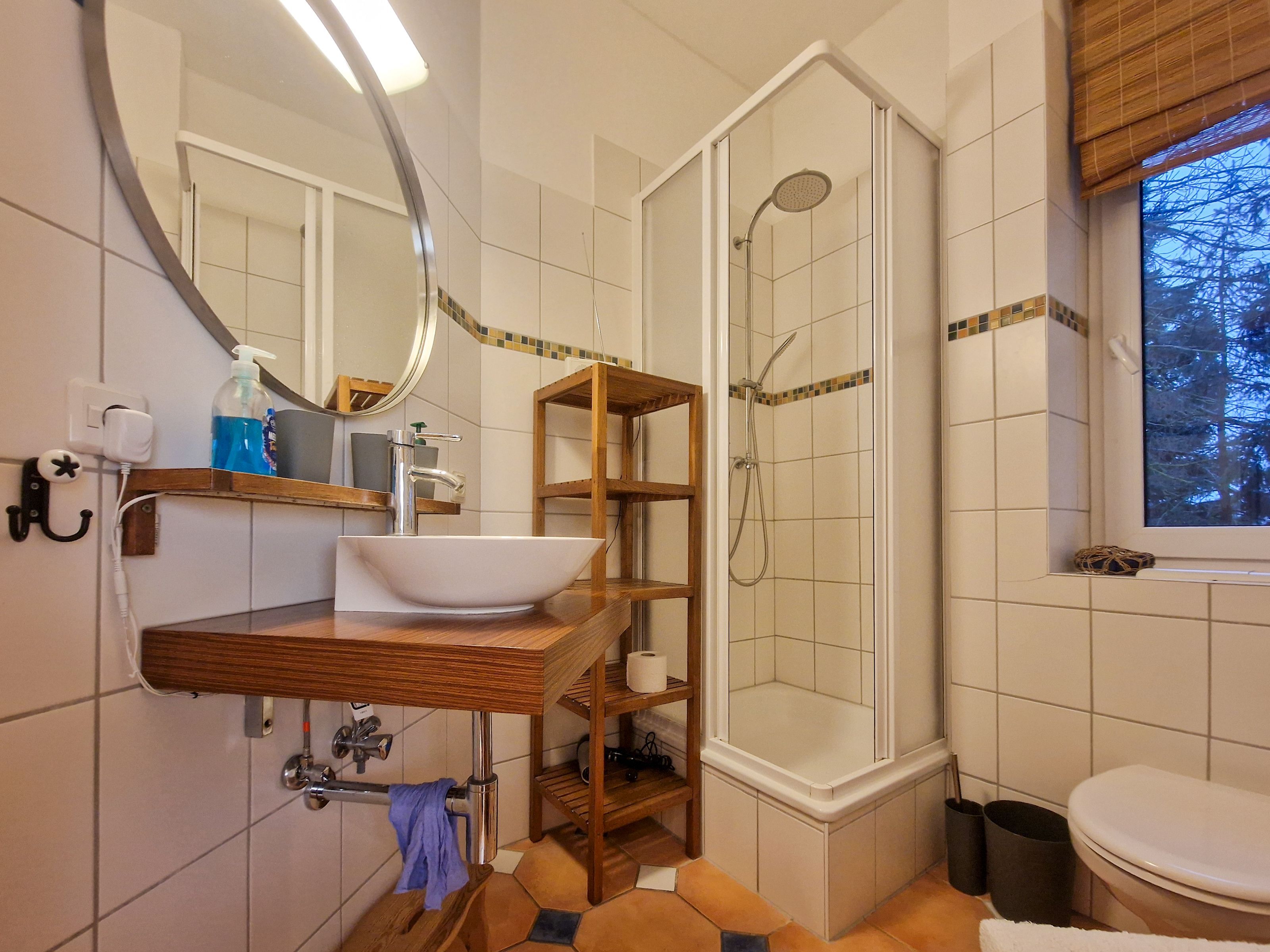 Das Badezimmer ist mit einer Dusche, WC, Waschbecken und einem Föhn ausgestattet und dank eines Außenfensters gut belüftet. Wir wünschen Ihnen einen angenehmen und erholsamen Aufenthalt in unserer Ferienwohnung!