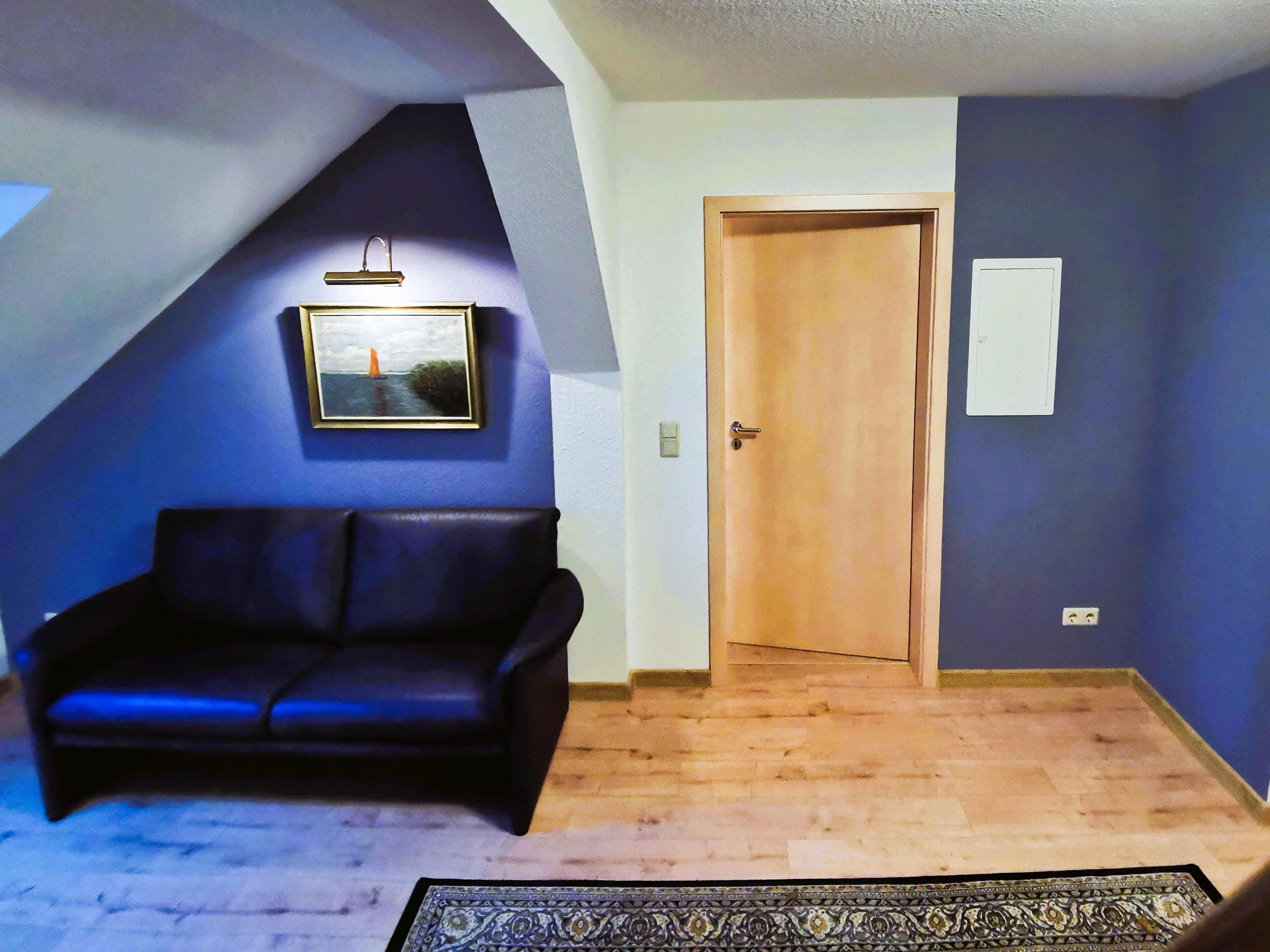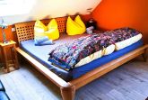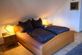Die Wohnung im Obergeschoss verfügt über eine große, gemütliche Wohndiele, einen großräumigen Wohn-Essbereich in Verbindung mit einer voll ausgestatteten Küche, 2 Schlafzimmer sowie ein modernes Bad und eine weitere große Toilette. Über eine Innentreppe erreichen Sie den Spitzboden mit zwei weiteren großen Schlafzimmern. Im Schutz zweier stattlicher Eichen haben Sie von der Terrasse aus einen weiten Blick in die Umgebung und auf das Gelände.