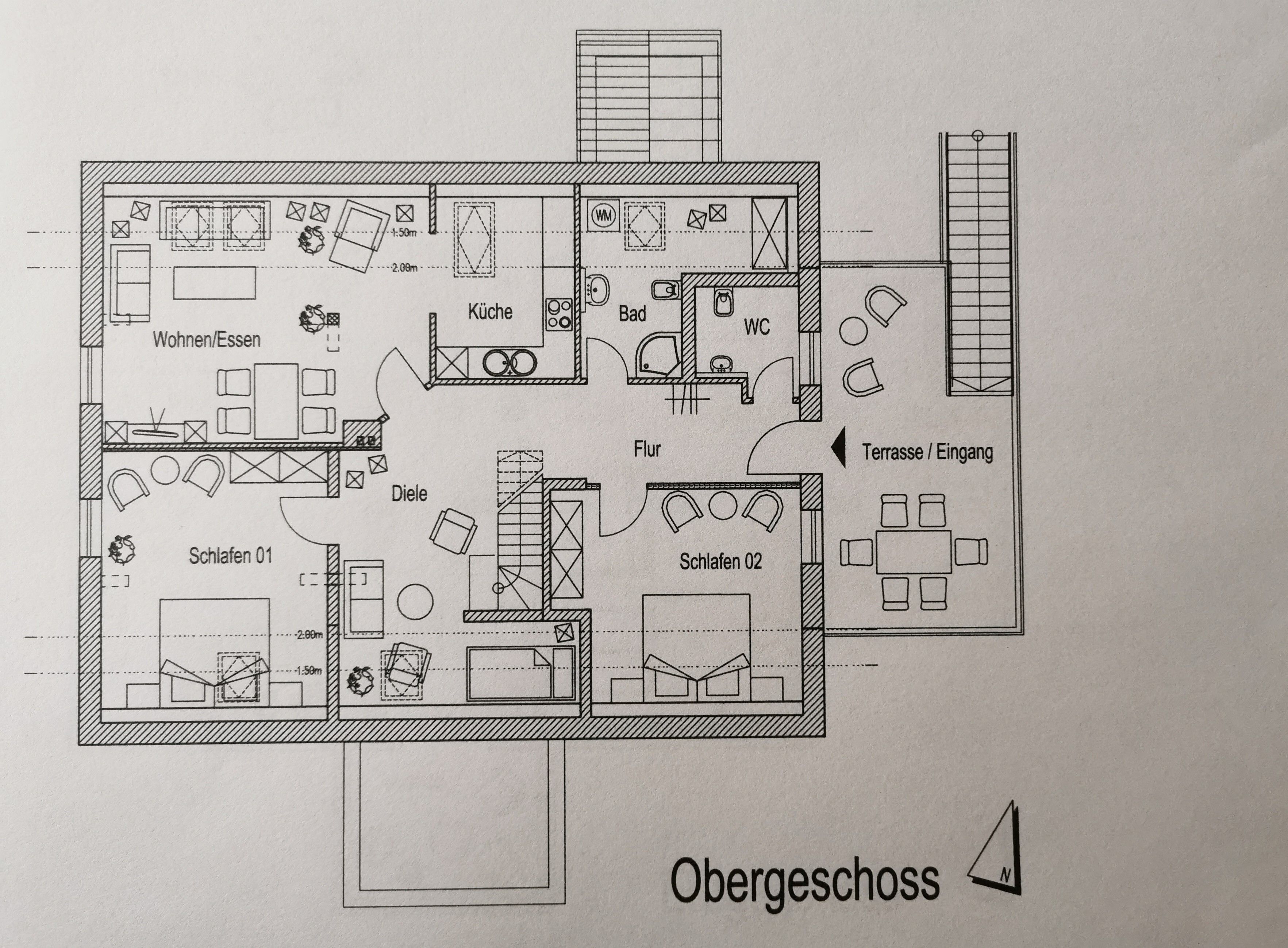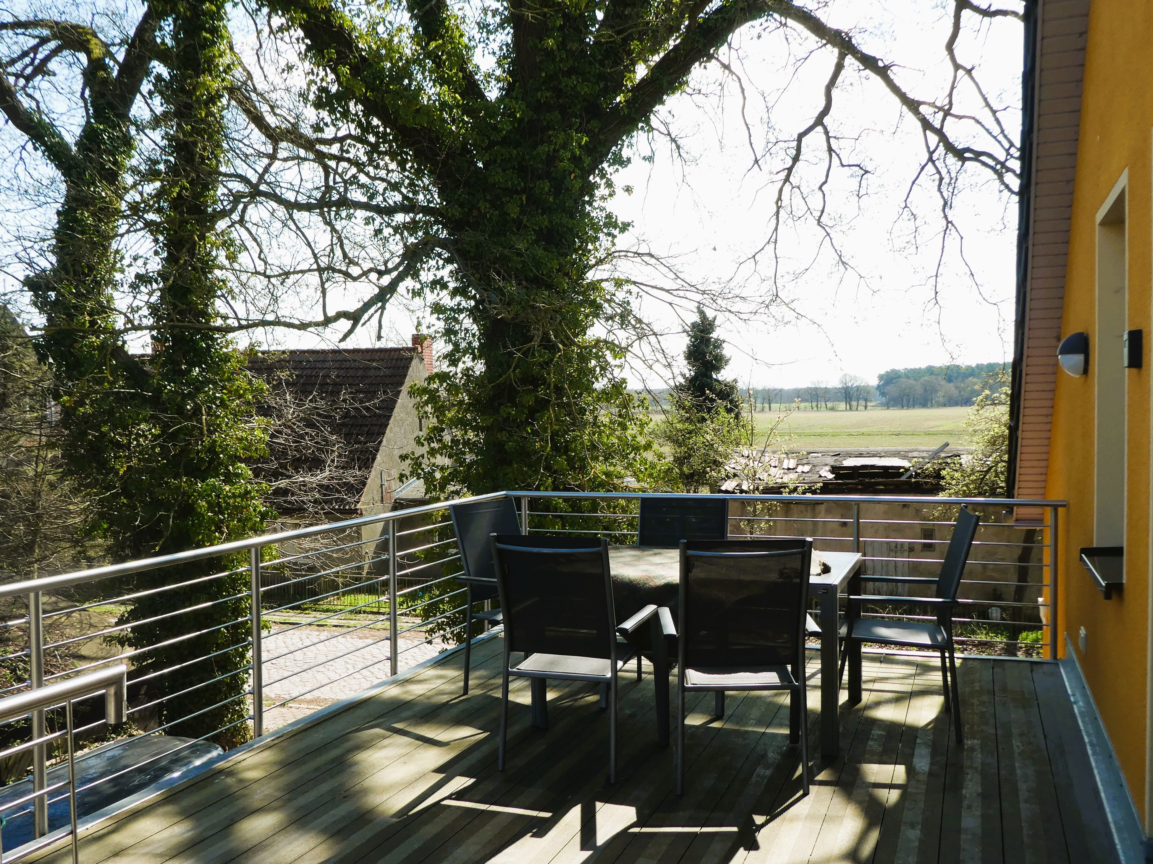 Beide Wohnungen verfügen über große Terrassen, jeweils mit Esstisch, Liegen und Grill. Auf der Terrasse im OG (17 m²), kann in der Sonne gefrühstückt werden, später bieten zwei Eichen wohltuenden Schatten. Auf der Terrasse im EG (25 m²) scheint die Sonne ab dem frühen Nachmittag.