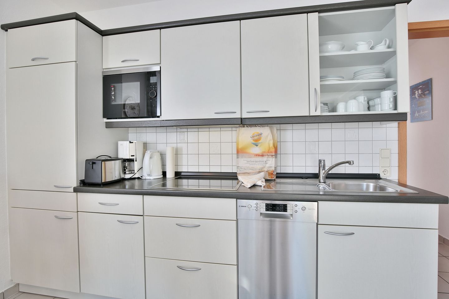 Die helle und geräumige Küchenzeile mit Geschirrspüler, Mikrowelle mit Grillfunktion und Cerankochfeld hat alles zum entspannten kochen da. Eine Filterkaffeemaschine und ein Wasserkocher runden das ganze ab.