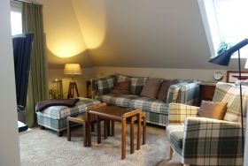 Diese geräumige und stilvolle Obergeschosswohnung bietet vier Personen den perfekten Rückzugsort für einen entspannten Urlaub. Der gemütliche Essplatz in der modernen Küche lädt zu gemeinsamen Mahlzeiten ein, während das zweigeteilte Wohnzimmer sowohl einen Bereich zum entspannten Lesen als auch einen separaten Bereich zum Fernsehen bietet – so findet jeder seinen Lieblingsplatz.