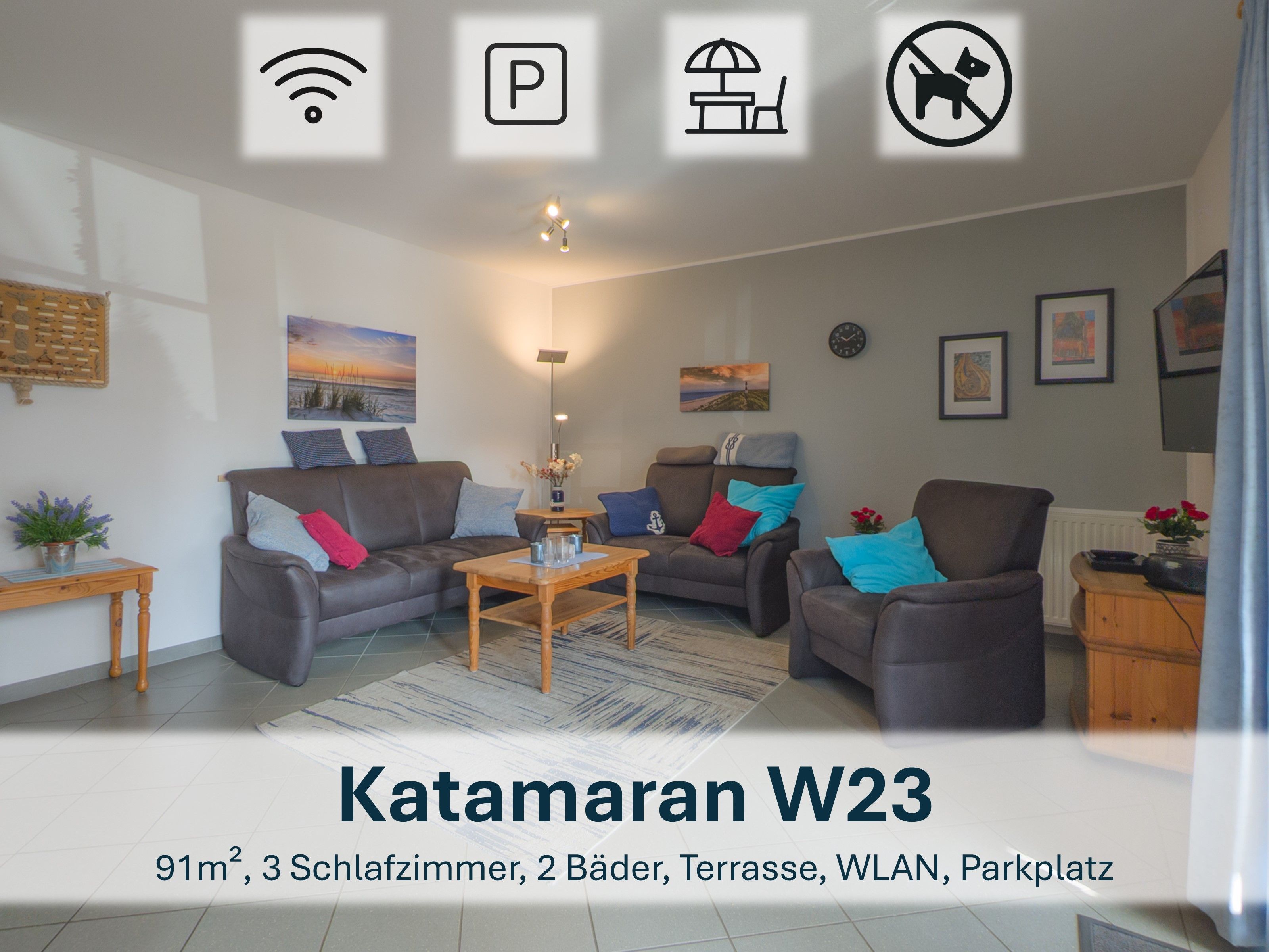 Hinweis: Die Fotos bilden die Ausstattung der Hauskategorie Katamaran I ab. Die Optik des Mobiliars weicht in den einzelnen Objekten vom Modell (Nr. 47) ab.