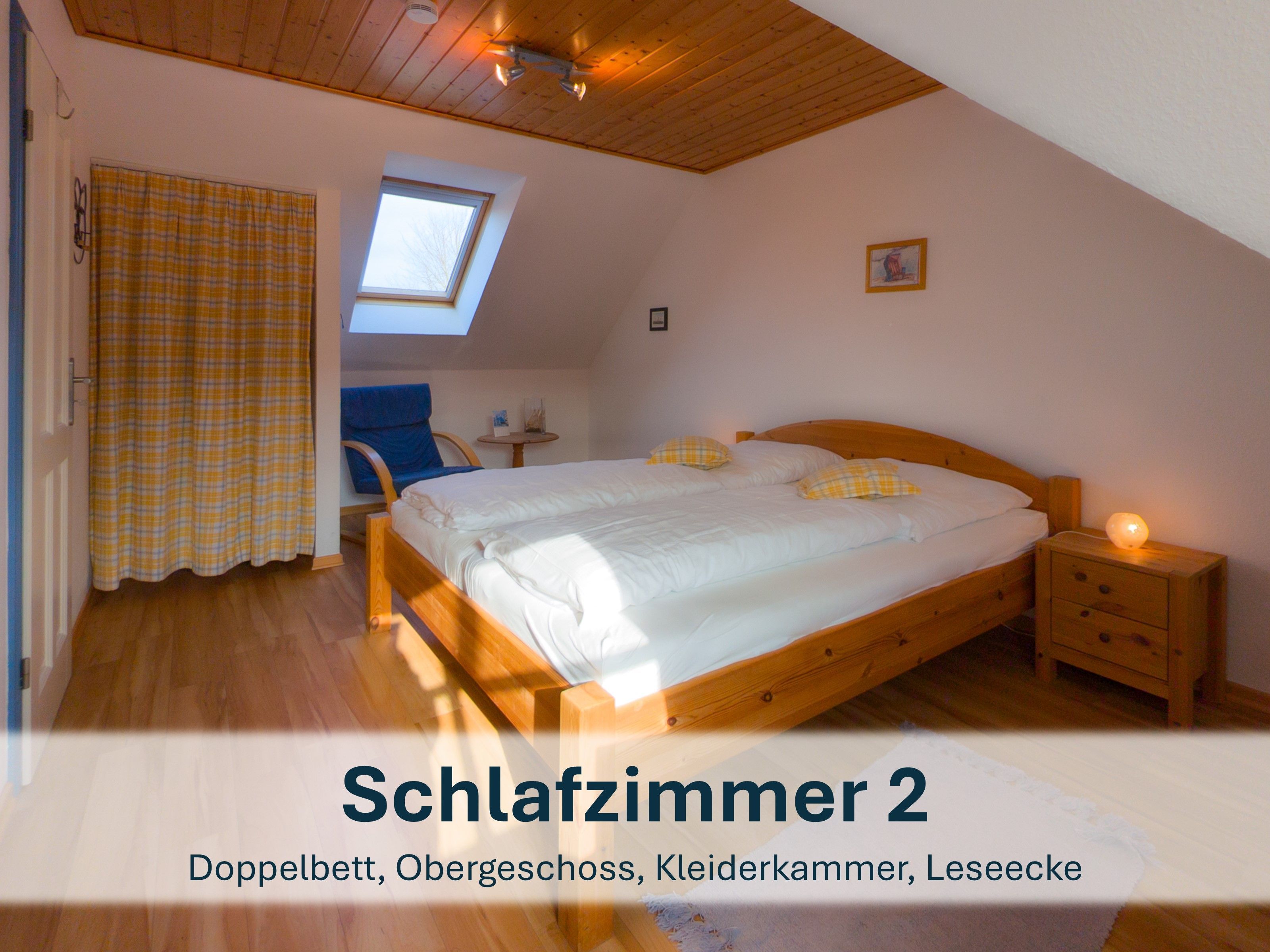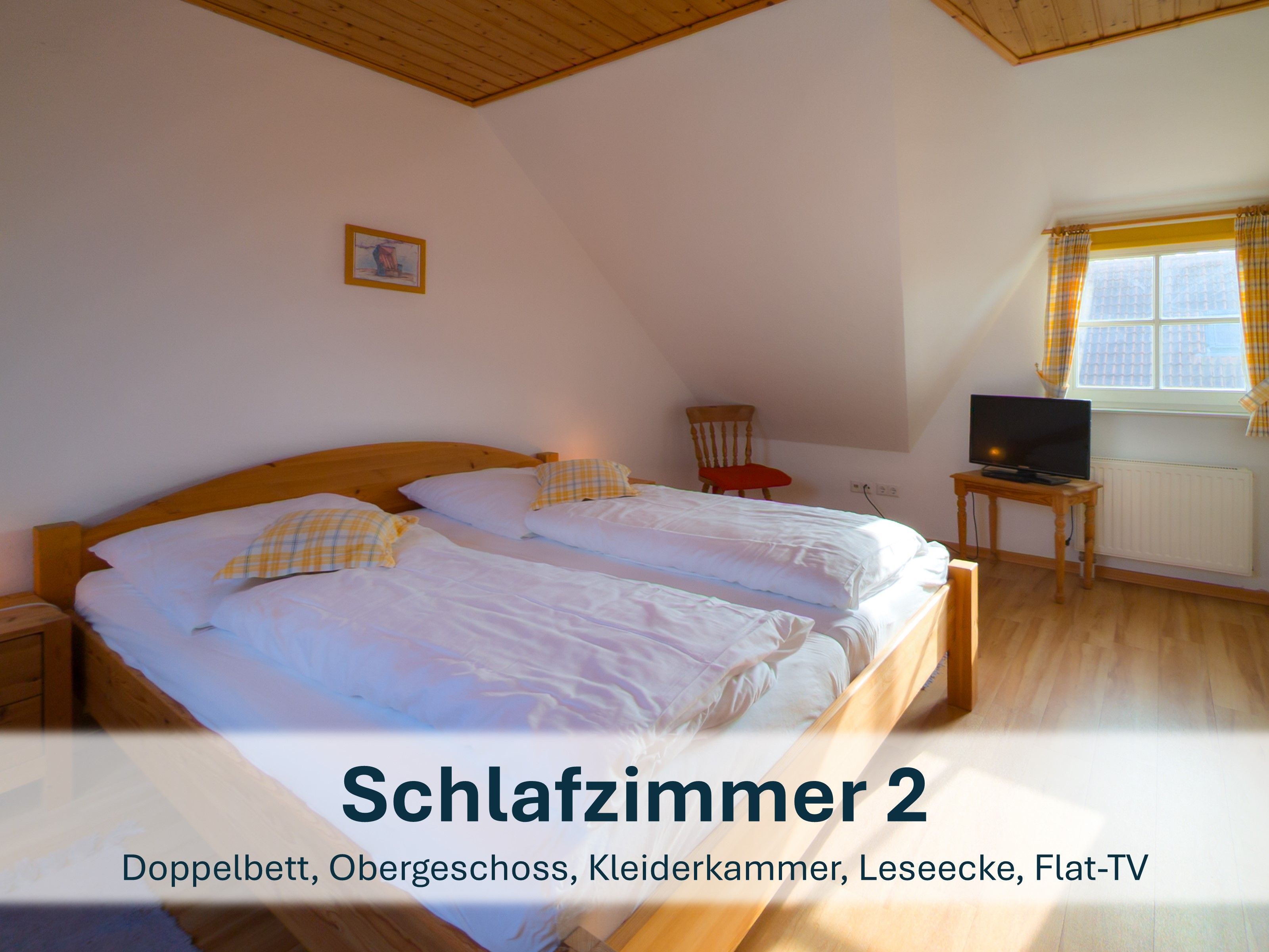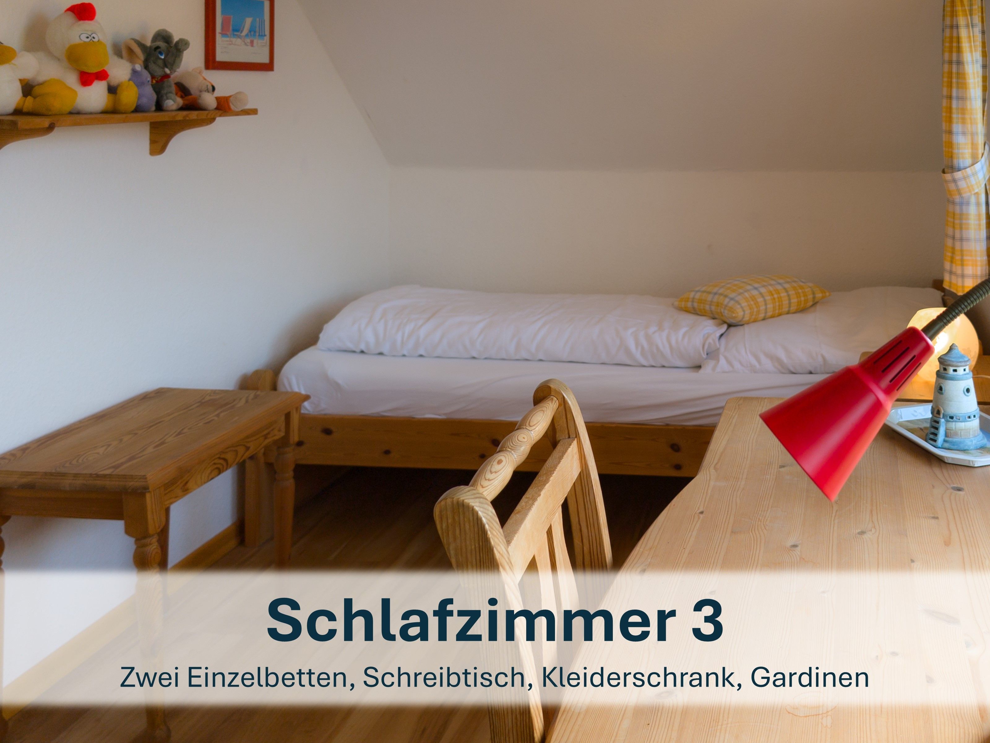 Über die Holztreppe im Flur gelnagen Sie in das Obergeschoss des Hauses.Hier befinden sich zwei weitere Schlafzimmer: ein Kinderzimmer mit zwei Einzelbetten und einem kleinen Schreibtisch, sowie ein Schlafzimmer mit Doppelbett und einer Kommode.