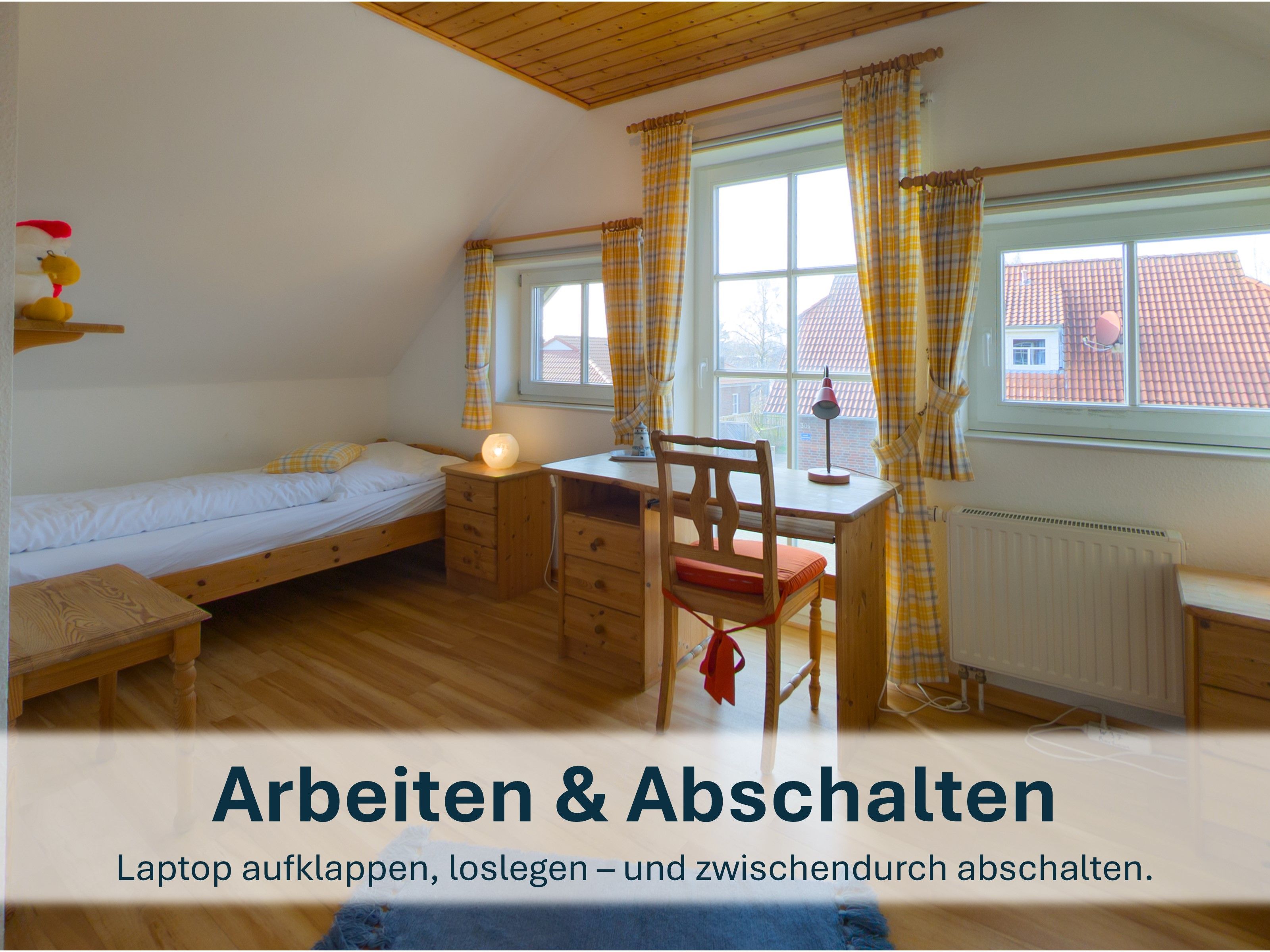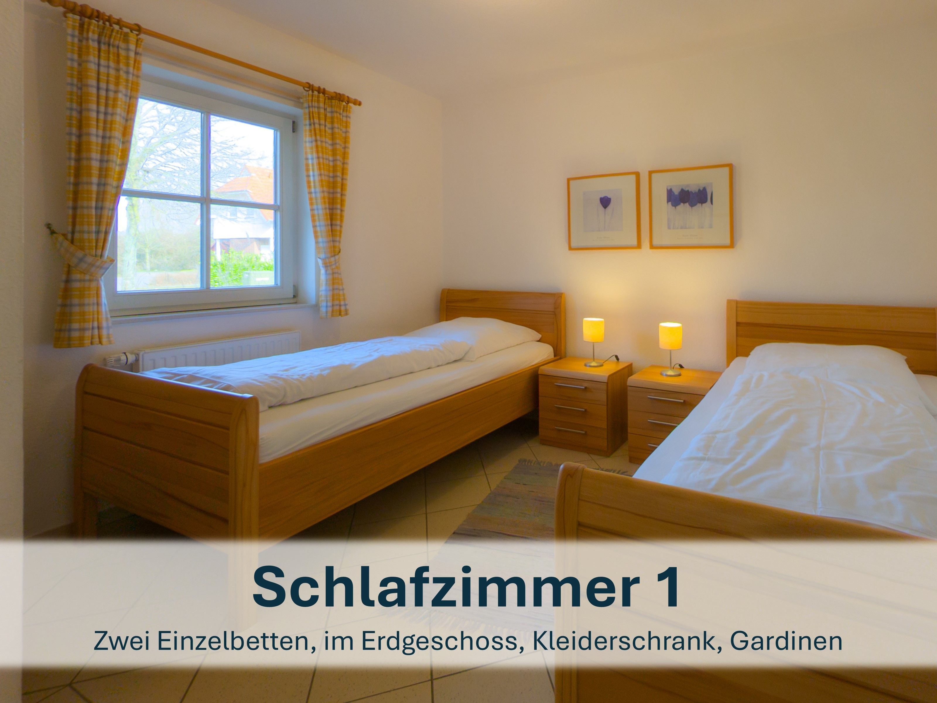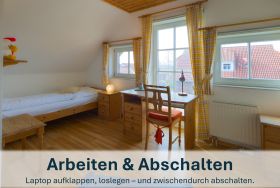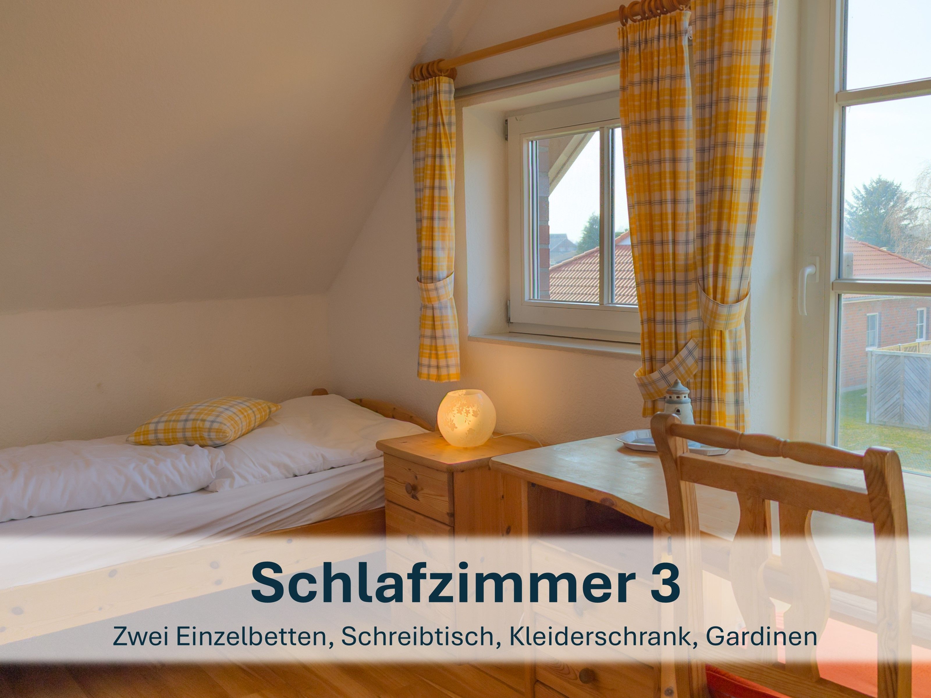 Über die Holztreppe im Flur gelnagen Sie in das Obergeschoss des Hauses.Hier befinden sich zwei weitere Schlafzimmer: ein Kinderzimmer mit zwei Einzelbetten und einem kleinen Schreibtisch, sowie ein Schlafzimmer mit Doppelbett und einer Kommode.