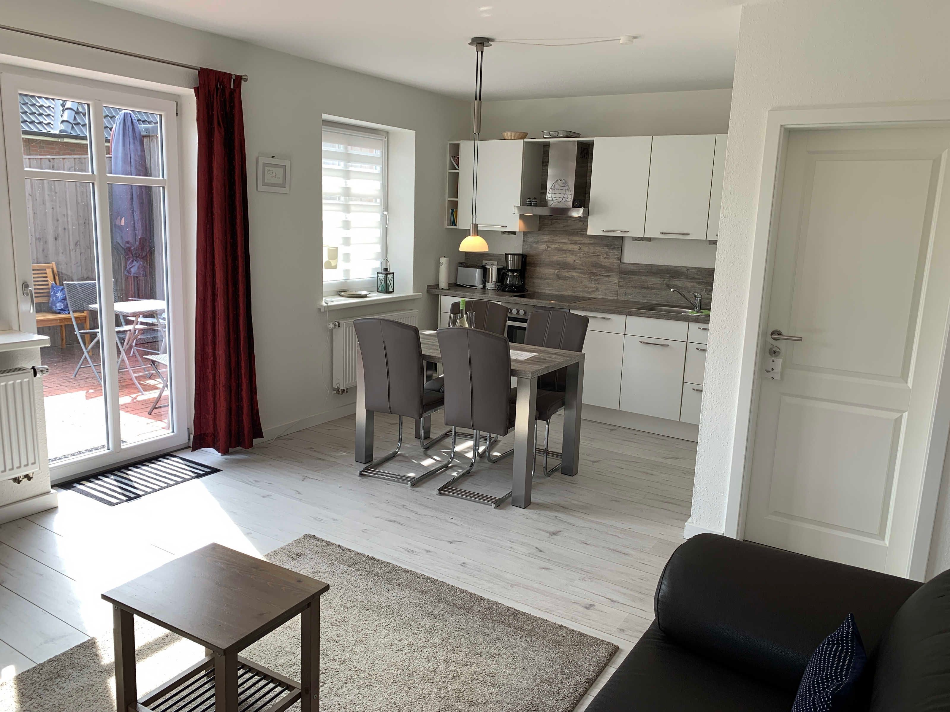 Das Haus Eesbüll ist für bis zu 5 Personen - es hat ein Schlafzimmer mit Boxspringbett, eines mit zwei Einzelbetten und eines mit einem Einzelbett. Die Küche ist vollausgestattet.