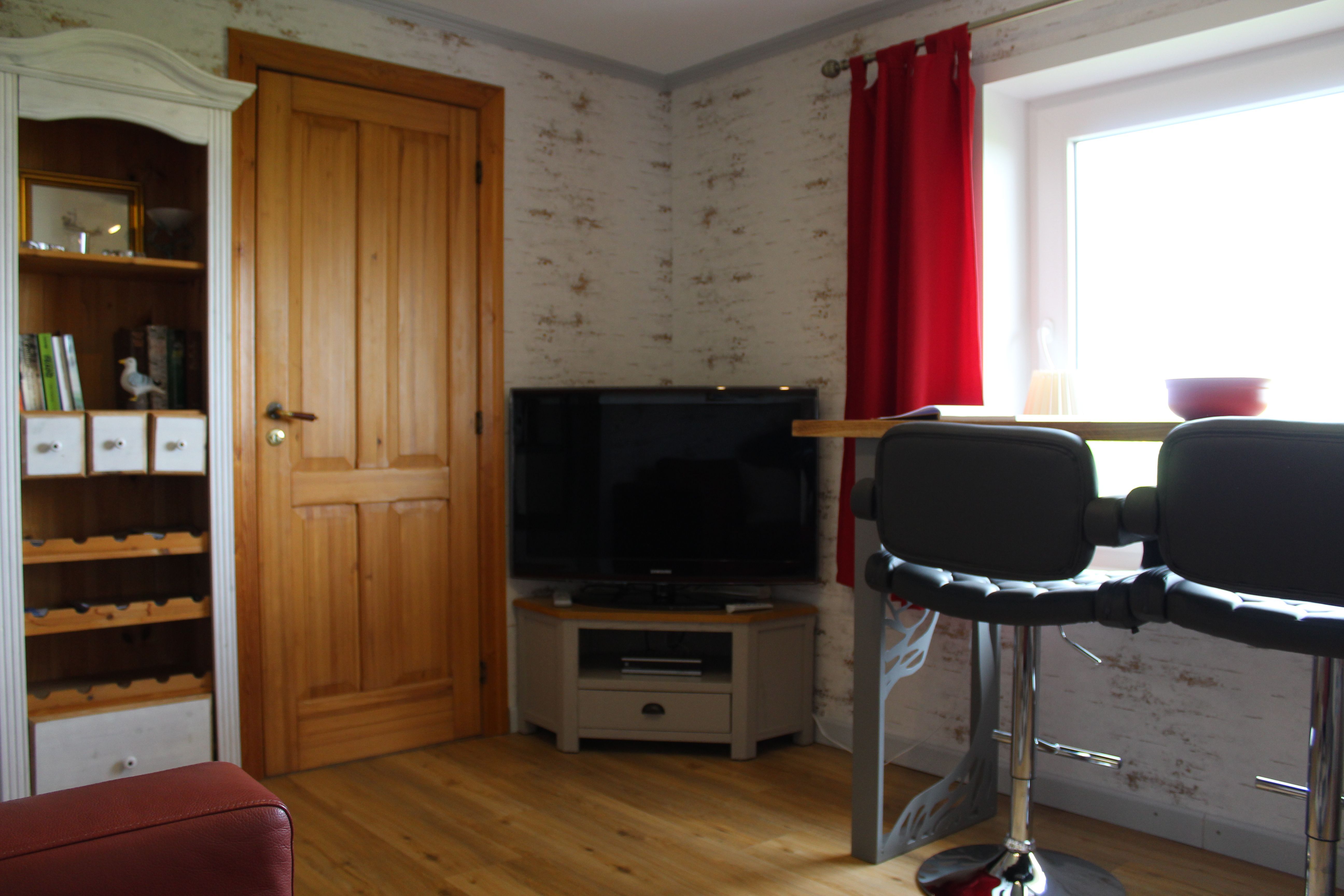 Eingerichtet ist die 38qm große Wohnung für zwei Personen. Das Schlafzimmer, auch mit Meerblick, ist ausgestattet mit einem Doppelbett und Kleiderschrank, von dort aus geht es auch in das Duschbad. Weiterhin hat die Wohnung ein Wohnzimmer mit Esstisch und eine Pantry Küche.