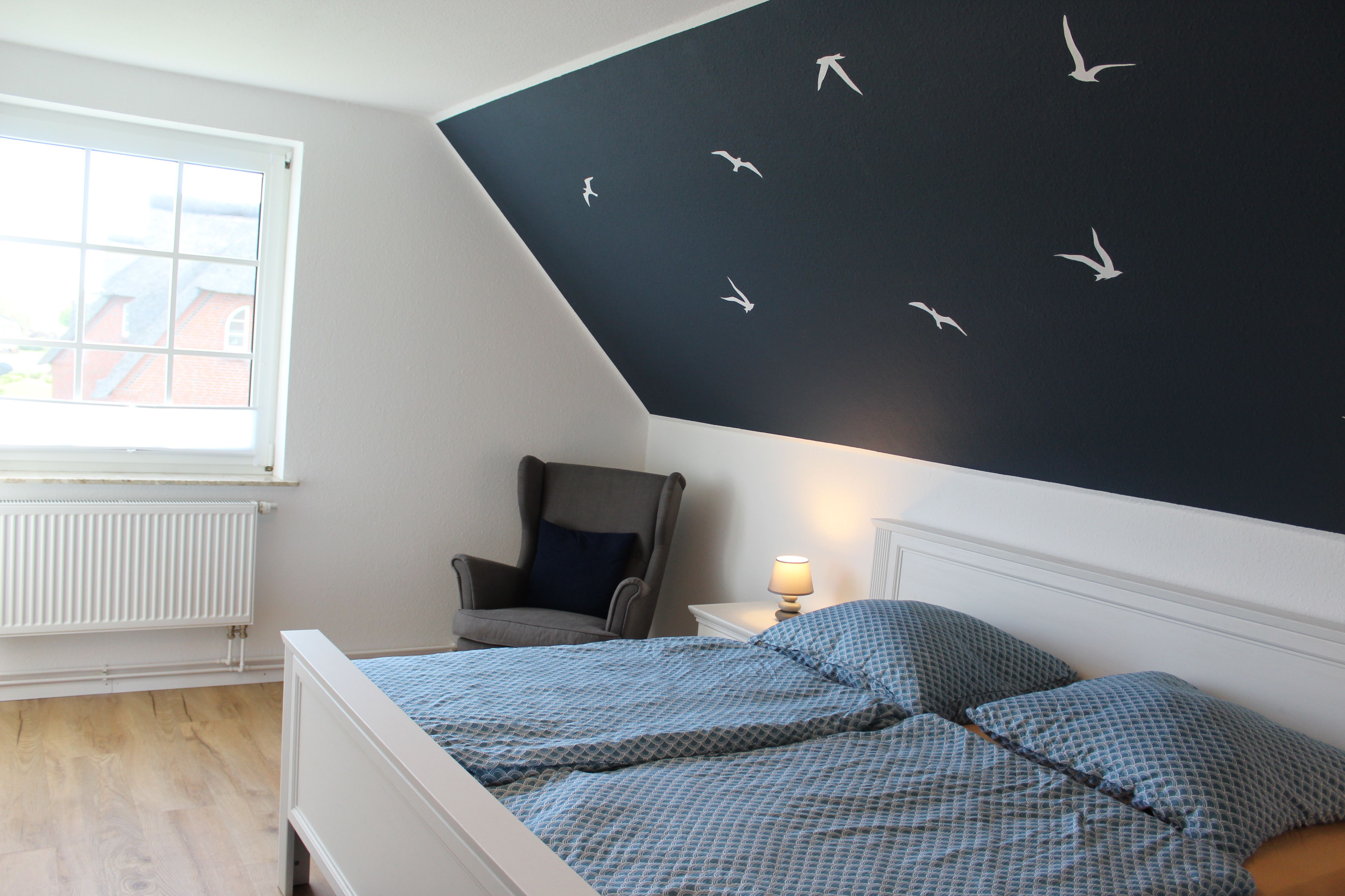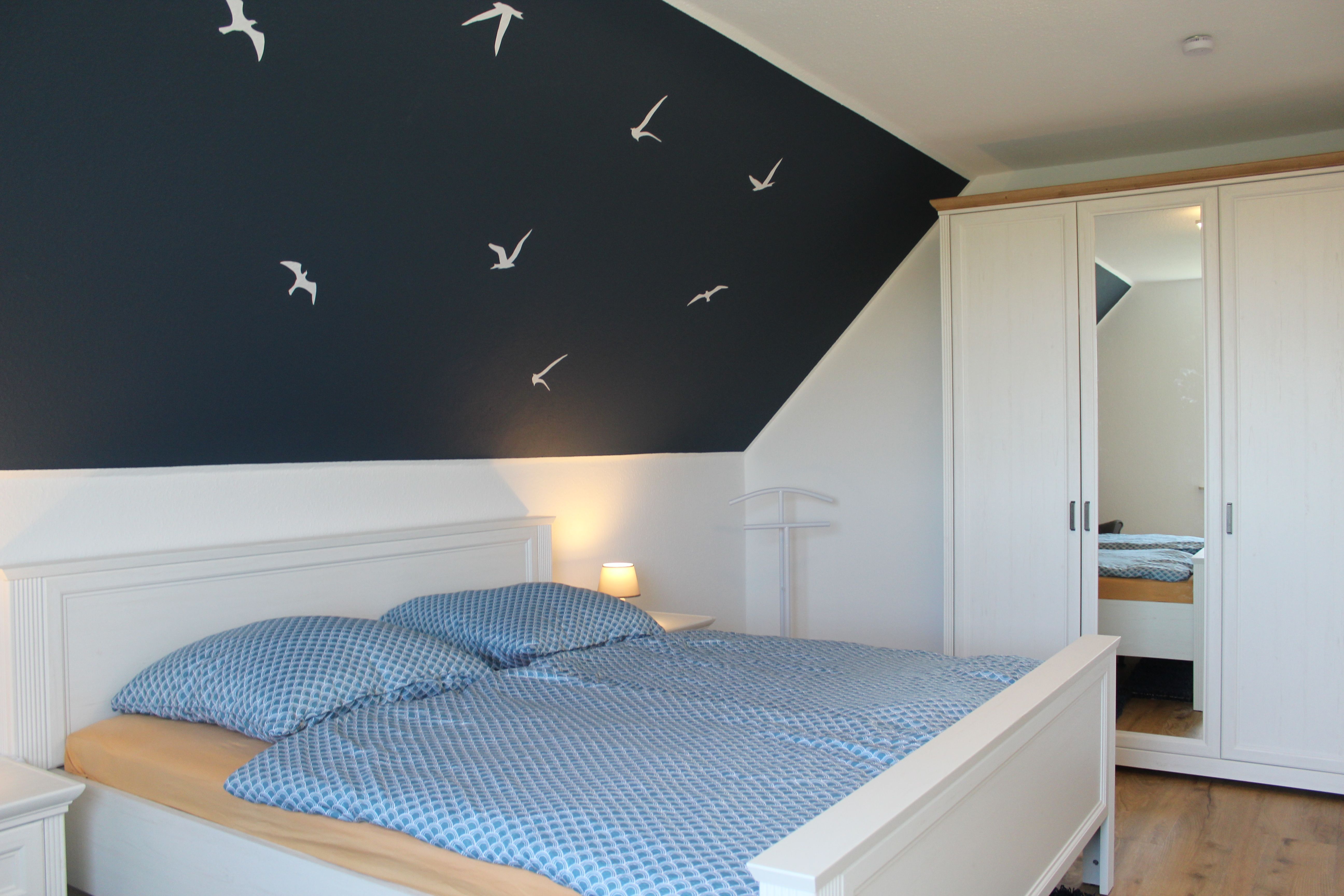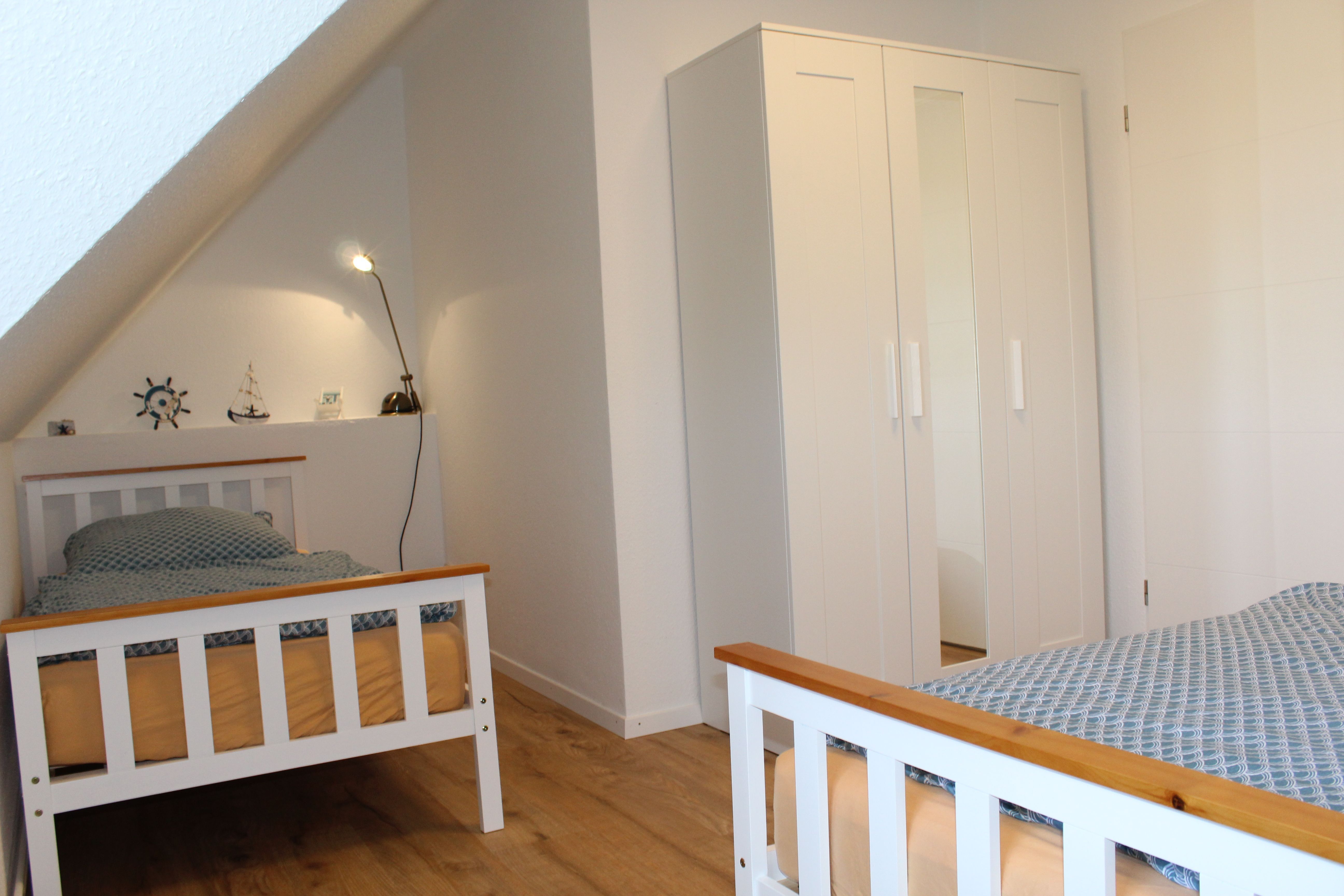 Im Obergeschoß befinden sich die beiden Schlafzimmer, eines mit Doppelbett (180x200cm) und eines mit zwei Einzelbetten (90x200cm) und das Duschbad mit Walk-In-Dusche.