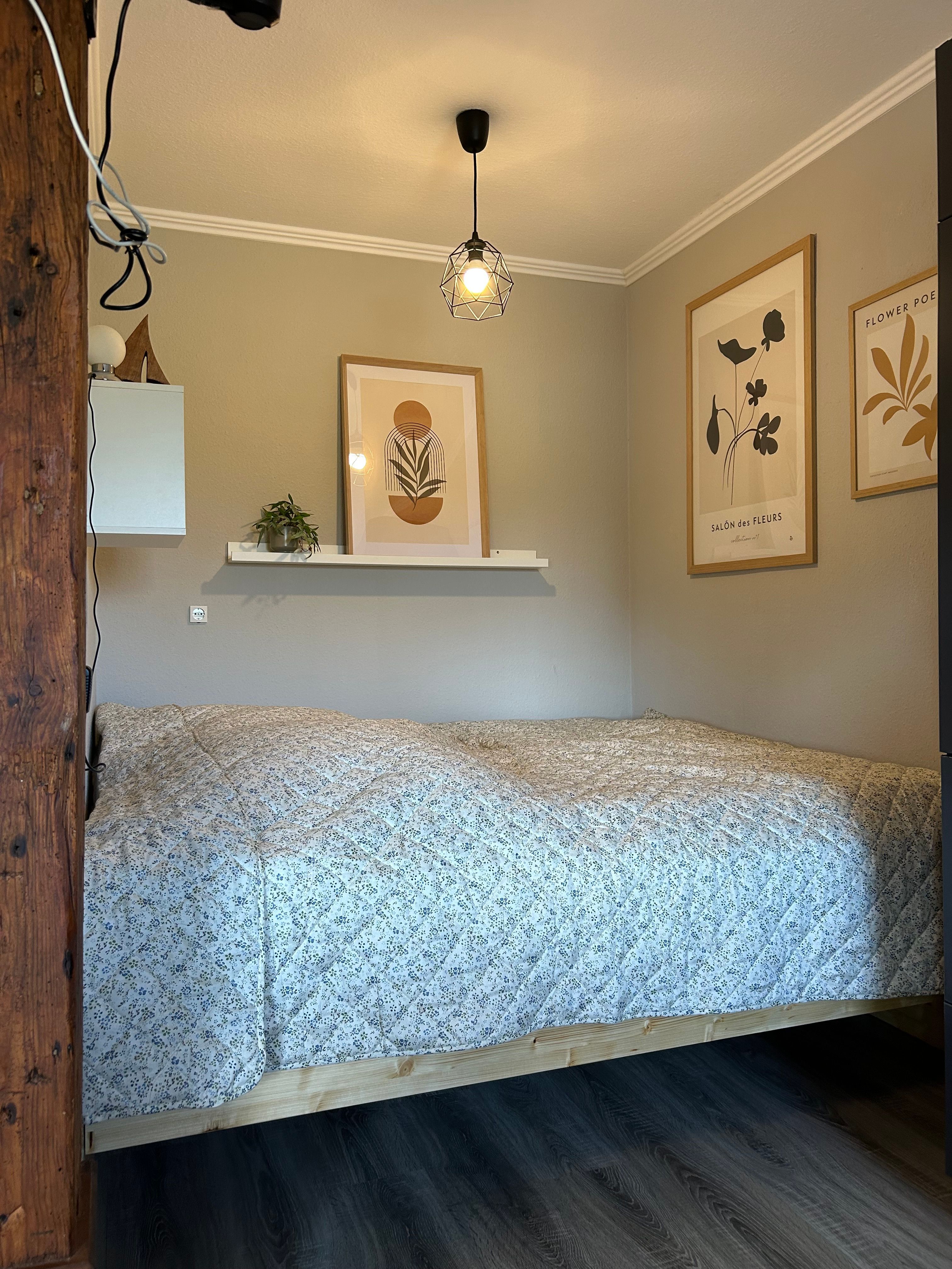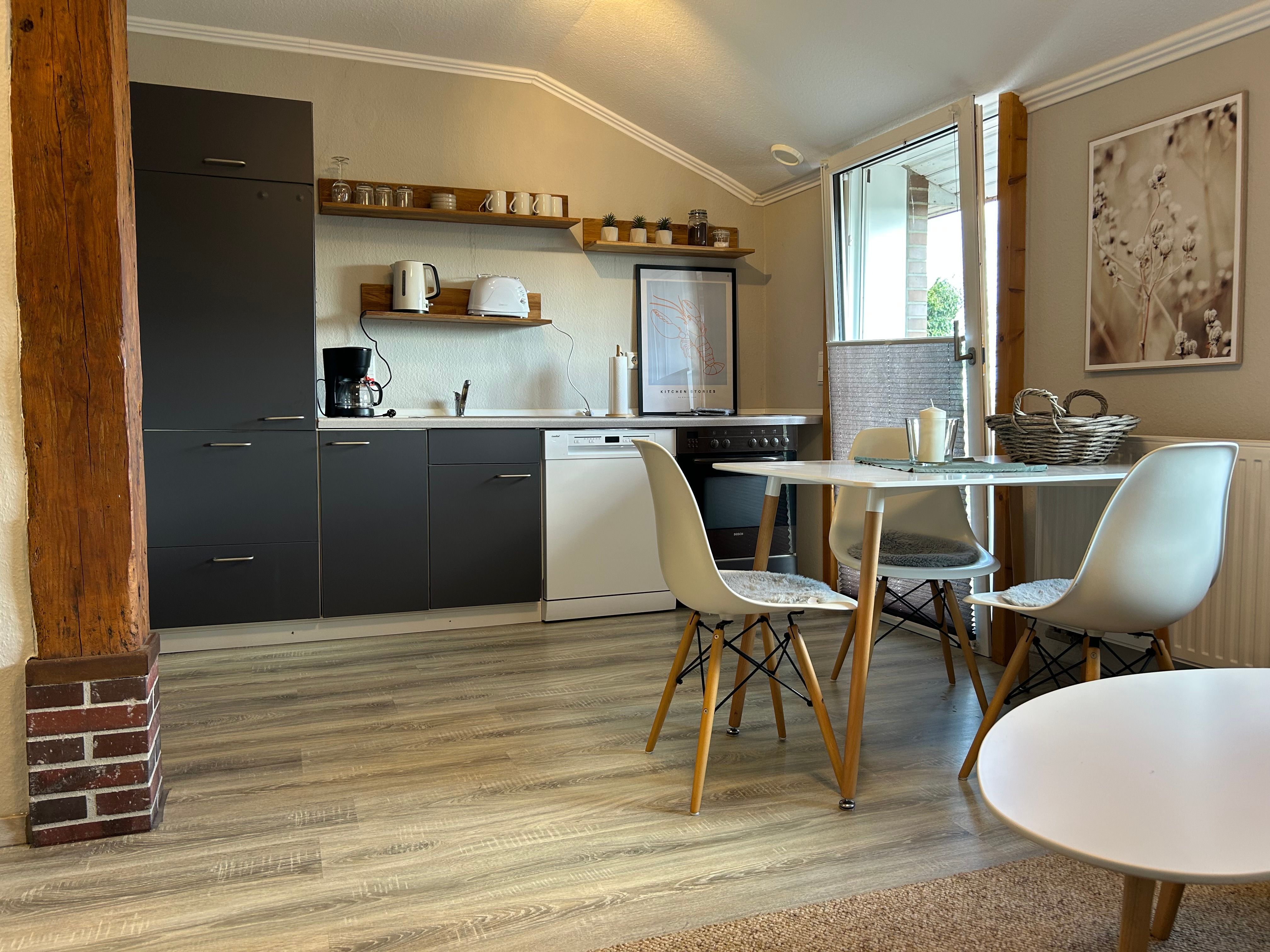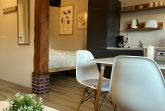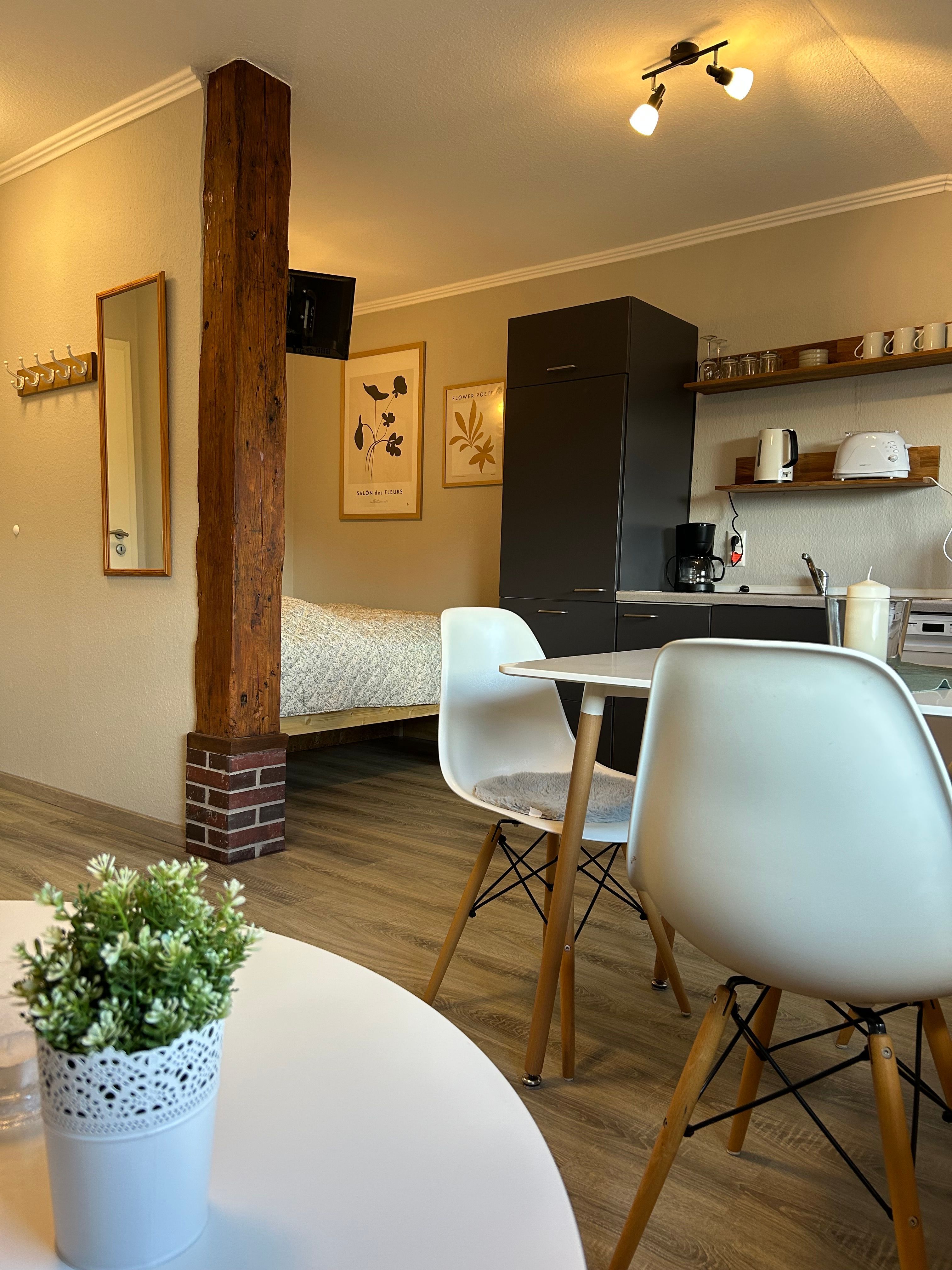 Helles und gemütliches Appartement mit einem Doppelbett und einer Schlafcouch für bis zu 3 Personen. Der Schlafbereich ist vom Wohn- und Essbereich getrennt. Gemeinschaftlicher Gartenbereich mit Blick auf die Weiden.