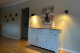Geräumige Ferienwohnung mit Diele. Großzügige Küche mit Esstisch für 4 bis 6 Personen. Gemütliche Couchecke mit Blick auf die Weiden. Überdachte Terrasse mit Zugang zum gemeinschaftlichen Garten.