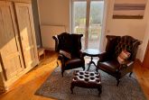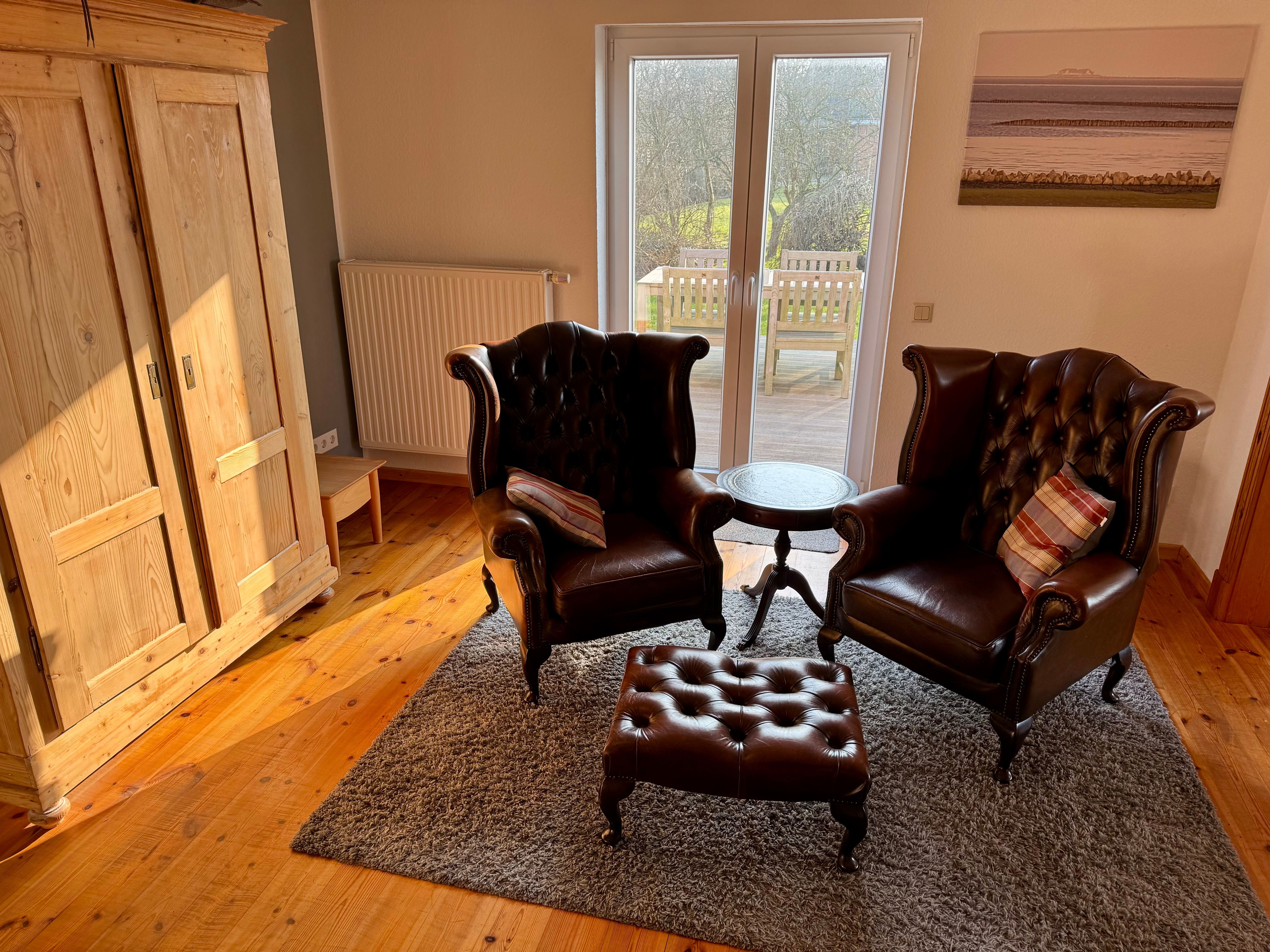 Die sonnige Terrasse lädt mit eleganten Gartenmöbeln, einem Grill und einem Strandkorb zum Verweilen und Genießen der frischen Luft ein. Das Highlight des Gartens ist die Fasssauna, die kostenfrei zur Verfügung steht.