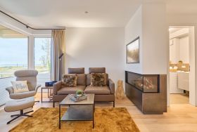Mit einem Sofa und einem Relaxsessel lädt der Wohnbereich zu gemütlichen Stunden vor dem Elektrokamin ein. Neben einem Flach-TV mit neuester Technik steht Ihnen selbstverständlich kostenloses WLAN zur Verfügung. Das Bad verfügt über eine bodentiefe Dusche, einen Handtuchheizkörper und wie die gesamte Wohnung eine Fußbodenheizung.