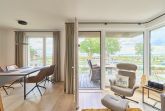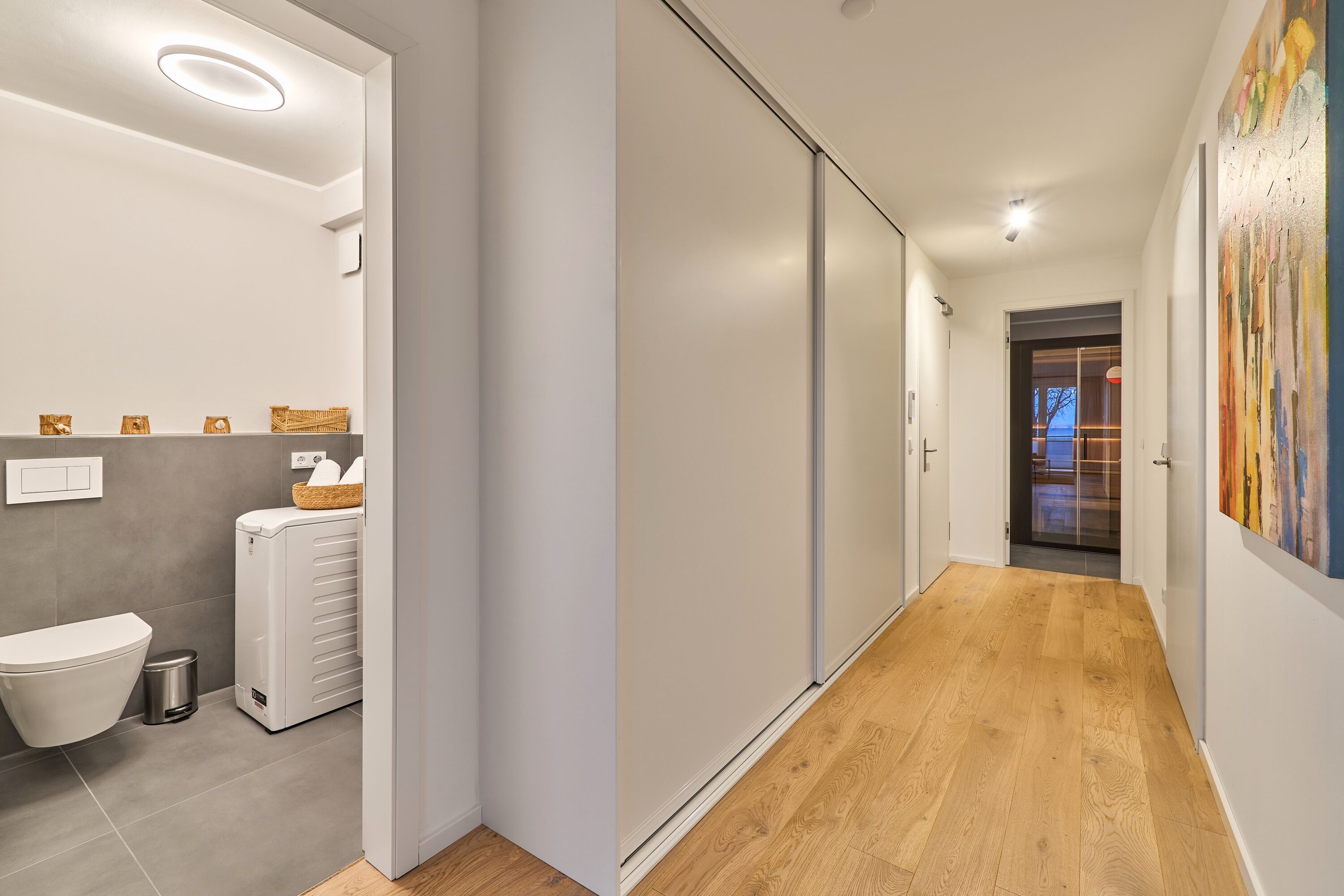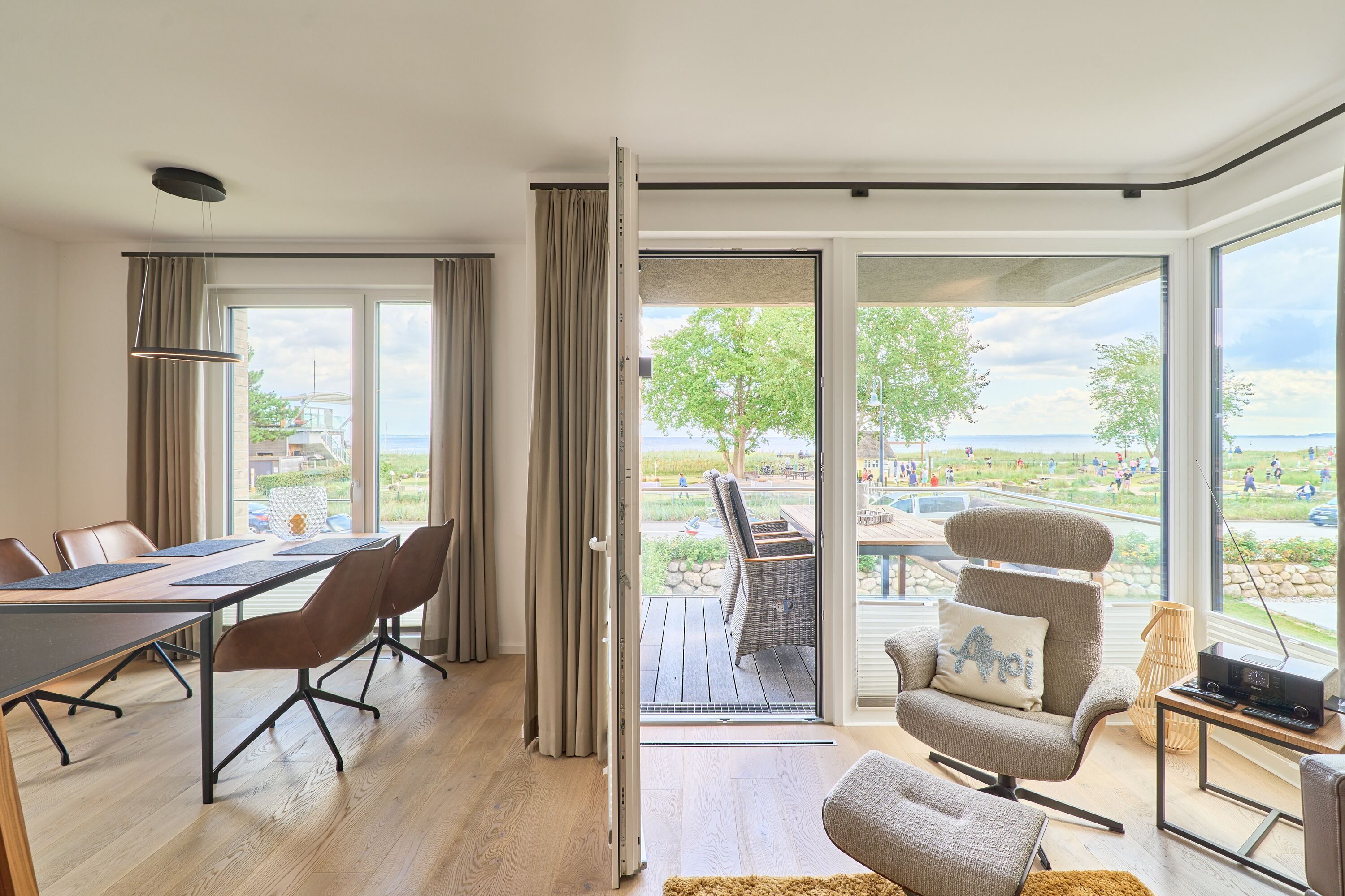 Schon beim Betreten der Wohnung erwartet Sie ein herrlicher Blick auf die Ostsee. Der Wohnbereich dieser traumhaften Wohnung ist durch die bodentiefen Fenster hell und lichtdurchflutet. Der Essbereich bietet ausreichend Platz für 4 Personen. Die moderne, offene Küche mit Kochtresen, Induktionskochfeld, Kaffeemaschine und Nespresso-Maschine ist komplett ausgestattet und lässt keine Wünsche offen. Für Kochliebhaber bietet der Bora Tepan-Grill den Rahmen für Geselligkeit und gemeinsames Kochen.