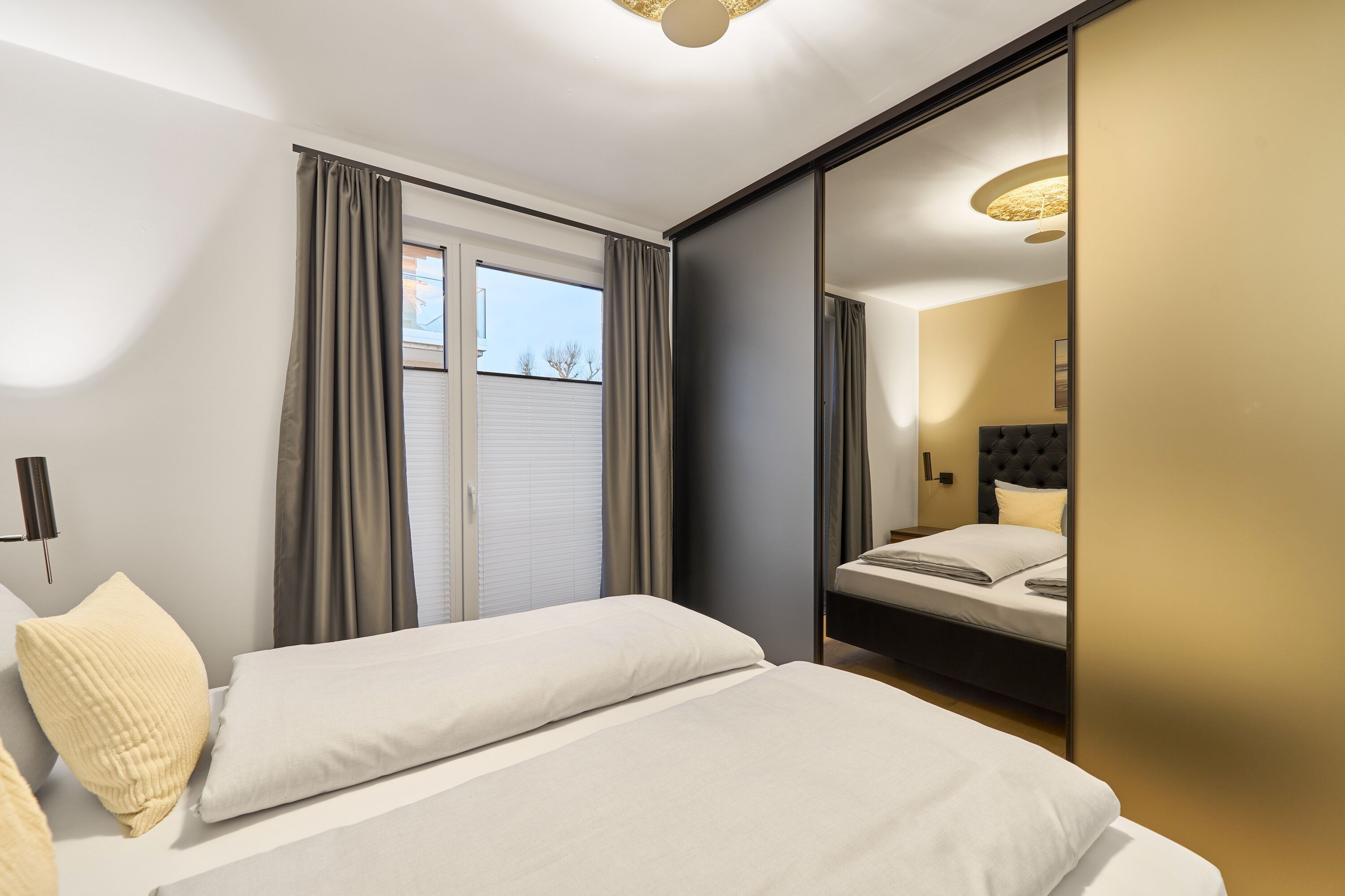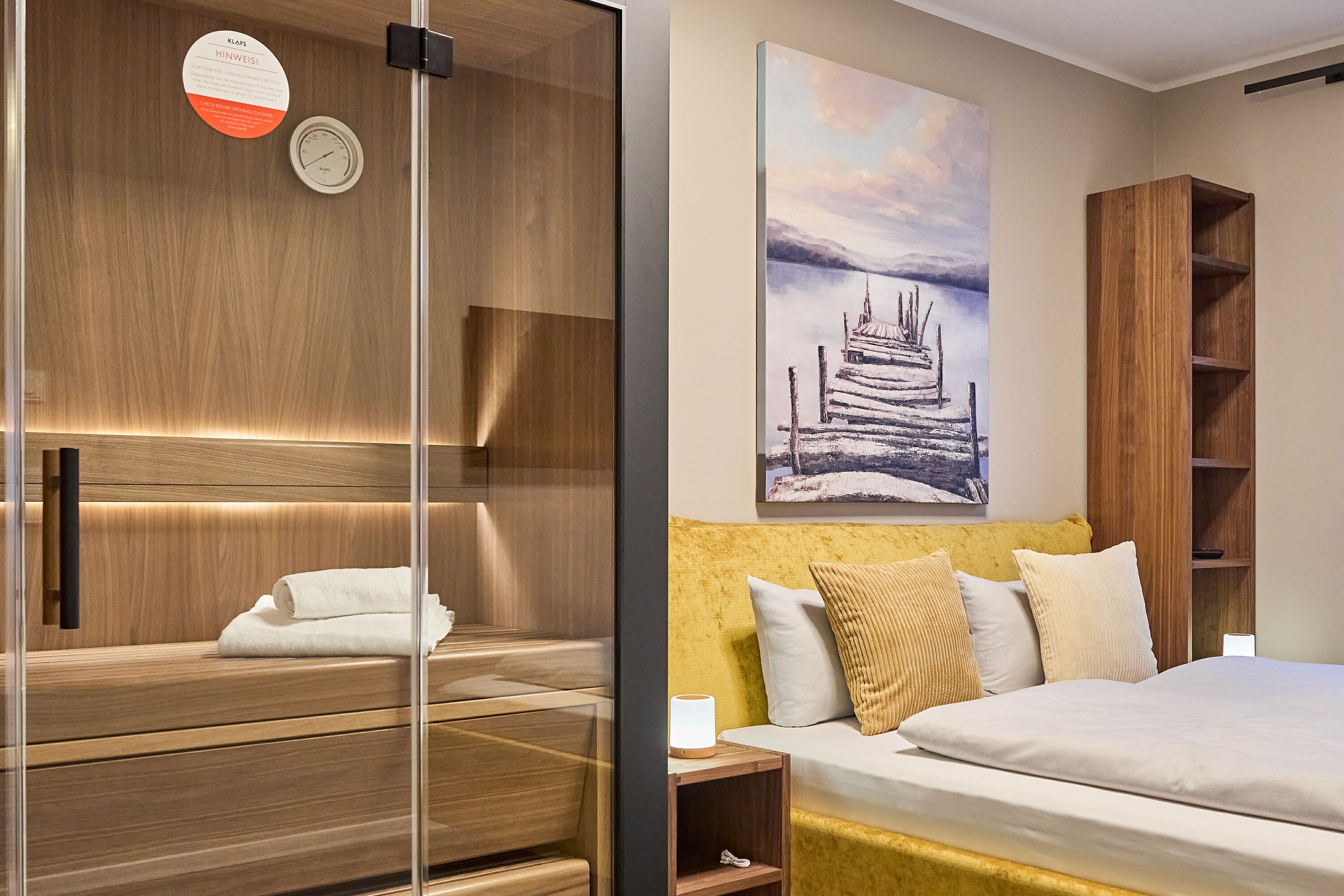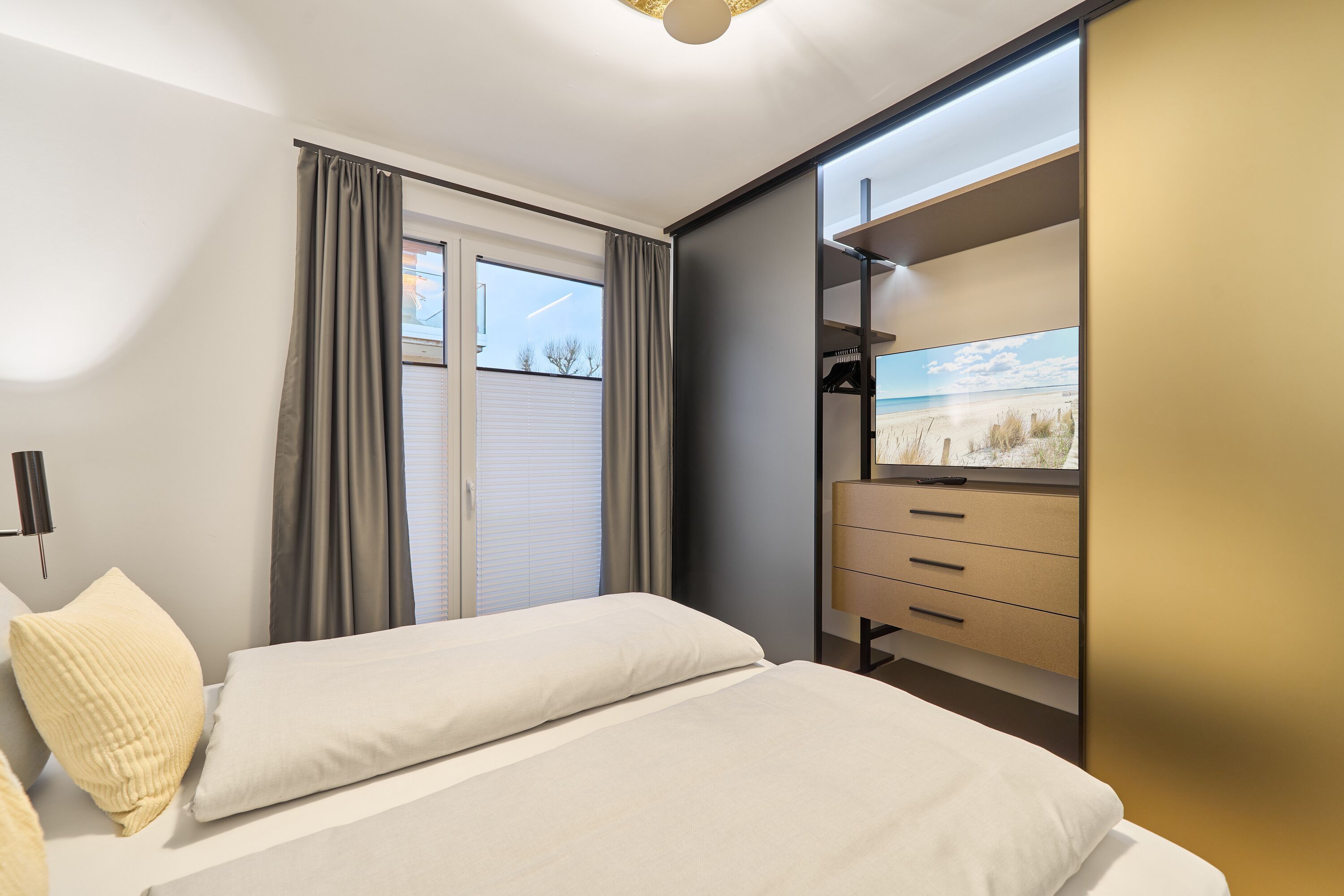 Die 2 Schlafzimmer sind jeweils mit einem Doppelbett (1,80 bzw. 1,60 x 2,00 m), einem Flachbild-TV und das größere Schlafzimmer mit einem Kleiderschrank ausgestattet. Relaxen Sie nach einem Spaziergang in der ausfahrbaren Sauna von Klafs mit Sanarium. Diese tolle Technik der Sauna befindet sich im 2. Schlafzimmer.