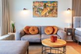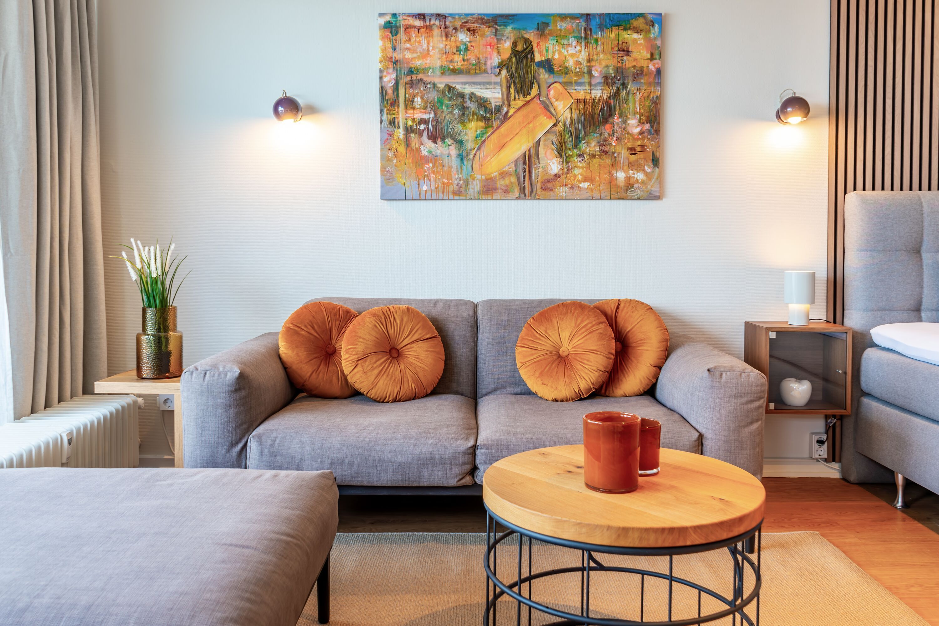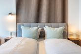 Diese 1-Zimmerwohnung bietet Platz für bis zu 2 Personen. Verschiedene Design-Klassiker sorgen für eine stylische und gleichzeitig gemütliche Atmosphäre. Es erwarten Sie ein bequemes Schlaraffia Boxspringbett (1,80x2,00m) und eine elegante Designer-Wohnzimmercouch von Rolf Benz, von welcher aus Sie den traumhaften Blick auf die Ostsee genießen können. Ein modernes Duschbad mit Kosmetikspiegel, eine Küchenzeile mit einem Geschirrspüler, einer Senseo-Kaffeemaschine sowie einer Filterkaffeemaschine und einem Wasserkocher, WLAN und ein Flachbildfernseher runden das Angebot ab. Die große Terrasse mit Blick auf die Ostsee lädt zum Outdoor-Living ein. Durch die Terrassenbauweise des Hauses können Sie hier viele Sonnenstunden genießen. Für Ihren PKW steht Ihnen hinter dem Haus ein Stellplatz zur Verfügung. Falls Sie eigene Fahrräder mitbringen möchten, können Sie diese in einer, nur zu dieser Wohnung gehörenden, abschließbaren Fahrradbox unterbringen.