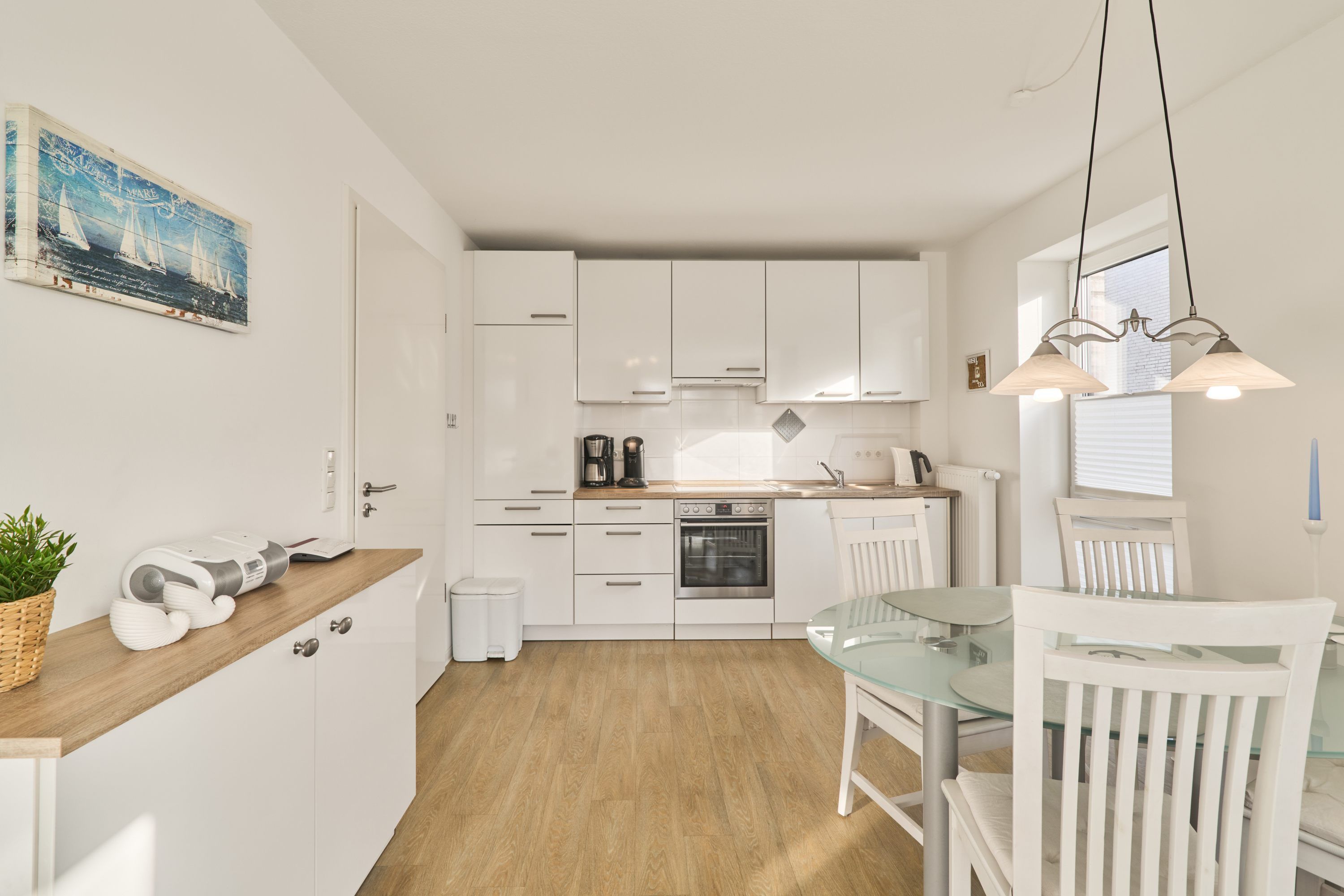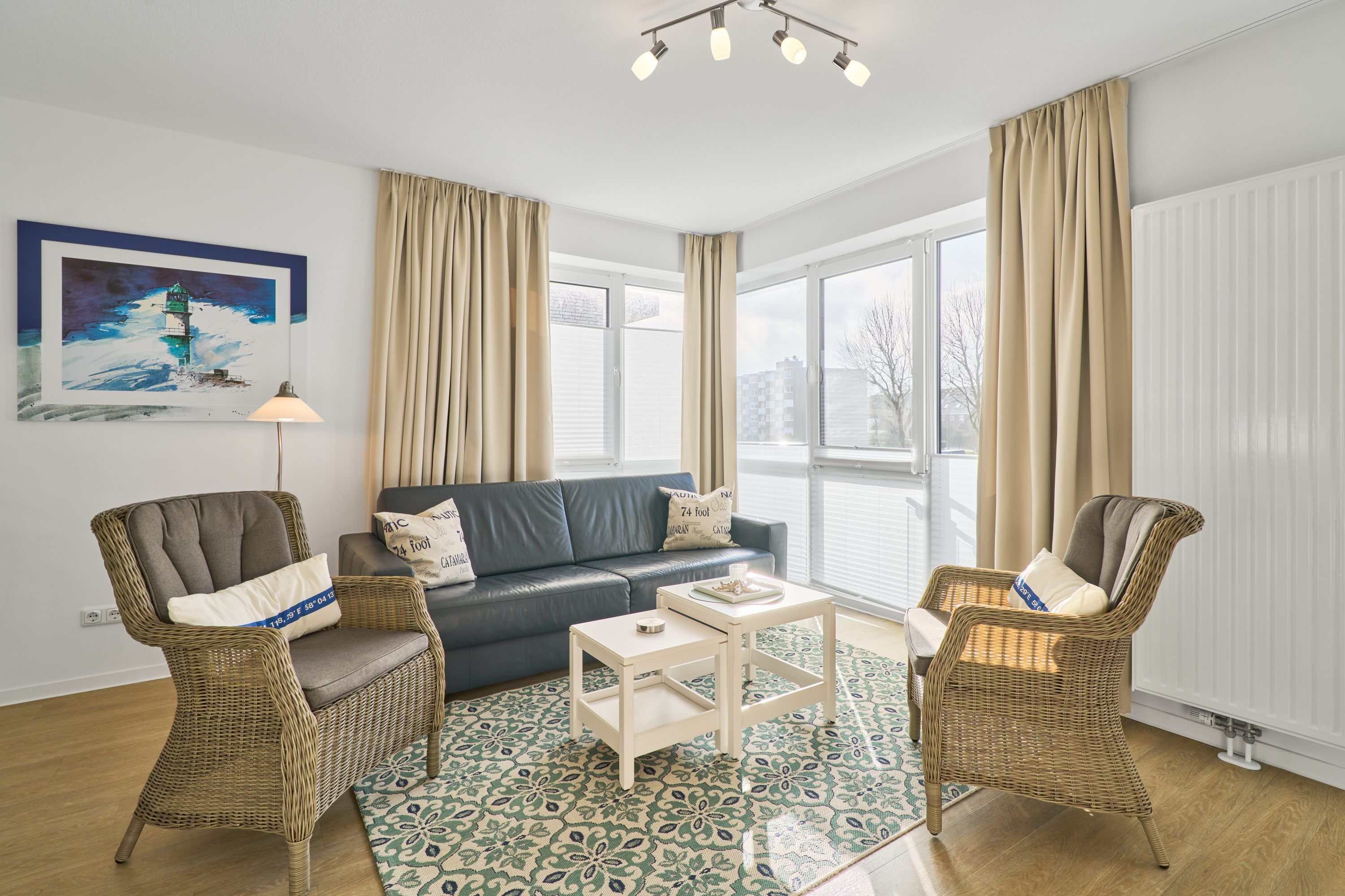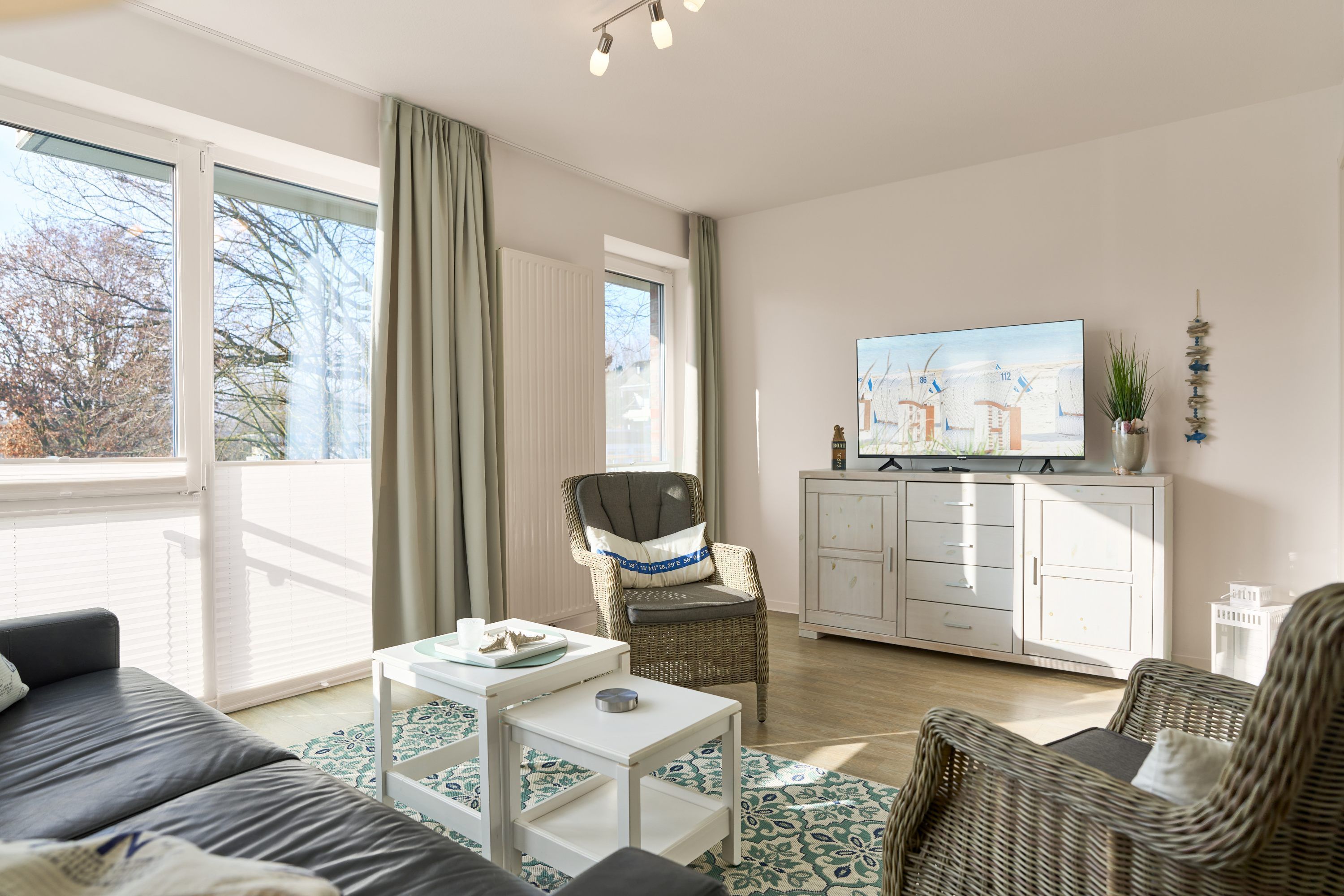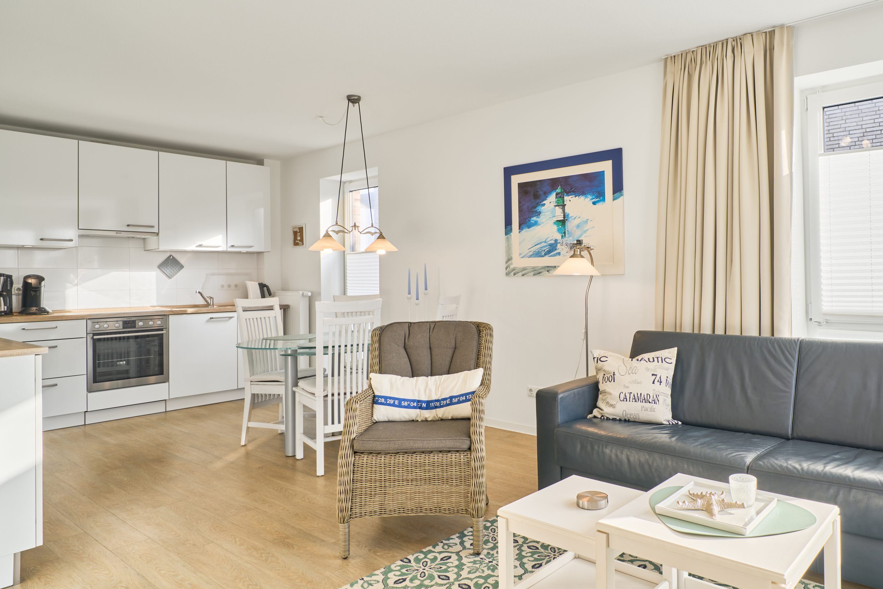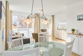 Die Ferienwohnung verzaubert mit ihrem, im maritimen Stil gehaltenen, Wohnzimmer und ist mit hochwertigen Möbeln eingerichtet. Es erwarten Sie dort eine bequeme Couch, 2 Sessel und ein Sat-Flachbildschirmfernseher. Die moderne, offene Küche ist voll ausgestattet und perfekt in den Wohnraum integriert. Ihnen stehen eine Filterkaffeemaschine, eine Senseo-Kaffeepadmaschine, ein Wasserkocher sowie ein Toaster zur Verfügung. Zudem verfügt die Küche über ein Cerankochfeld, einen Backofen und einen Geschirrspüler. Der Essbereich bietet ausreichend Platz für ein ausgiebiges Frühstück oder einen gemütlichen Spieleabend. Das helle Schlafzimmer ist mit einem Doppelbett (1,80 × 2,00 m) und einem großen Kleiderschrank ausgestattet und hat direkten Zugang zu dem Balkon.